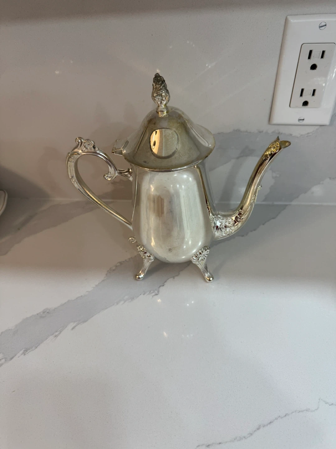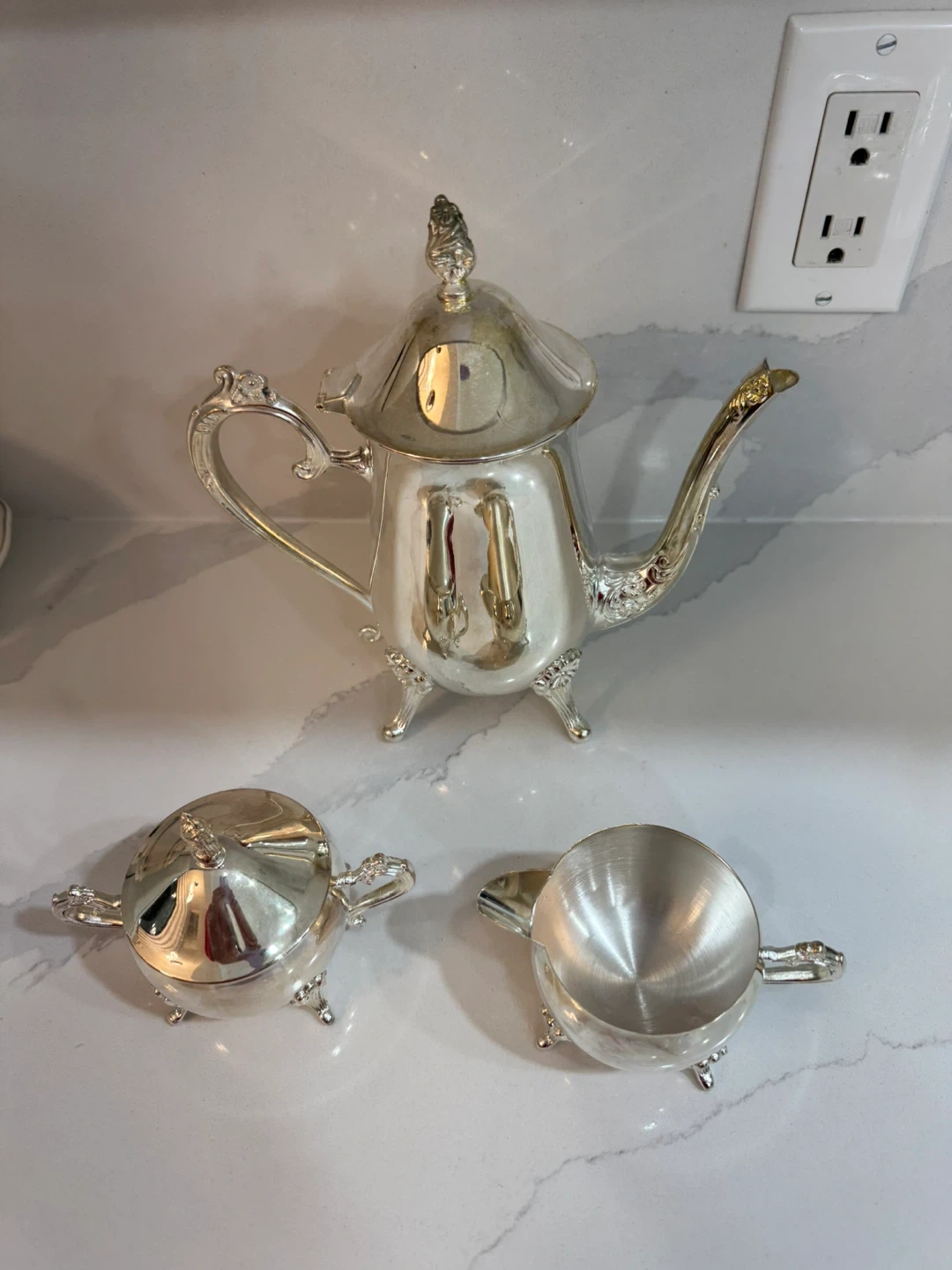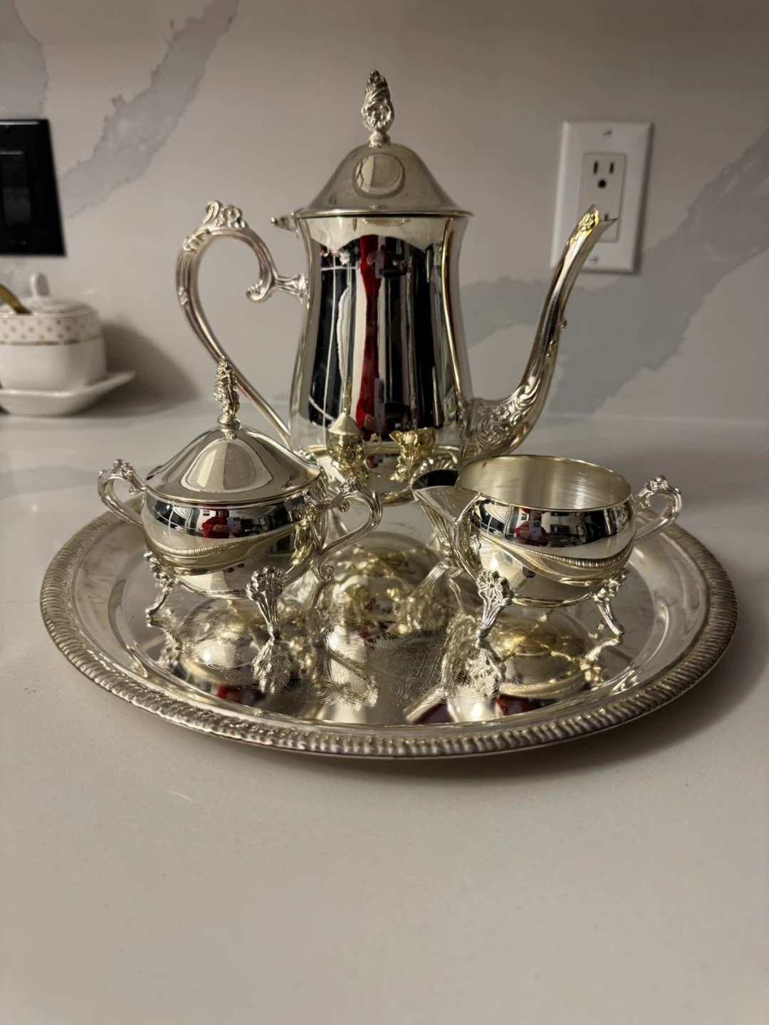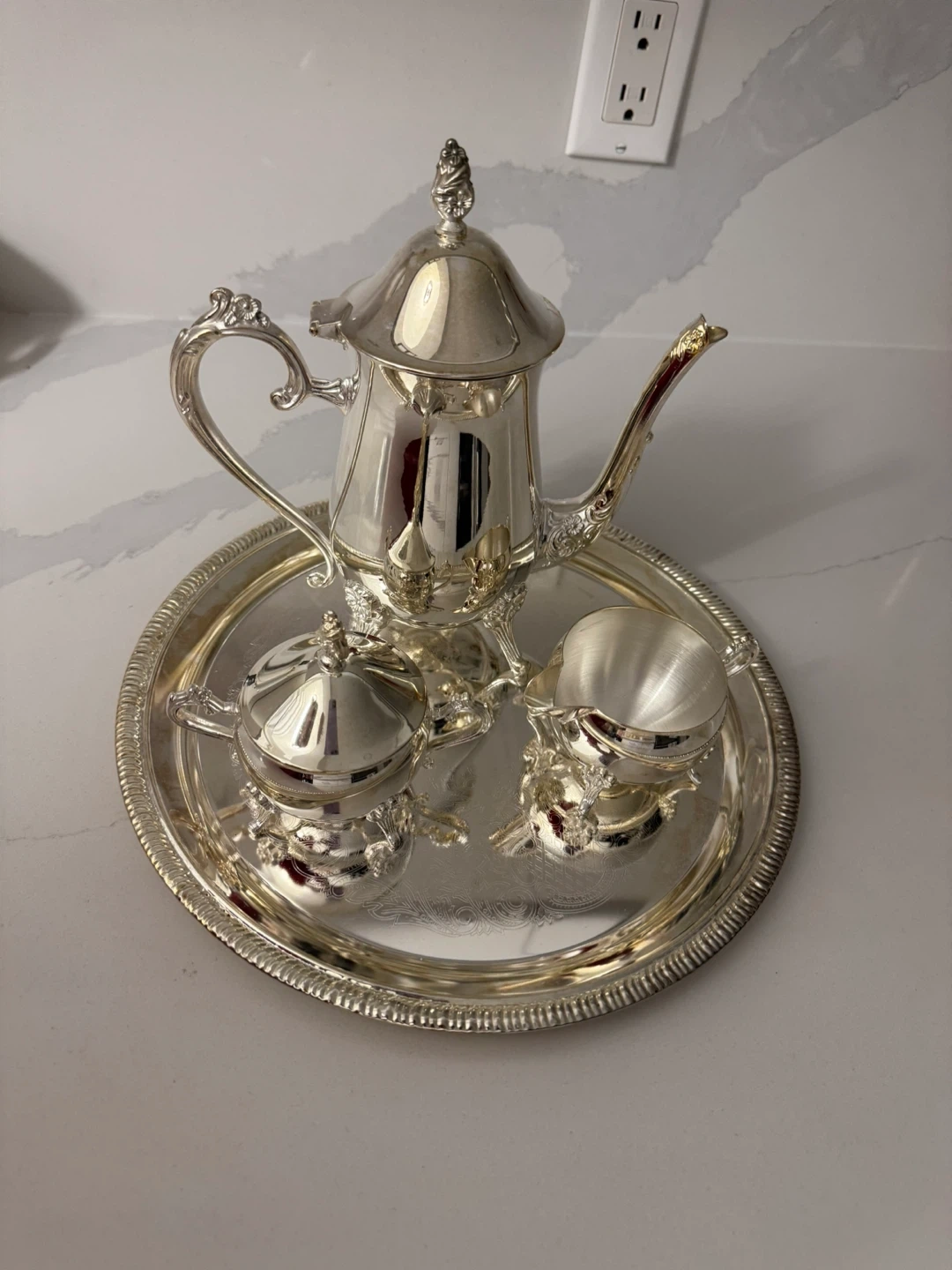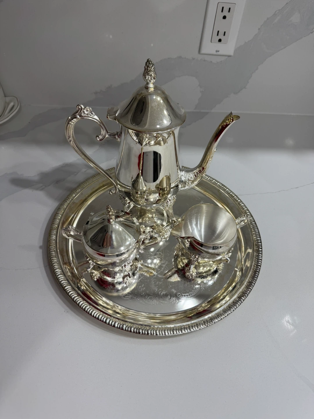 Four-piece silver-plated tea set or coffee set Includes a tea pot, creamer, sugar bowl with lid, and serving tray. Elegant design for serving beverages. It was stored in our storage room and never got the chance to be used.” Pick up at Steeles & Bathurst area.