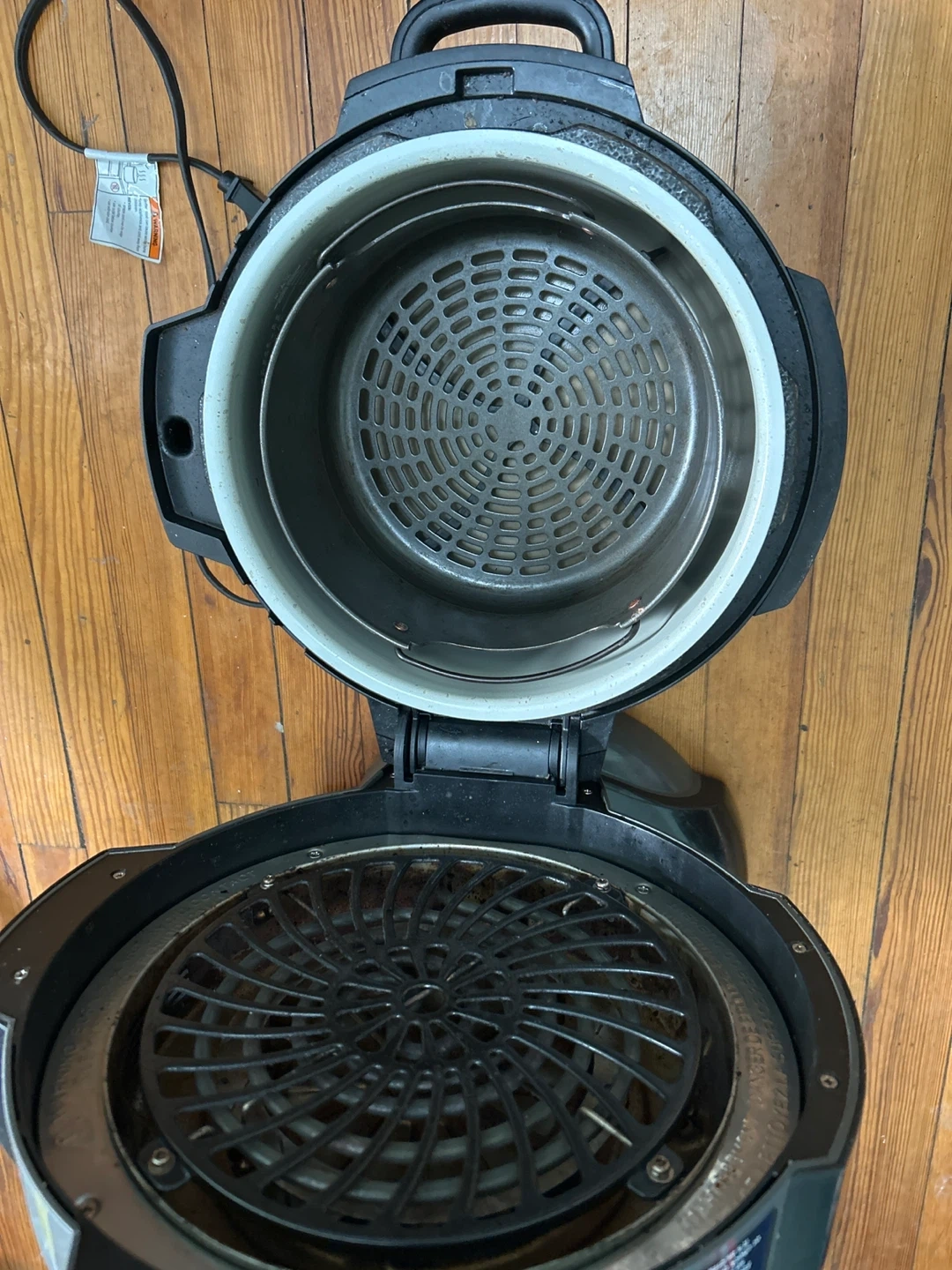 This is a Ninja Foodi multi-cooker with TenderCrisp technology. It offers pressure cooking, steam, slow cook, air crisp, bake/roast, broil, and keep warm functions. The unit has a digital display and control panel.