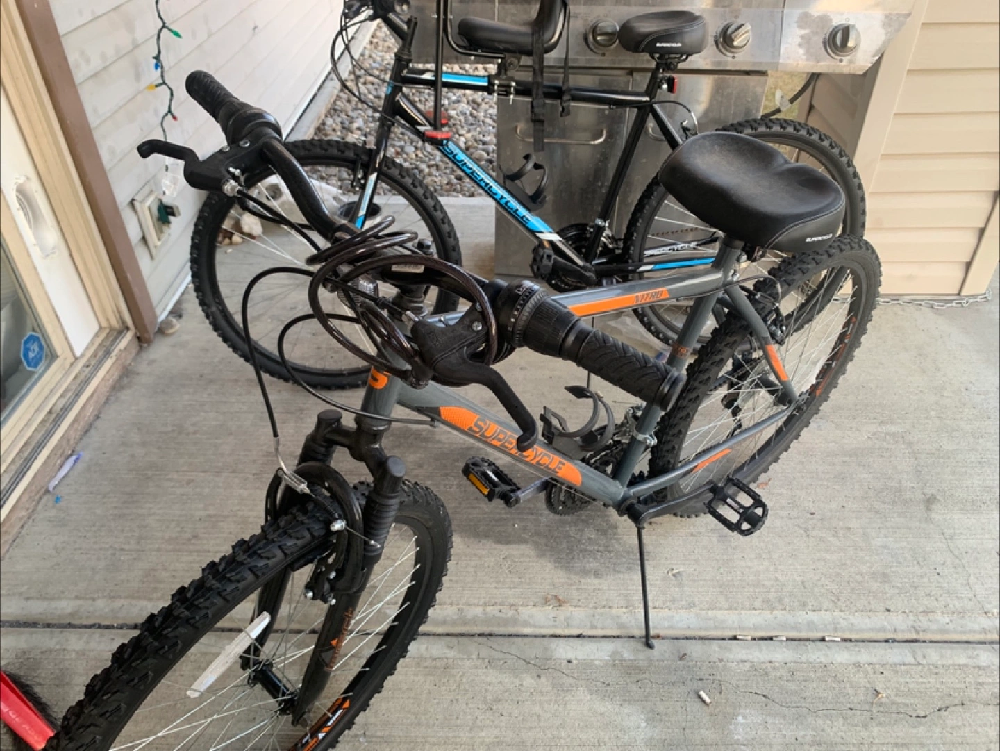 Grey and orange Supercycle Nitro mountain bike. It's a sturdy bike with knobby tires, perfect for trails or casual riding. It includes a water bottle cage. Brand new only rode a few times original seat included