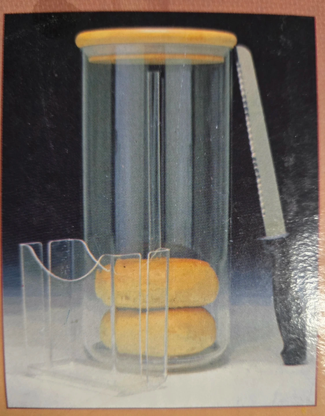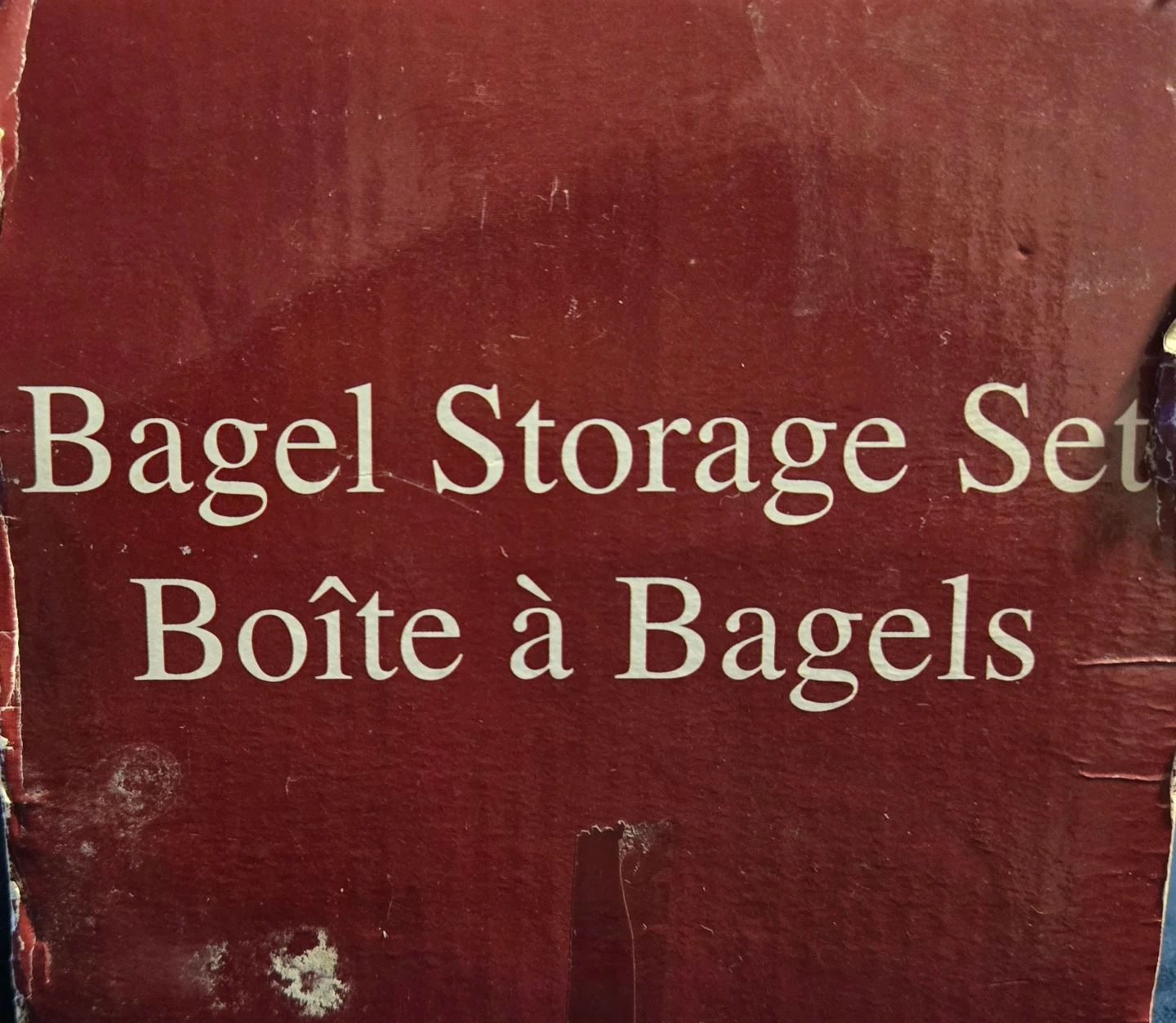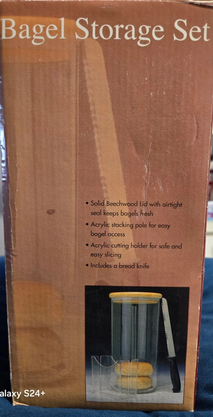 This bagel storage set features a solid Beechwood lid with an airtight seal that keeps bagels fresh. It includes an acrylic stacking pole for easy access and an acrylic cutting holder for safe slicing. A bread knife is also included!. Never been used
