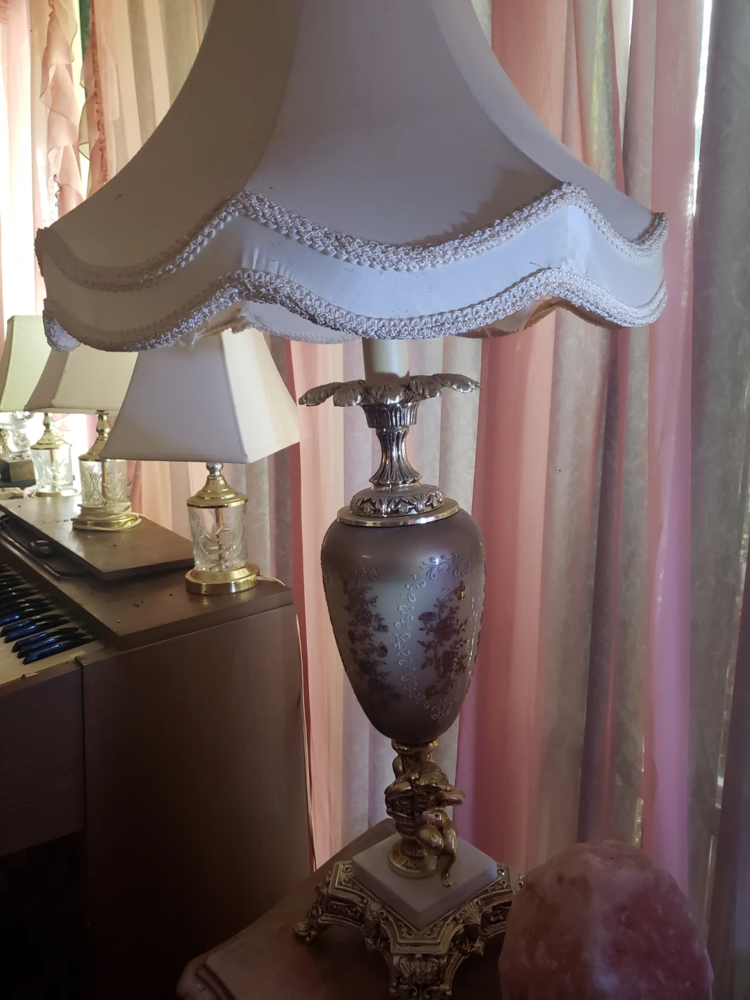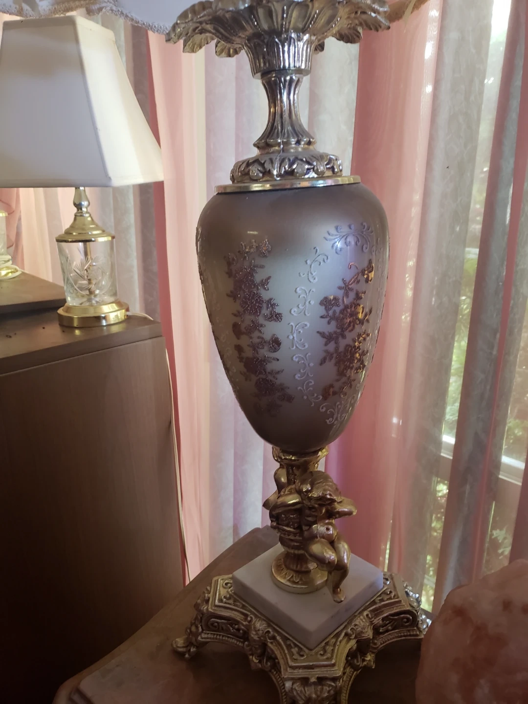 A beautiful vintage table lamp with a decorative urn-shaped base. The base is adorned with ornate gold detailing and a marble accent. The lampshade features a scalloped edge with trim. It's a lovely piece for any room!