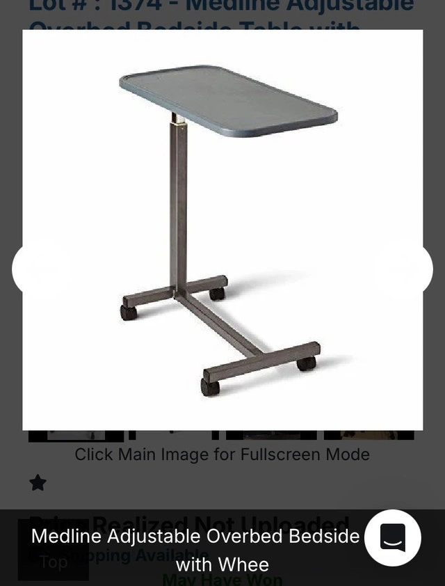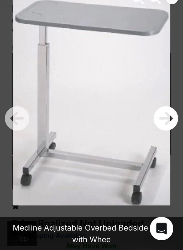 Brand new in box hospital bed table. Has wheels and goes over the bed for someone on bedrest who needs to eat a meal. Pickup: Eglington and Tomken in Mississauga. Condition: Grade A. This Medline adjustable overbed bedside table is great for hospital use or at home as a bed tray. The composite top is easy to clean and impervious to moisture. It's a smart alternative to wood, which can crack or peel. This convenient design easily adjusts from 30" to 47" with one hand. Constructed with a durable chrome base and two locking, two standard casters.