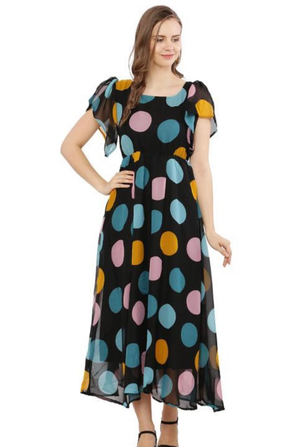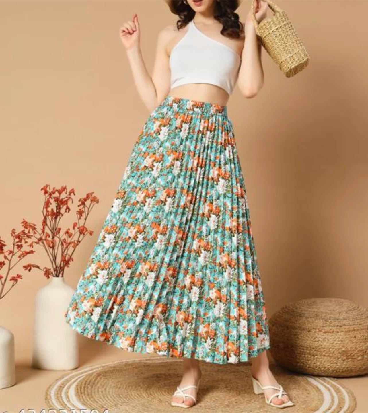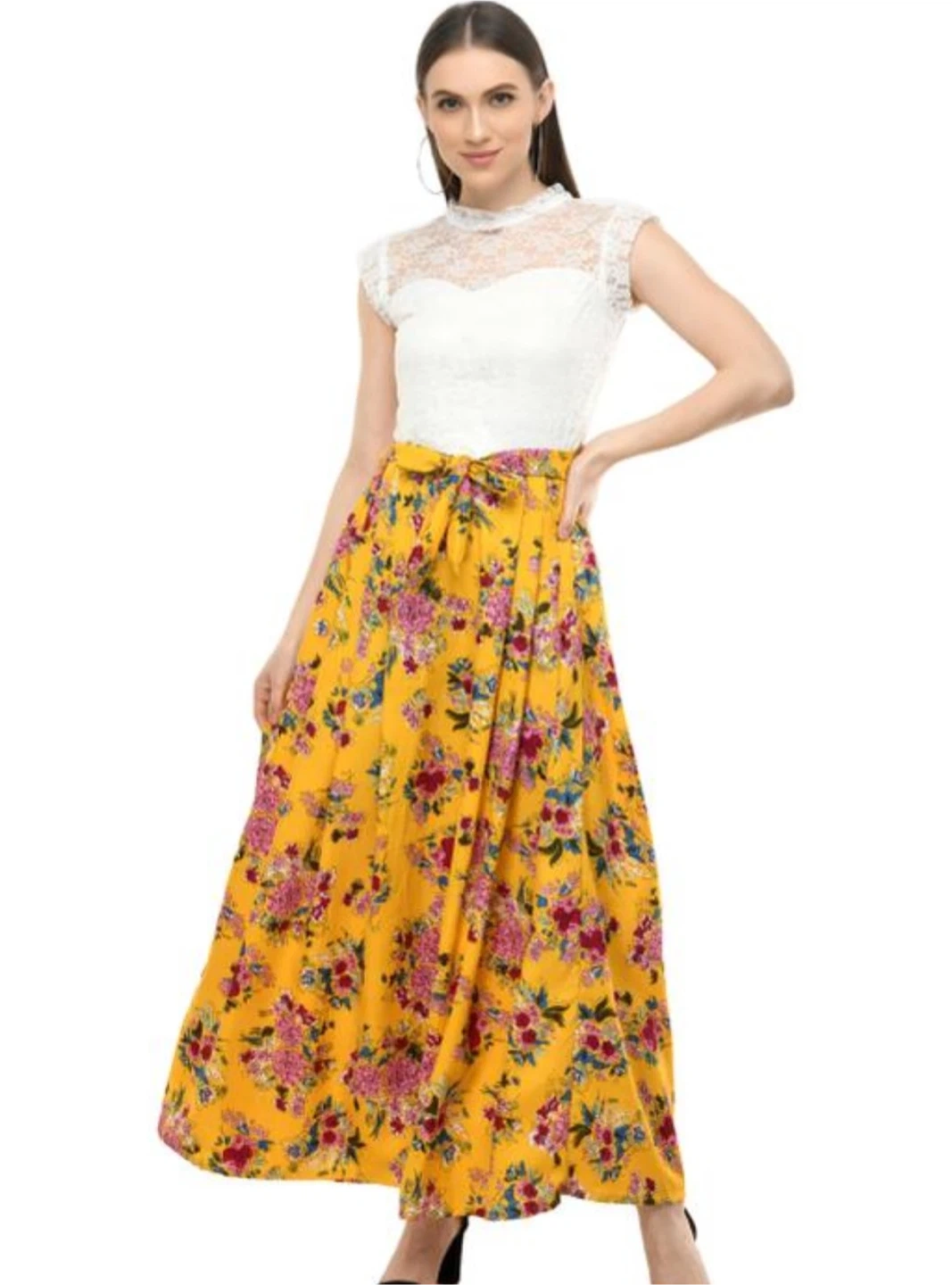 This is a flowy midi skirt with a vibrant yellow base and a colourful floral print. It features a tie waist and a pleated design. A lovely skirt for warmer days!