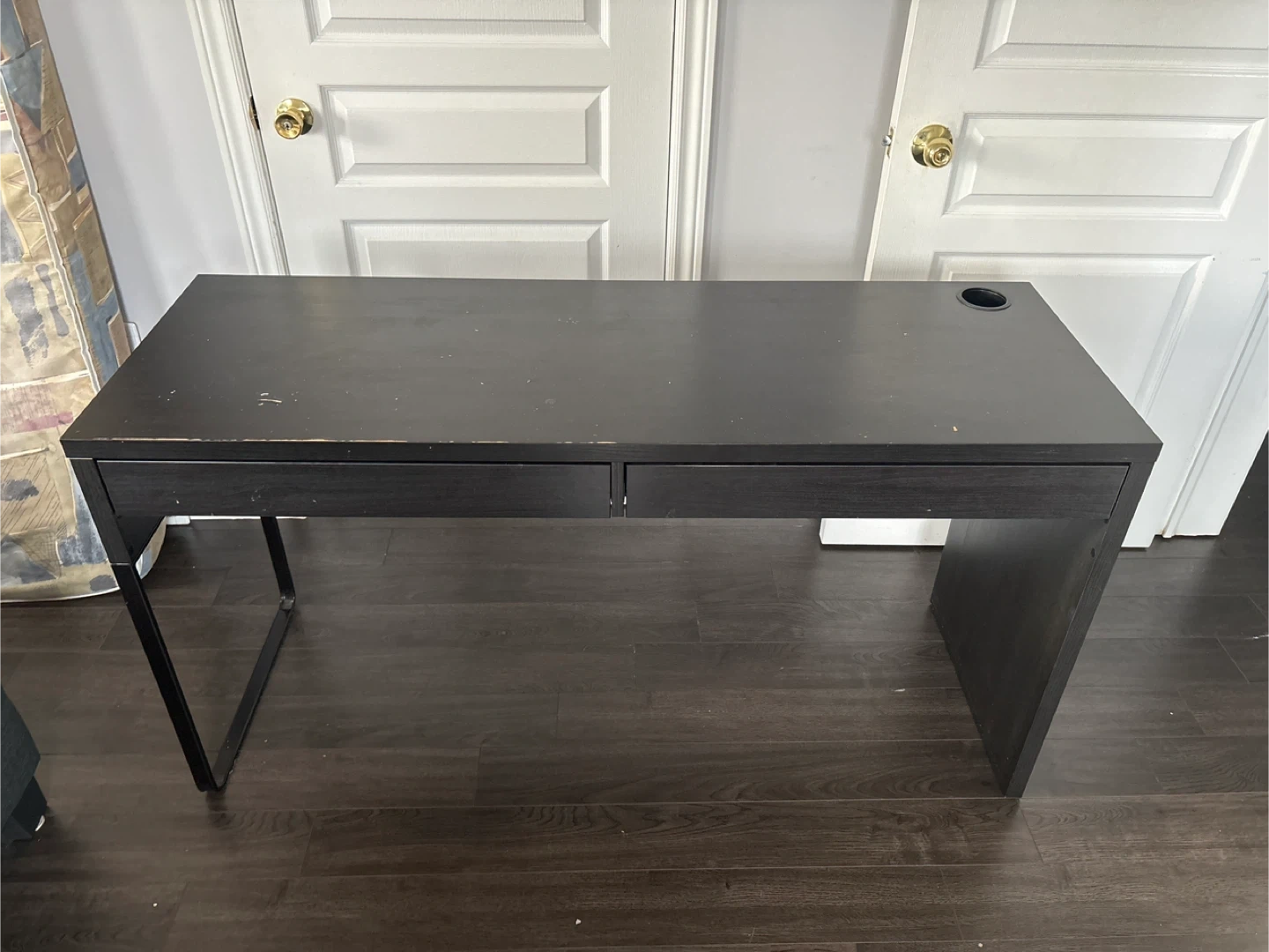 Selling a simple black desk, perfect for a home office or student space. It has a couple of drawers for storage. It's in good condition and ready for a new home!