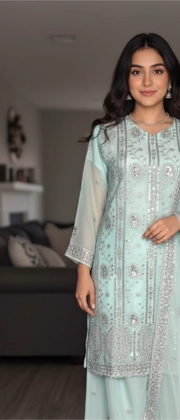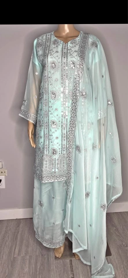 Discover the elegance of our sea green with silver zari and sequence chiffon dress, perfect for parties, weddings, or any formal events. Fabric: Chiffon. Shoulders: 15". Chest: 21". Hips: 22". Shirt length: 36". Sleeves length: 19". Palazzo length: 38". Color: Sea green. We never sell worn clothes. Pickup near 126 and 72 Ave Surrey BC.