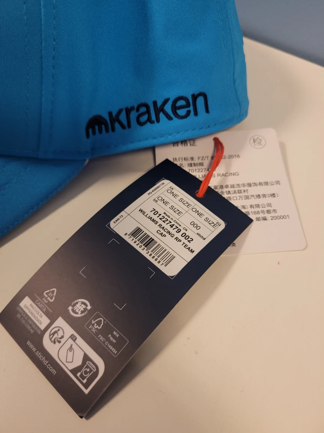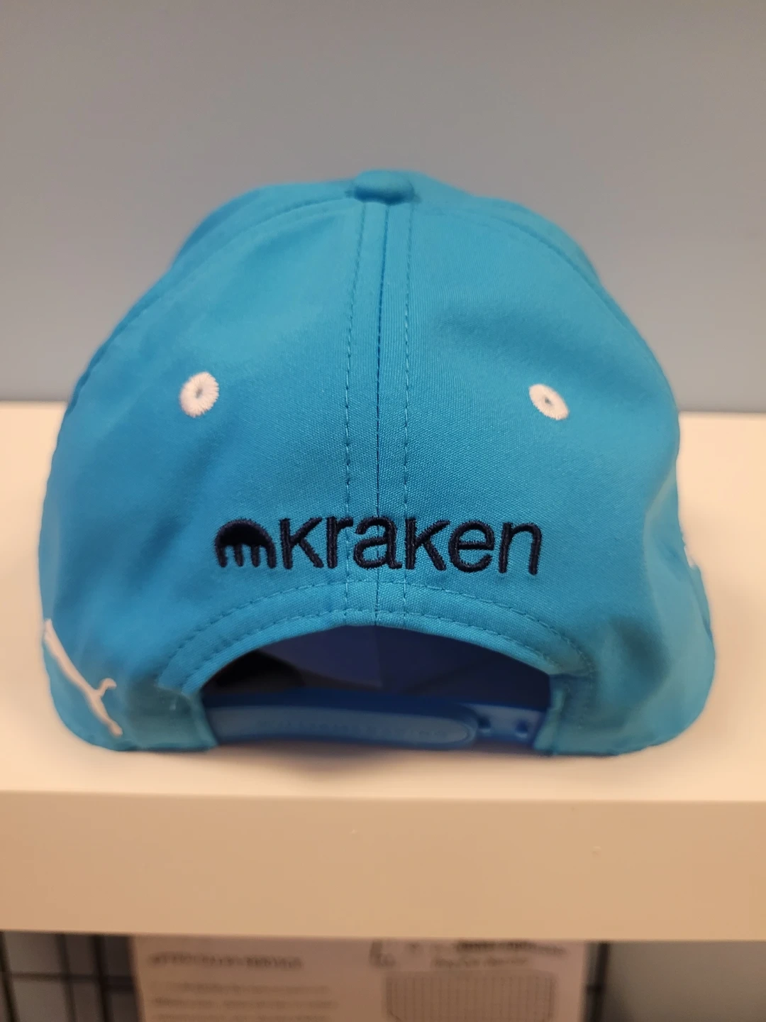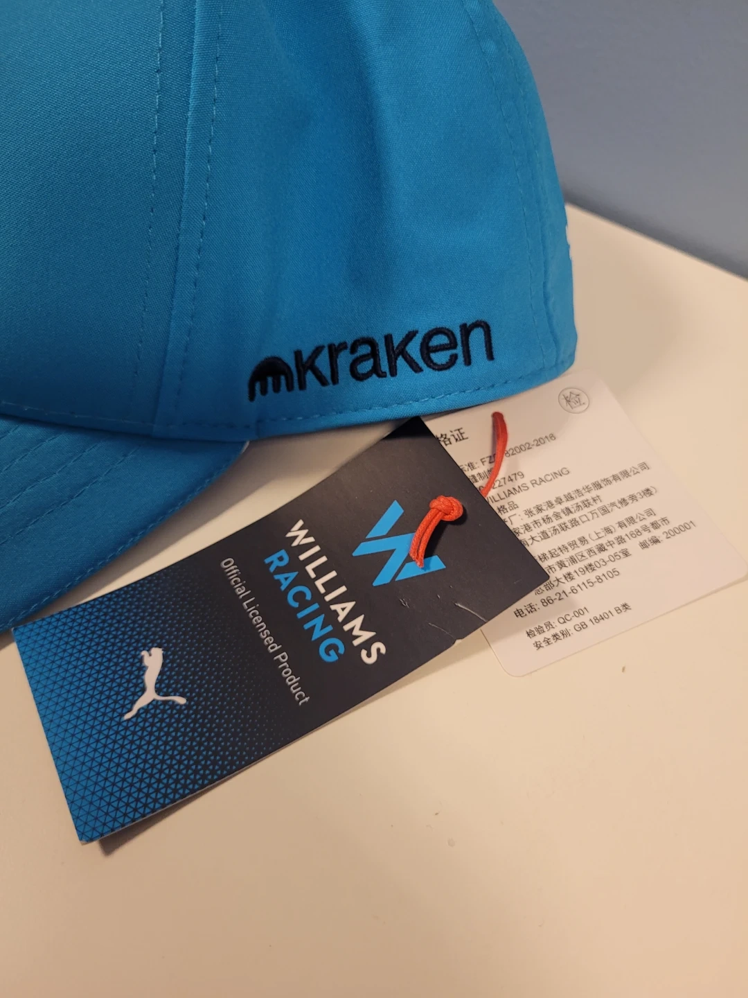 Here's a new Williams Racing hat in a vibrant blue colour with Puma, Komatsu & Kraken logo's as well.