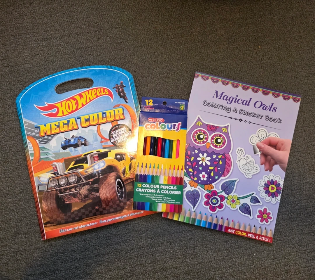 This bundle includes a Hot Wheels Mega Color coloring and sticker book and a Magical Owls coloring and sticker book.