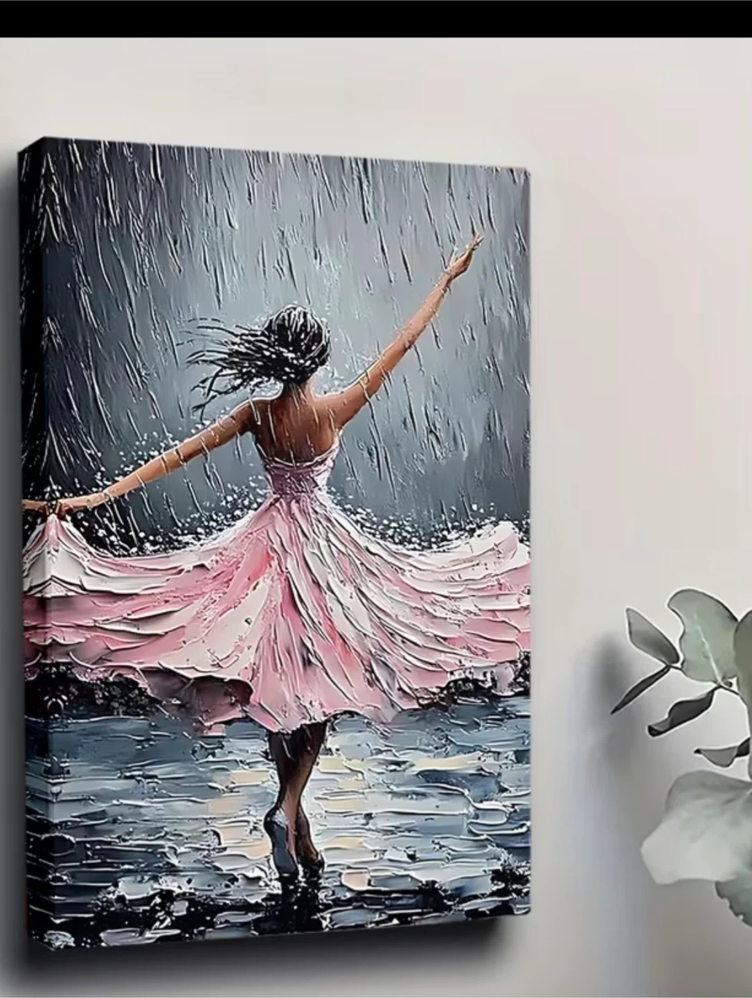 A beautiful textured painting on canvas depicting a woman in a pink dress dancing in the rain. This piece features a thick impasto style, creating a vibrant, three-dimensional effect. It's perfect for adding a touch of elegance and drama to any room.