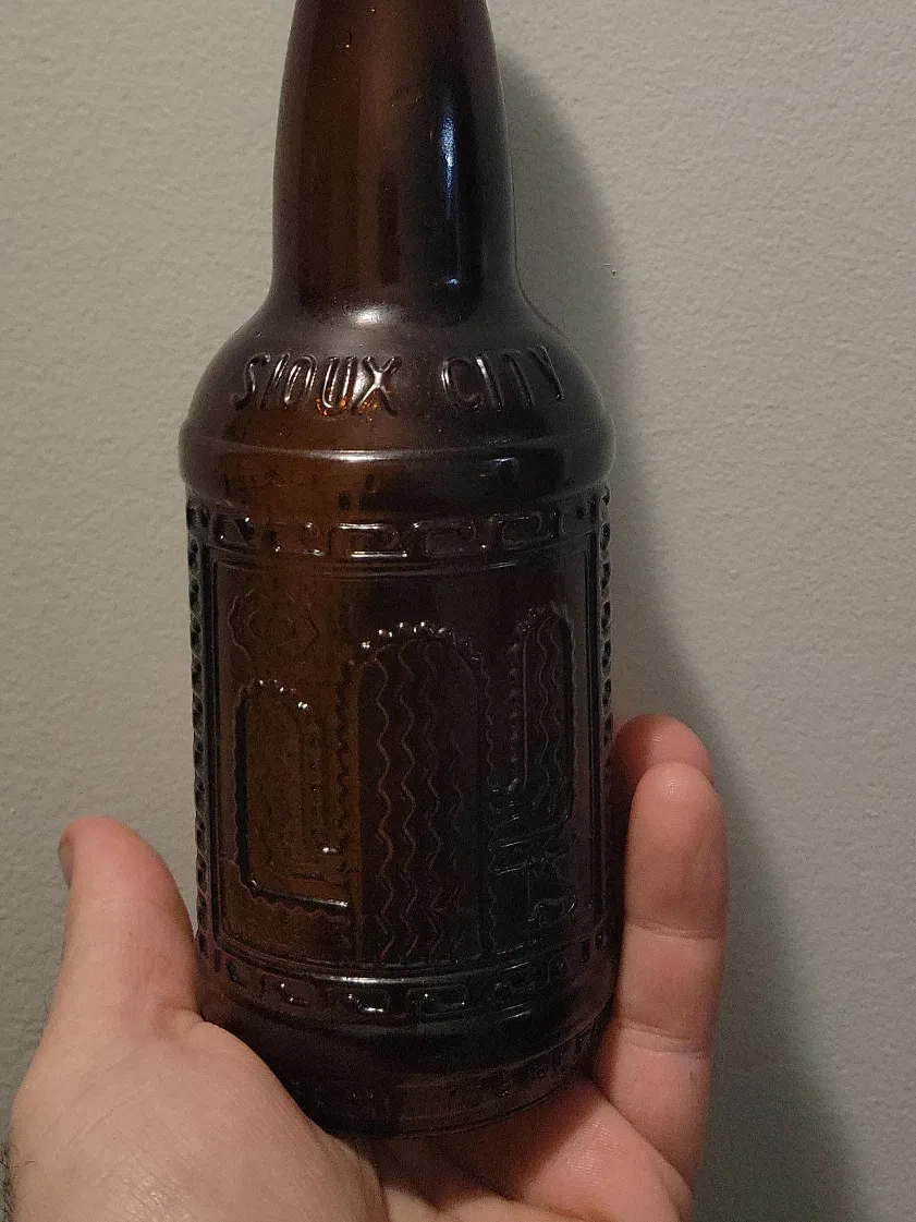 Selling a brown Sioux City soda bottle. It has a unique design with what appears to be a cactus and other southwestern motifs embossed on the glass. Great for collectors or anyone who loves vintage bottles!