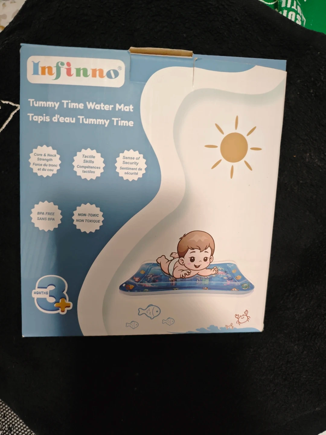 This is an Infinno Tummy Time Water Mat. It's BPA-free and non-toxic. It helps develop core and neck strength. Suitable for ages 3 months and up!