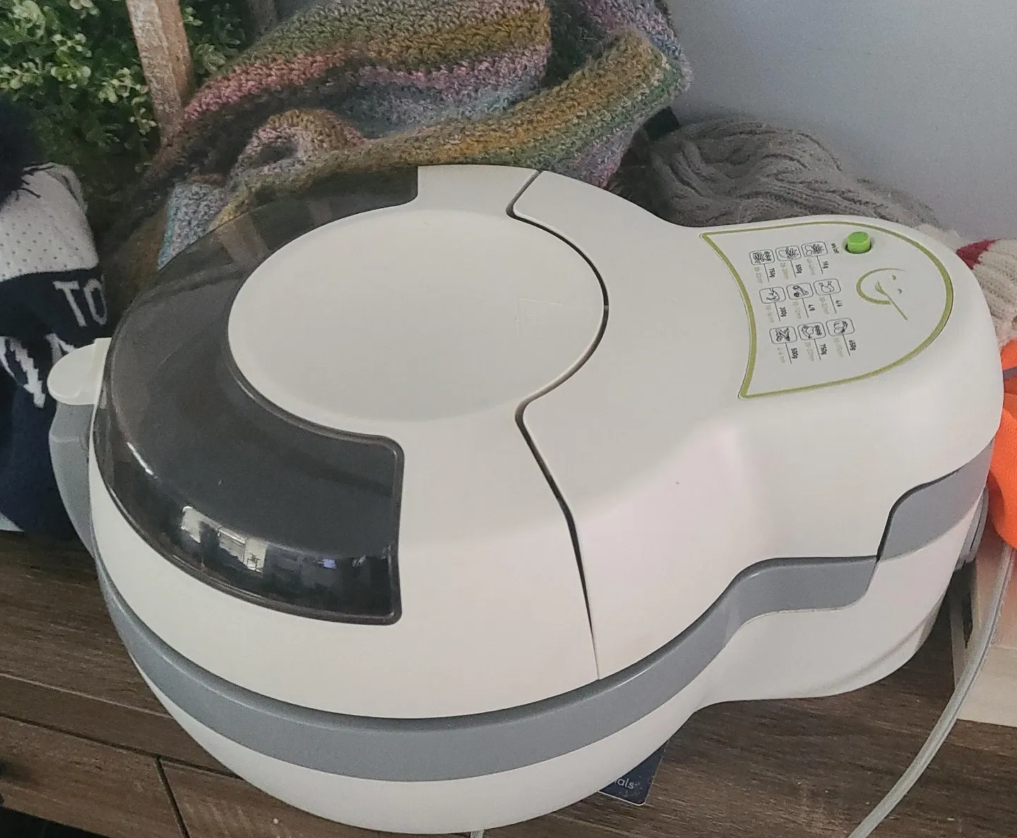 White electric air fryer. It's a kitchen appliance for quick cooking. Great for making fries or chicken wings!