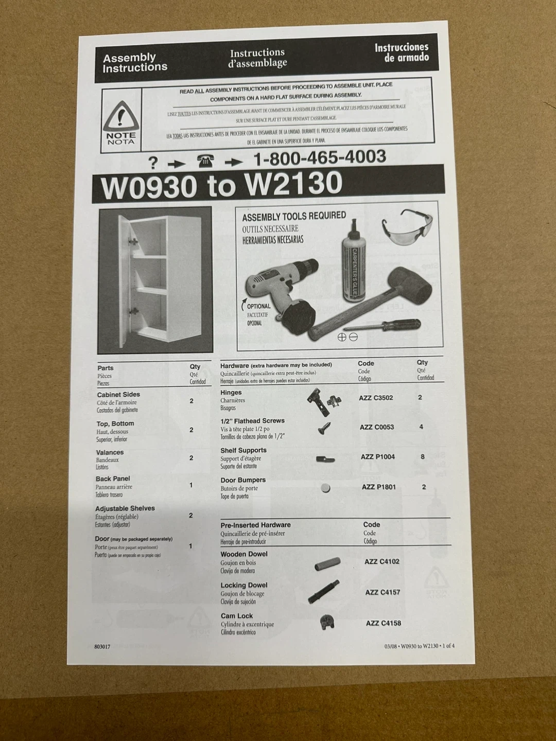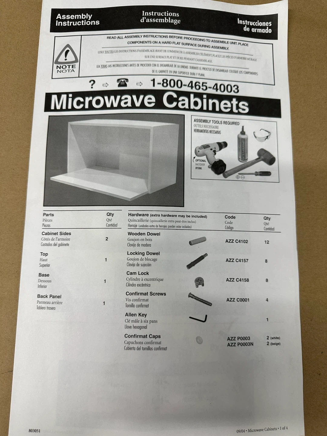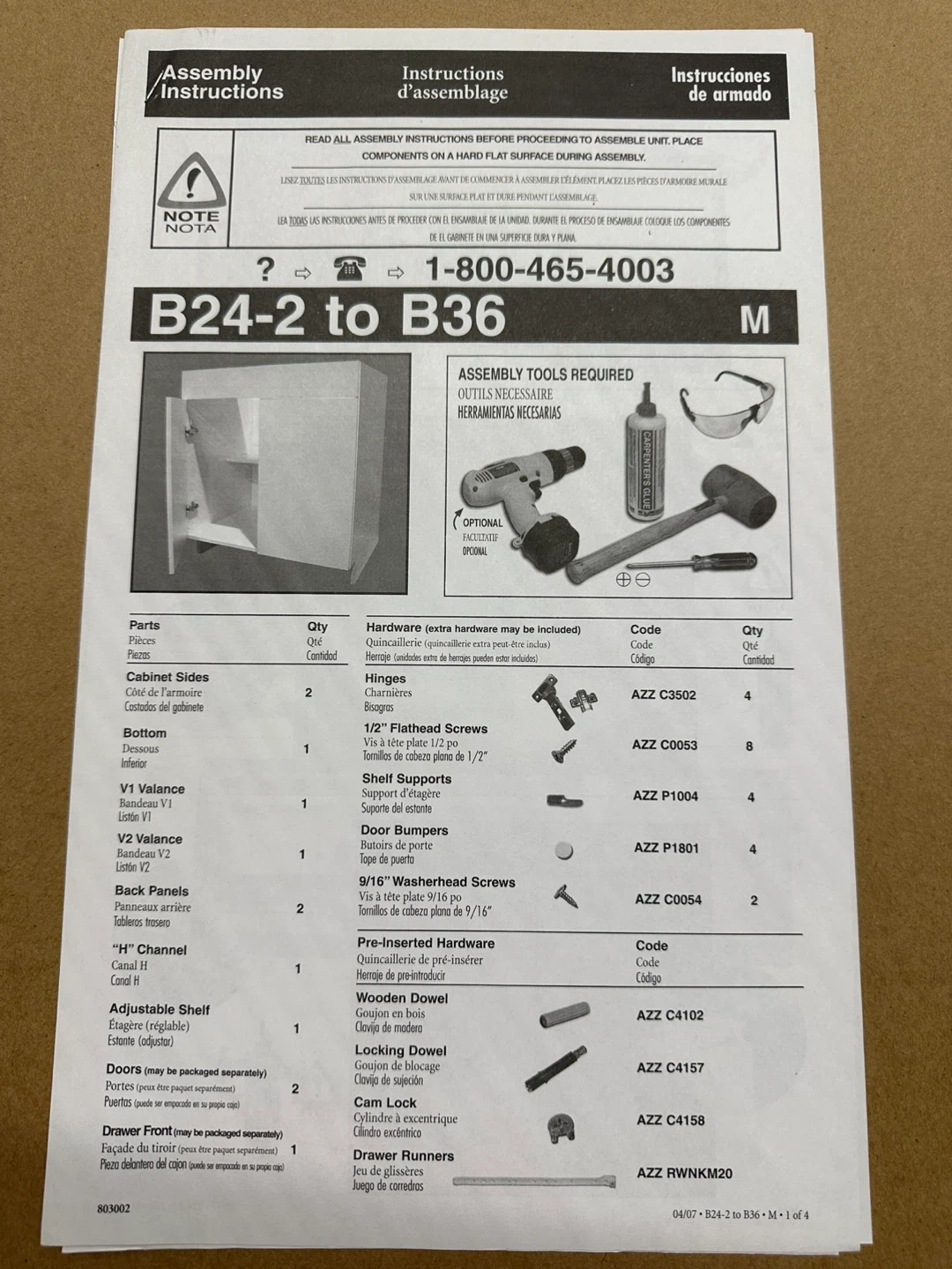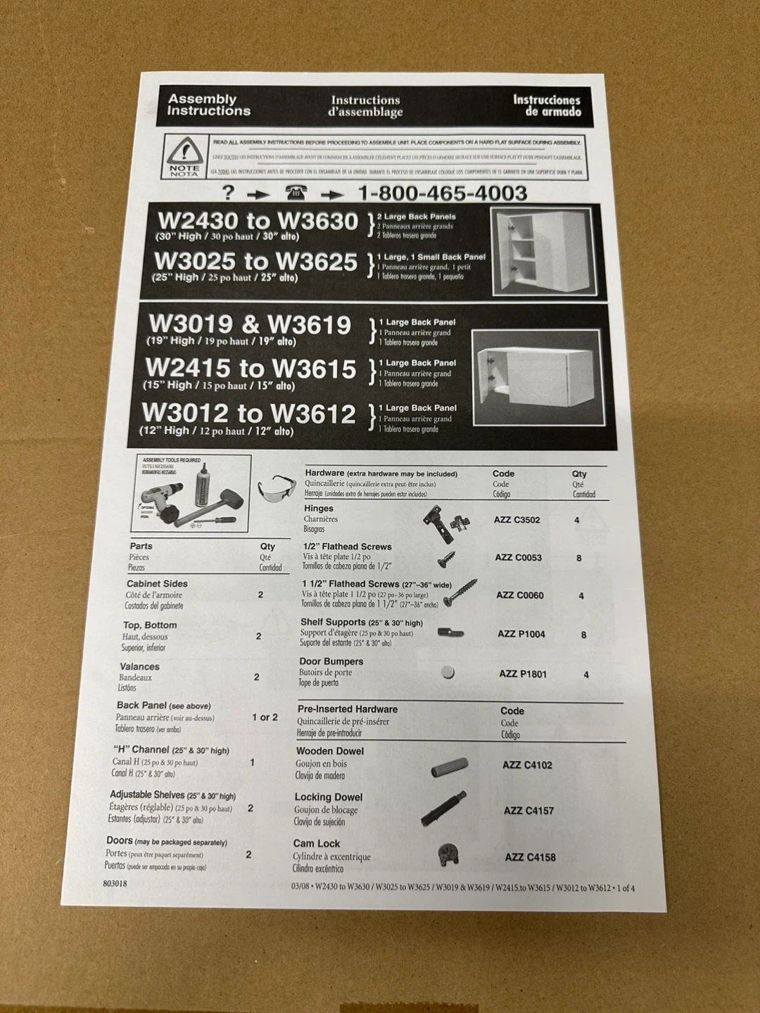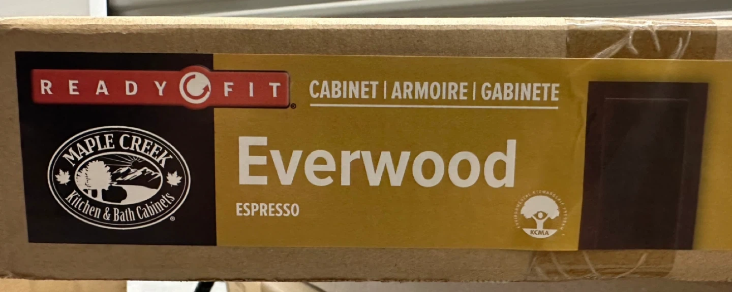 Maple Creek Everwood kitchen cabinets, espresso color, still in original packaging. Purchased for a project I never got around to. 6 Cabinets total - 3’ for base, 7’ for upper - Front page of assembly instructions in photos for a visual. 1 x 36” base with doors/drawer 1 x 24” x 15” microwave cabinet 2 x 24” x 15” wall cabinet 13” D 2 x 12” x 30” wall open shelf cabinet (no door)