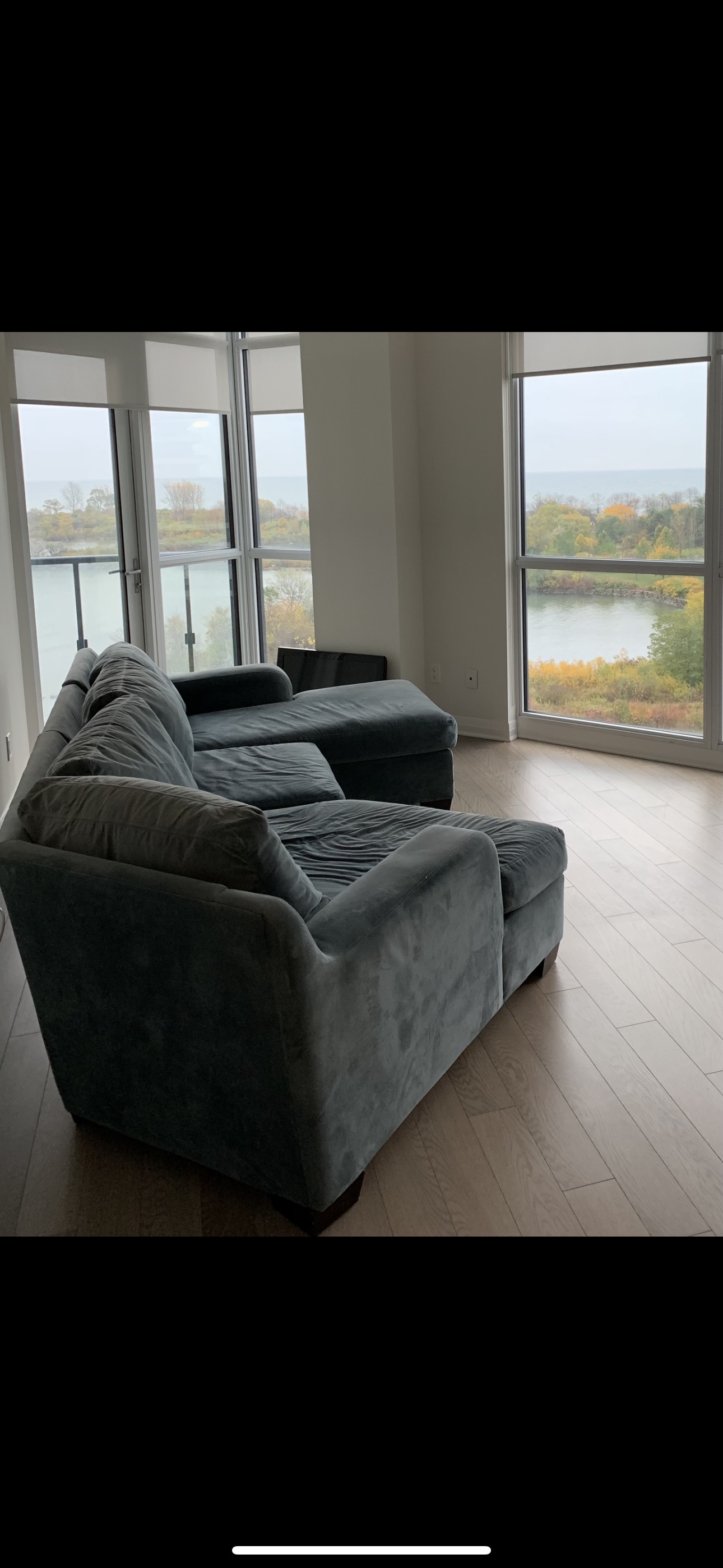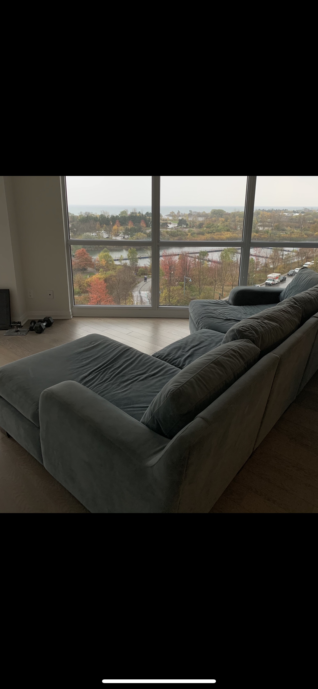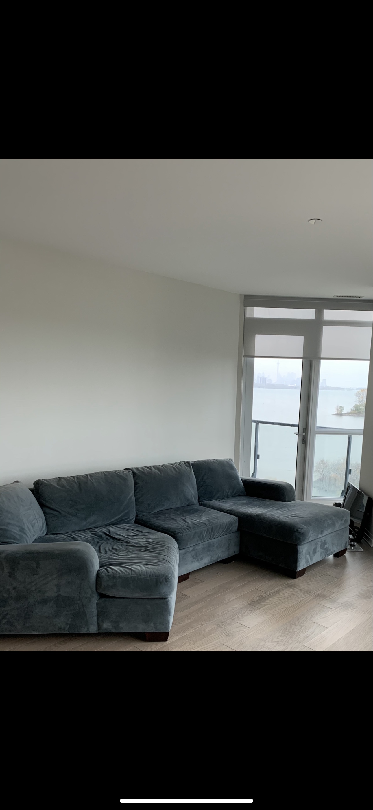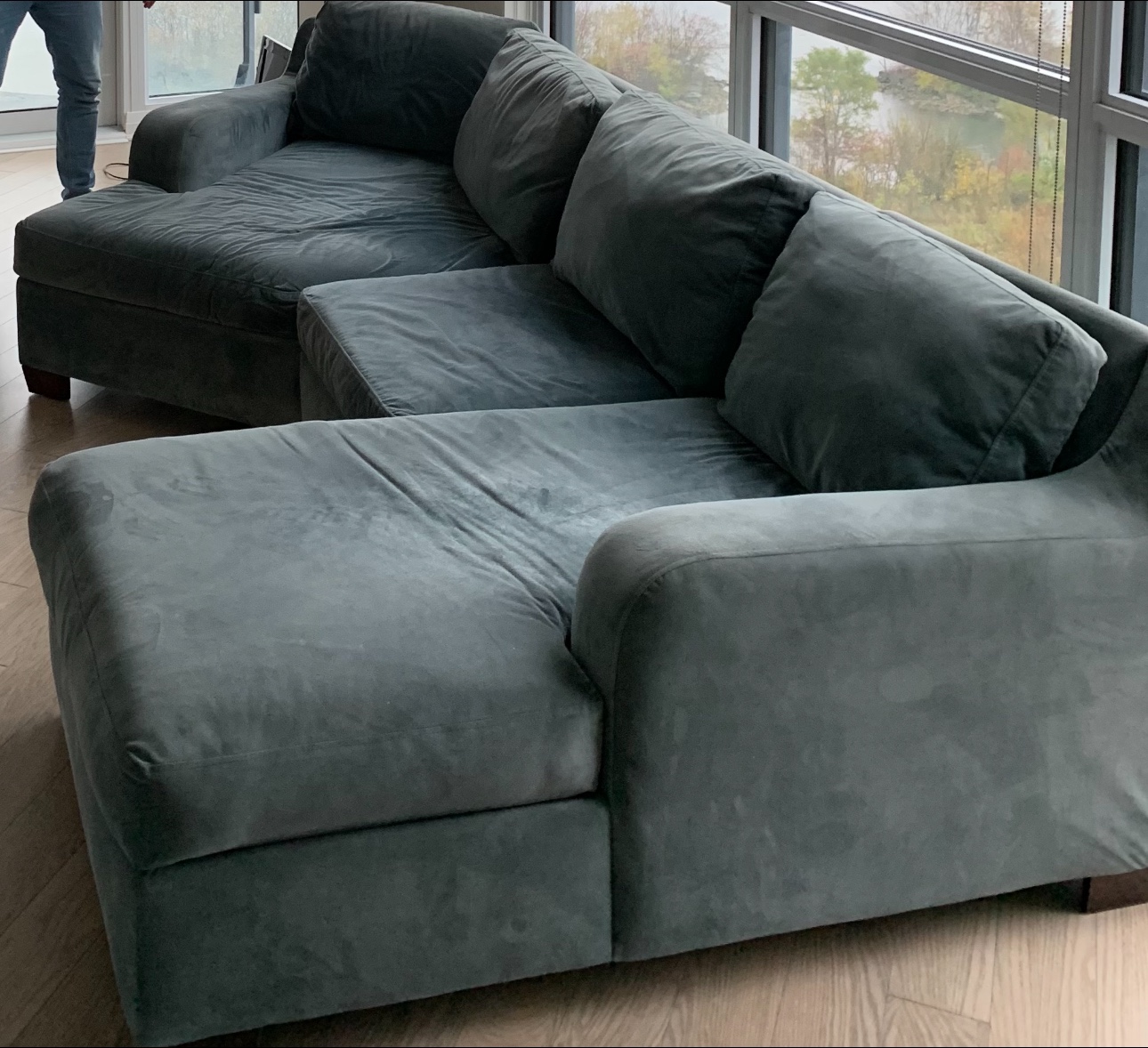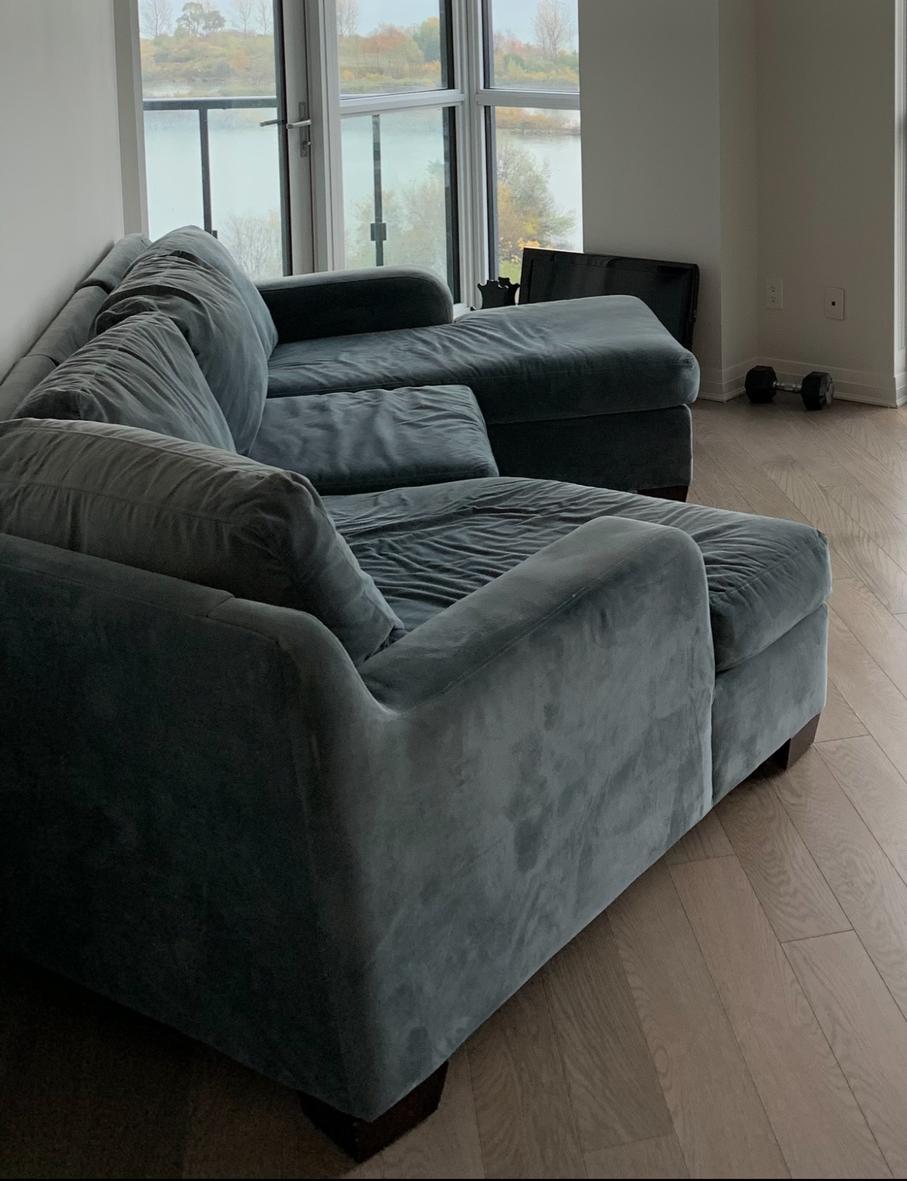 10Large sectional very comfortable velour material couch. 11 feet length by 5 feet 3 inches on the longest part of the lounge seat on the corner part of the seat it’s 5 feet 3 feet 6 inches on middle part of the couch