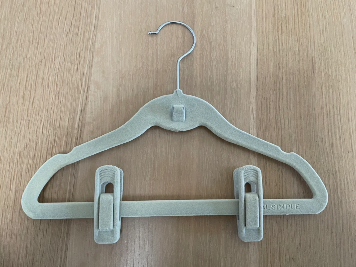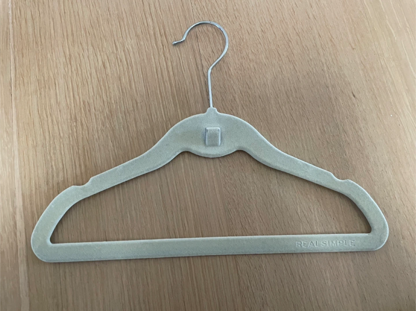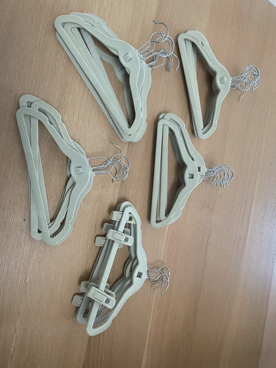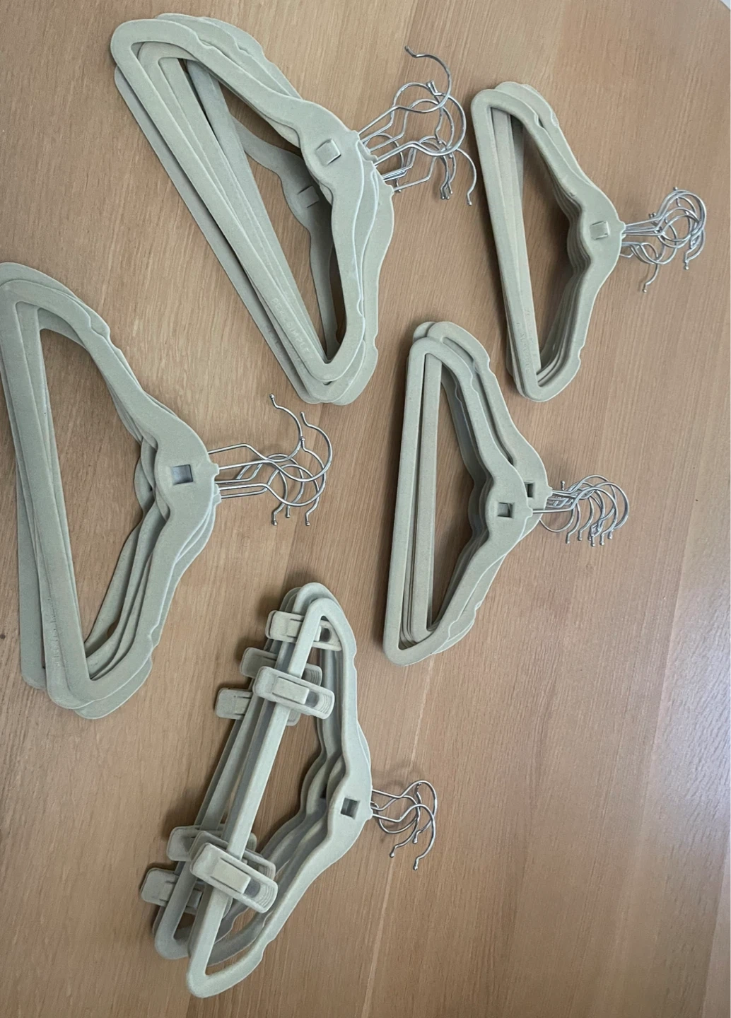 Selling a set of five Real Simple clothes hangers! They're in great shape and ready to help organize your closet. The hangers are a light beige colour and have a velvety texture, which helps keep clothes from slipping off. Each hanger also features clips, perfect for skirts or pants! Pack of 40 hangers!
