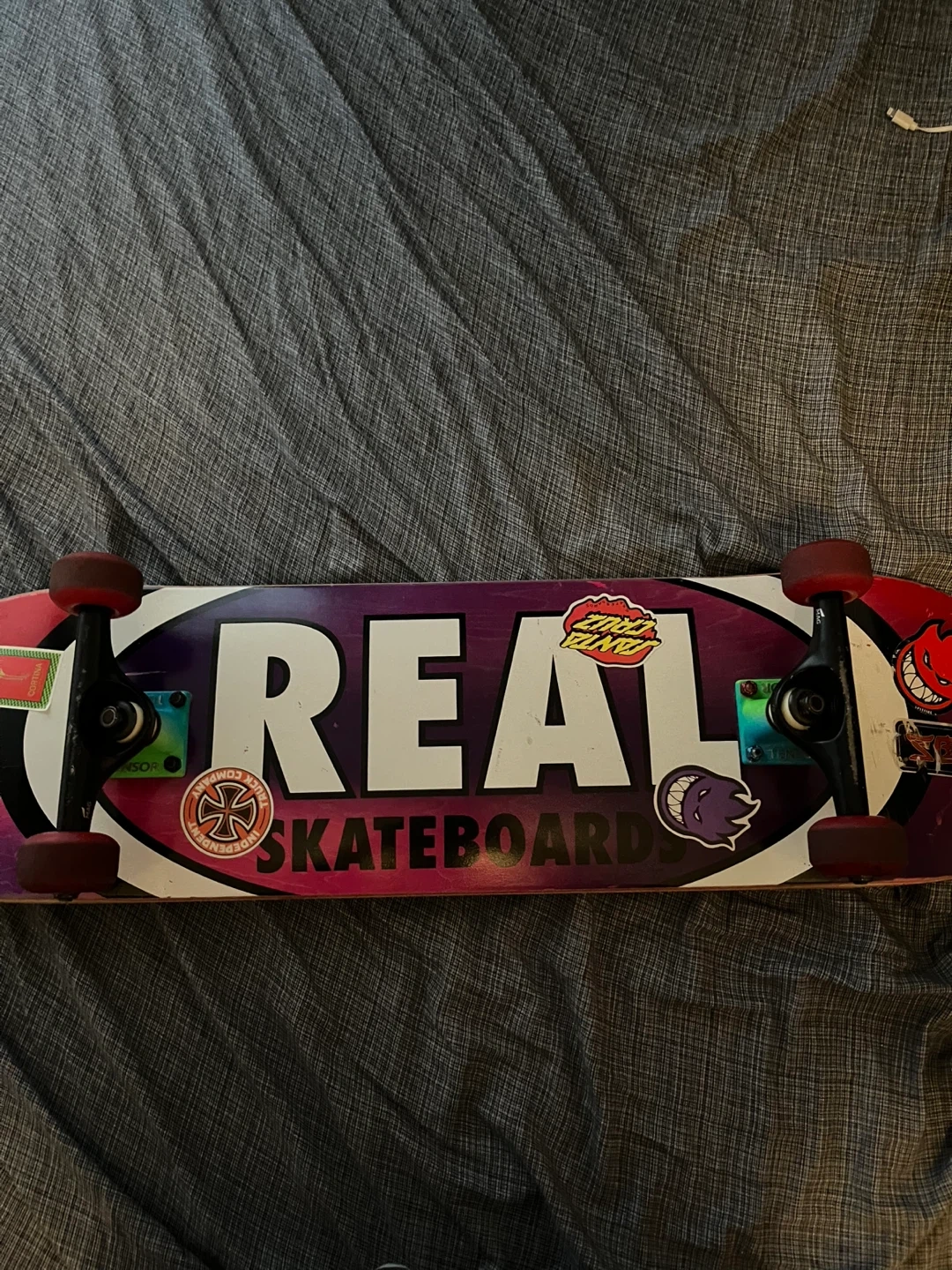 Selling a used REAL skateboard that's ready to ride! It comes with: - REAL skateboard deck - Spitfire wheels - Independent trucks Has a few stickers to give it some personality. Great for learning or experienced skaters
