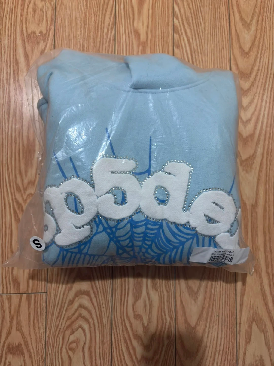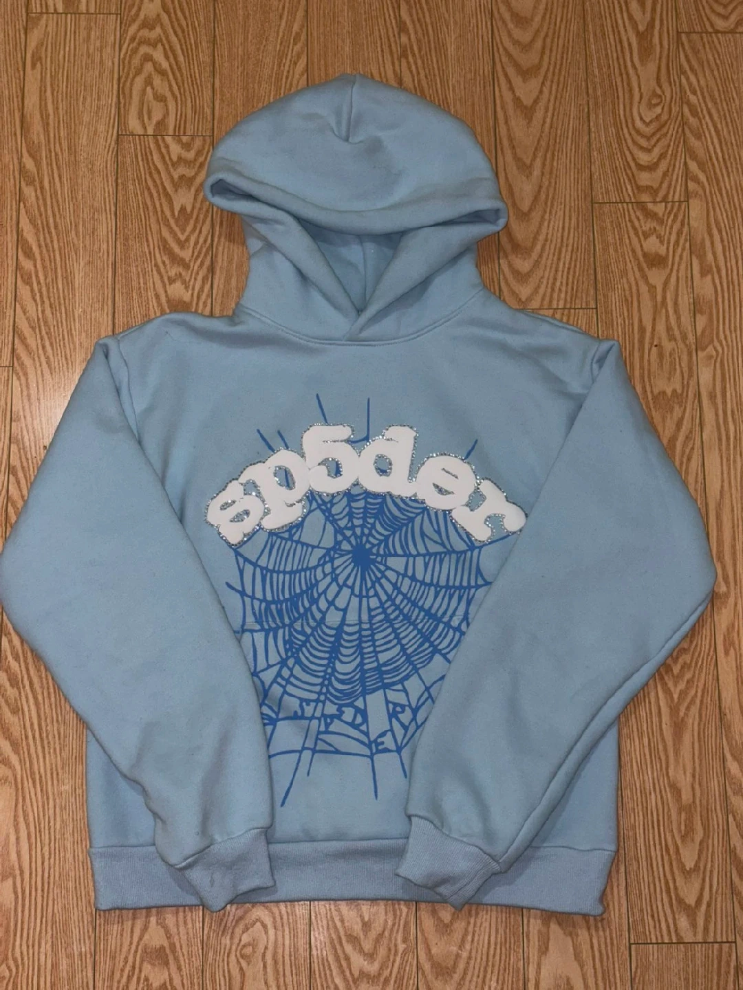 Selling a light blue Sp5der hoodie in size small. It's in great condition and comes in its original packaging! This product is real and passes all Stockx verifications.