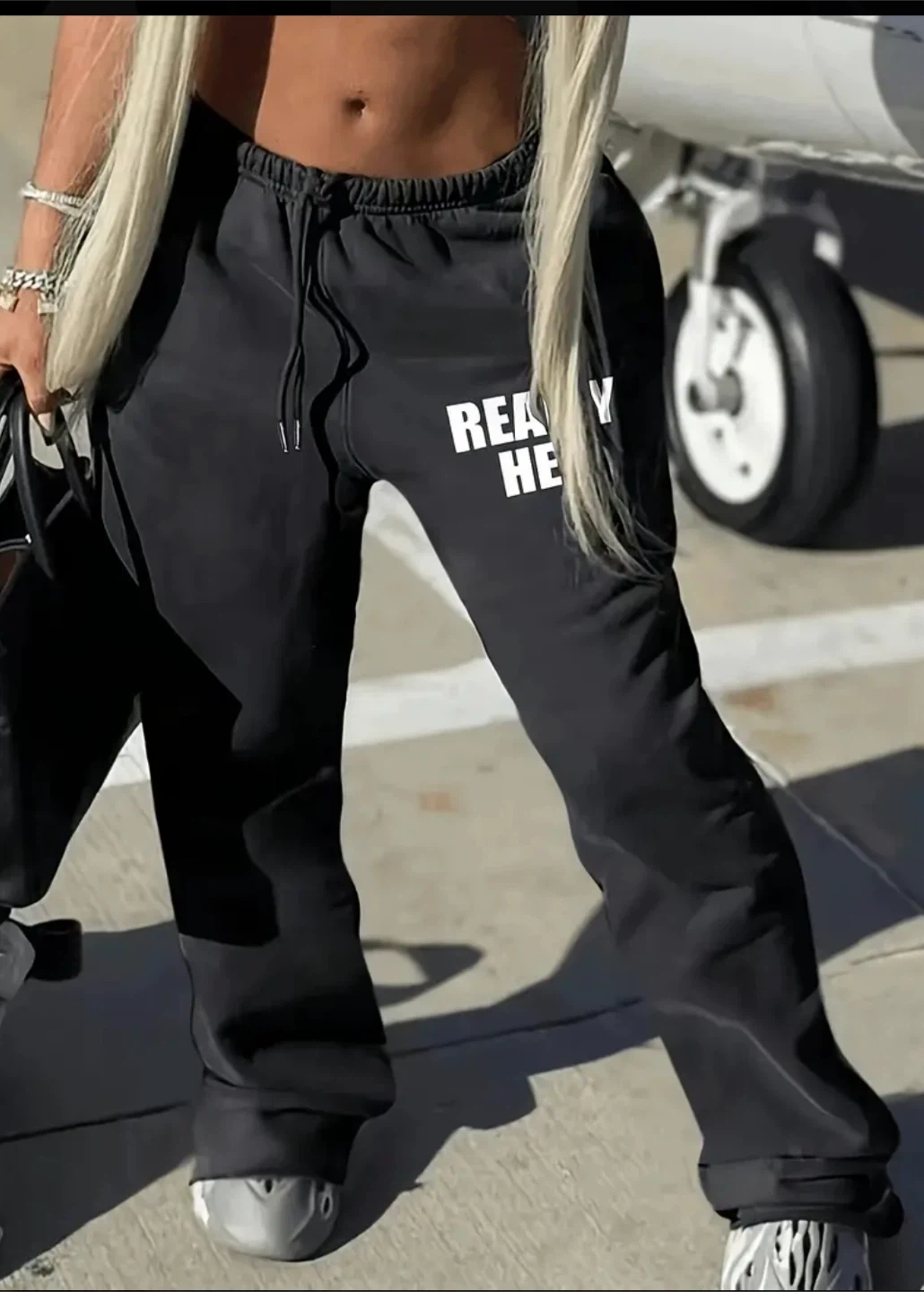 58These are black sweatpants with a drawstring. They have the words 'REALLY HER' printed on the right leg.