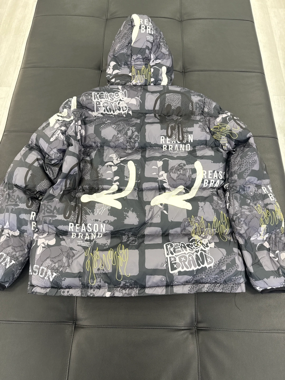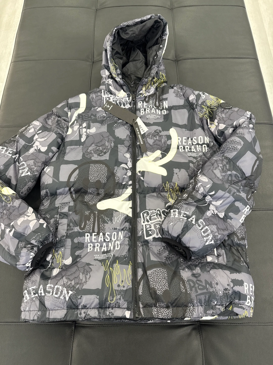 Grey and black puffer jacket. All-over print. Hooded. Zipper closure.