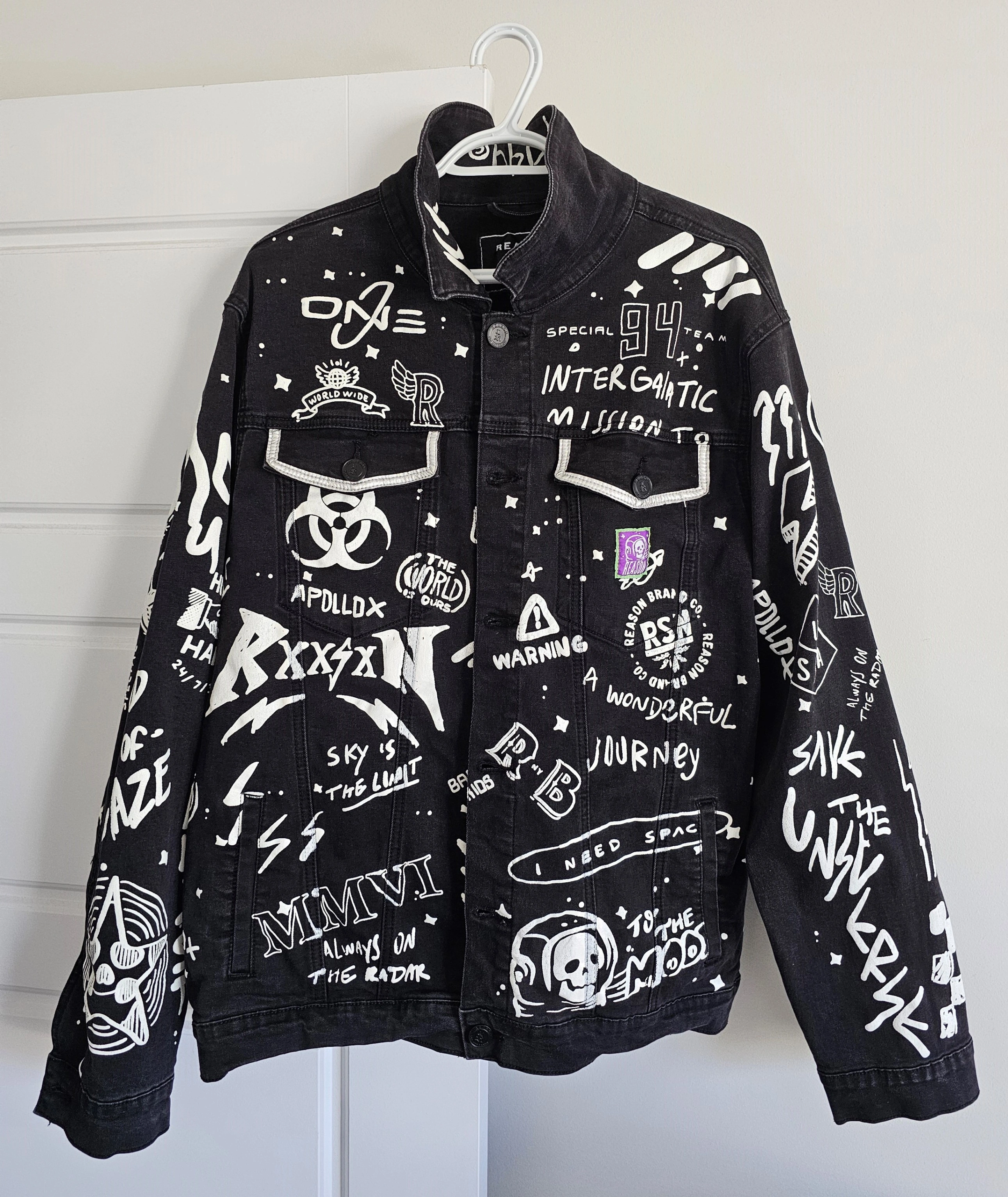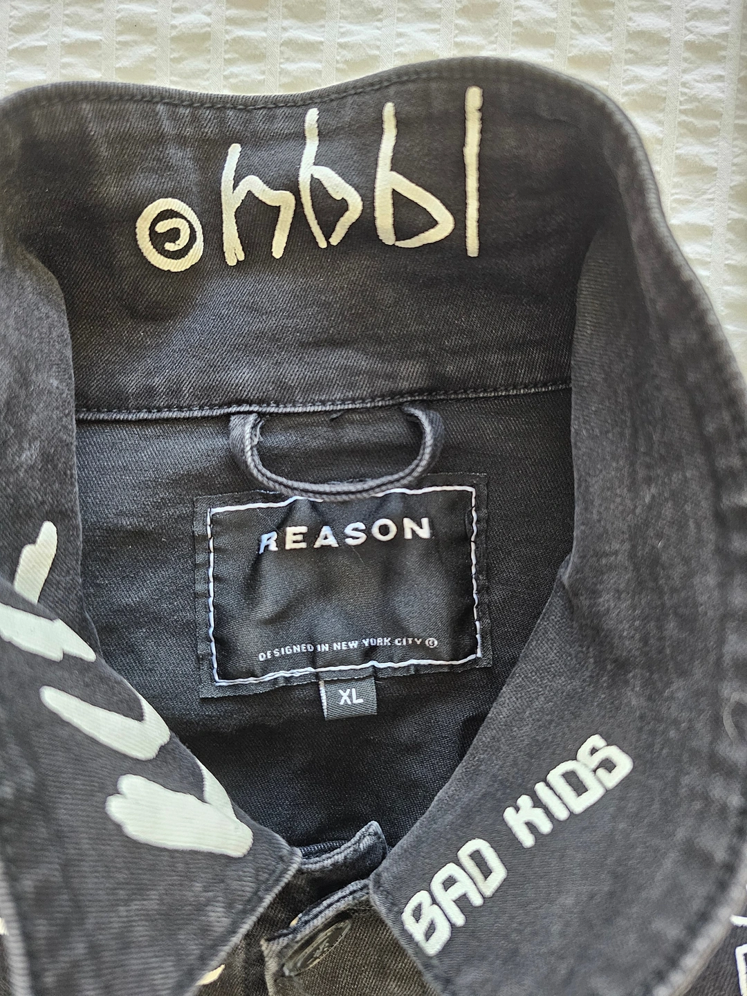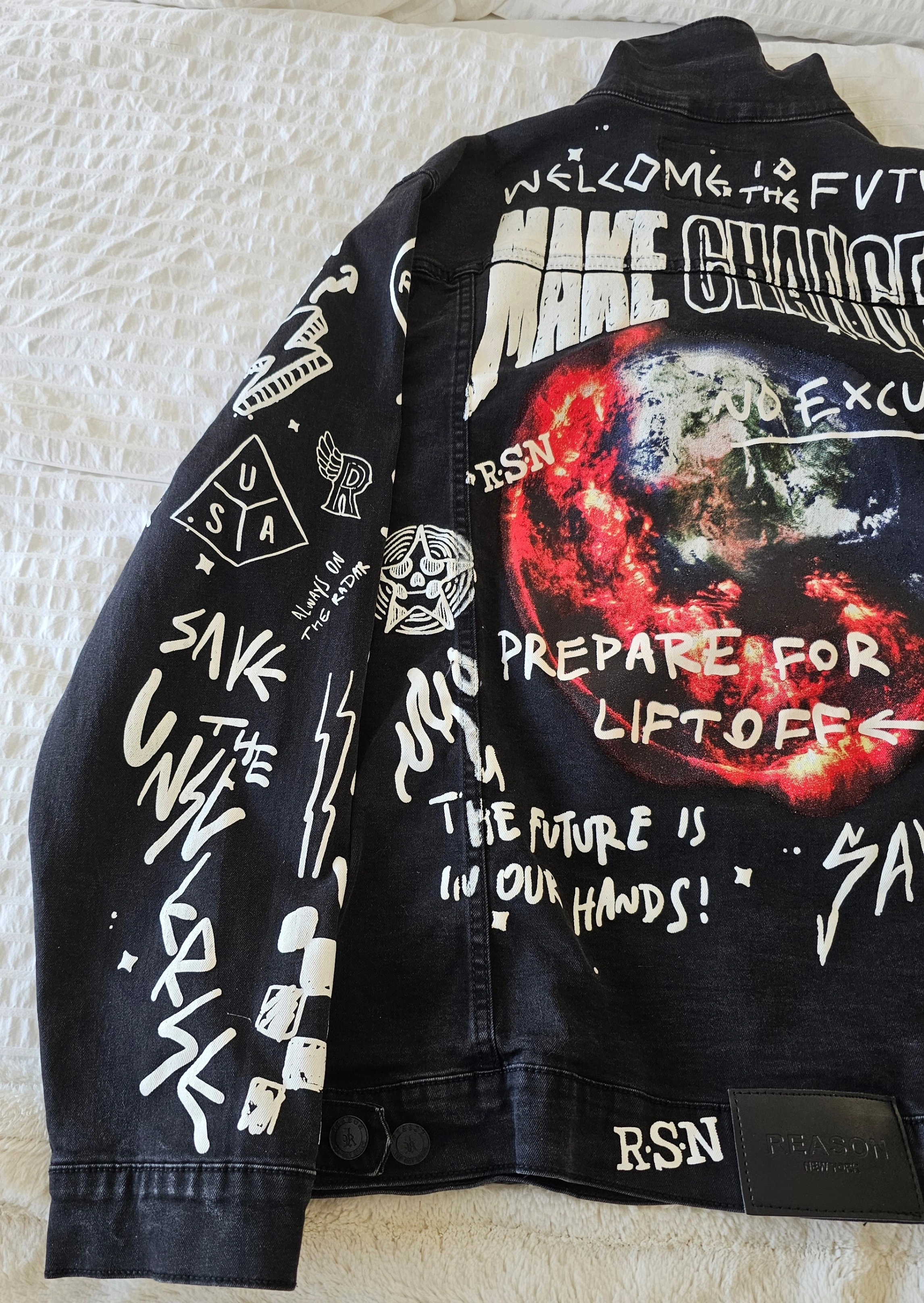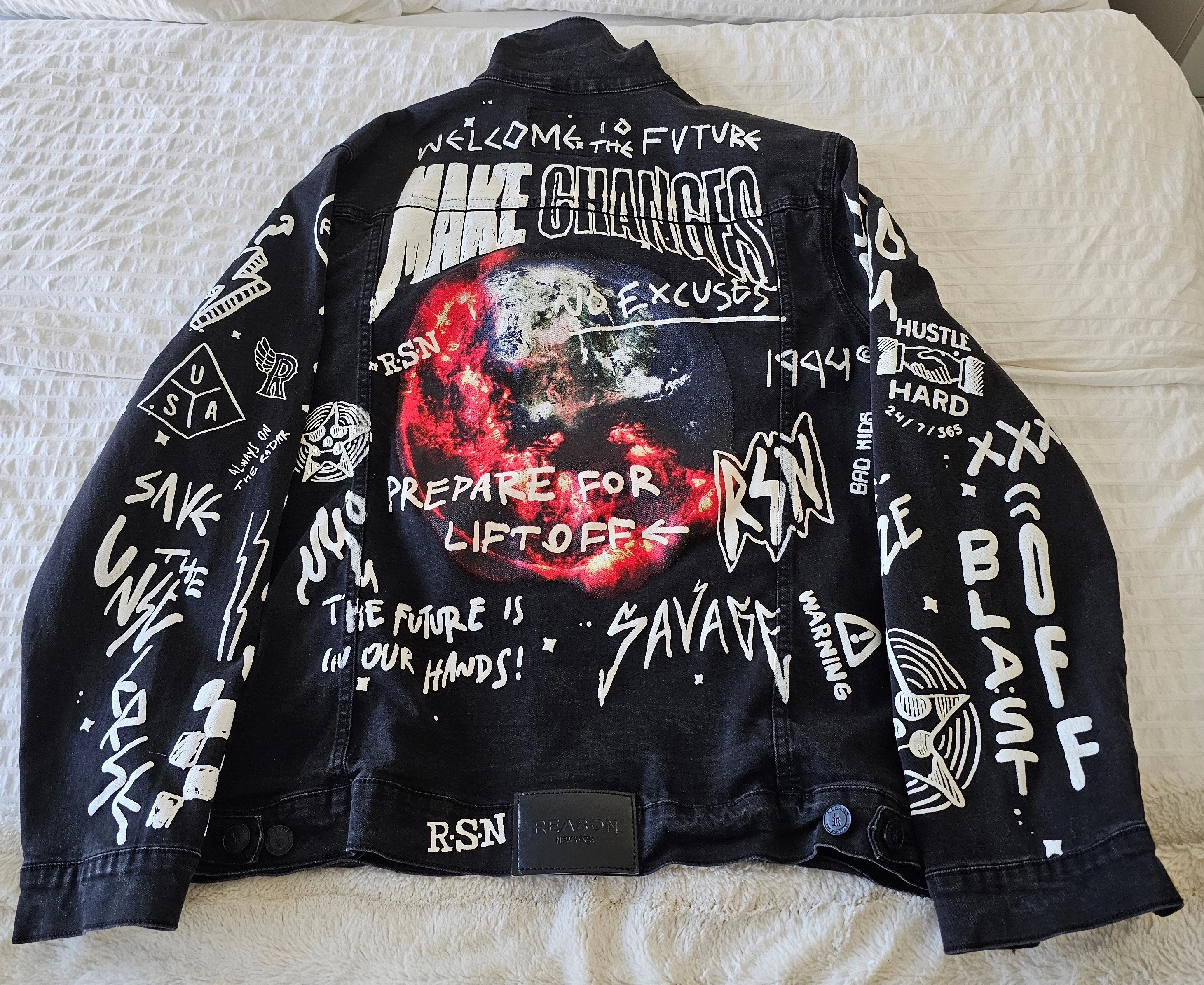 76~ IN THE SOUTH SURREY/WHITE ROCK AREA ~ NEW & NEVER WORN, Men's "REASON" New York Brand, Designer Black Denim Jacket!!! ~ You have to see it to believe it! ~ Multi Graphics all over this jacket! ~ Huge lettering of "Welcome To The Future" & "Make Changes" over top of a Huge Graphic of the world, along with other graphic designs throughout the whole jacket! ~ Multi Graffiti Designs on the sleeves of the jacket also! ~ Size XL ~ In great clean, New condition!!! ~ No tax to pay or shipping ~ Cash Only & you pick up. ~ Serious Buyers & No Low Ballers please. ~ REASONABLE OFFERS CONSIDERED, LOW BALL OFFERS WILL BE IGNORED!!! *** NOTE *** Please see my other listings as I am currently selling many household items such as Queen Size Pillow Cases and Duvet Covers, Backpacks, Bathroom Mats, Duffle Bags, Suitcases, Shoe Storage, Lots of various sizes of BRAND New Picture Frames and also BRAND NEW, NEVER WORN SNEAKERS etc.