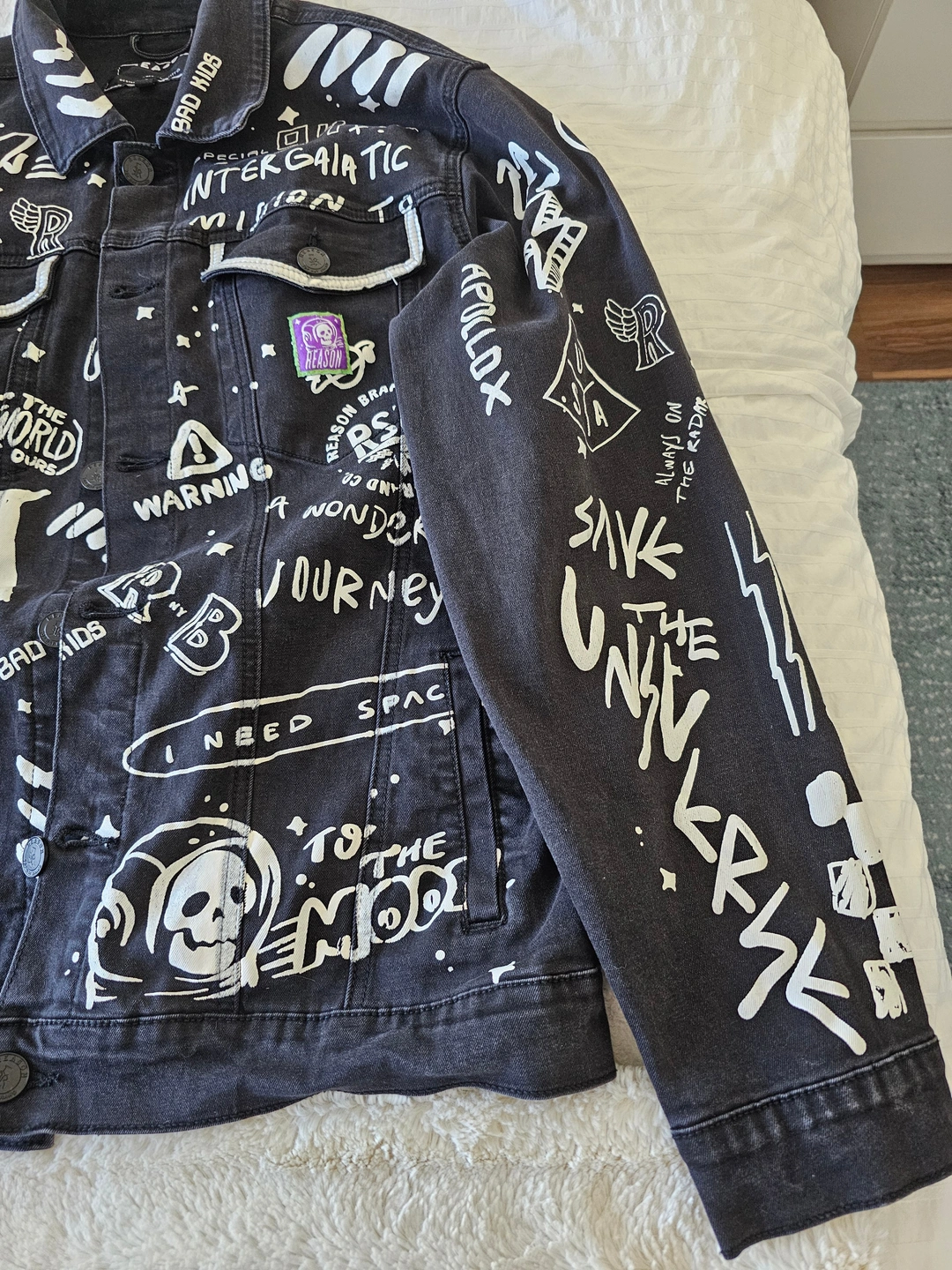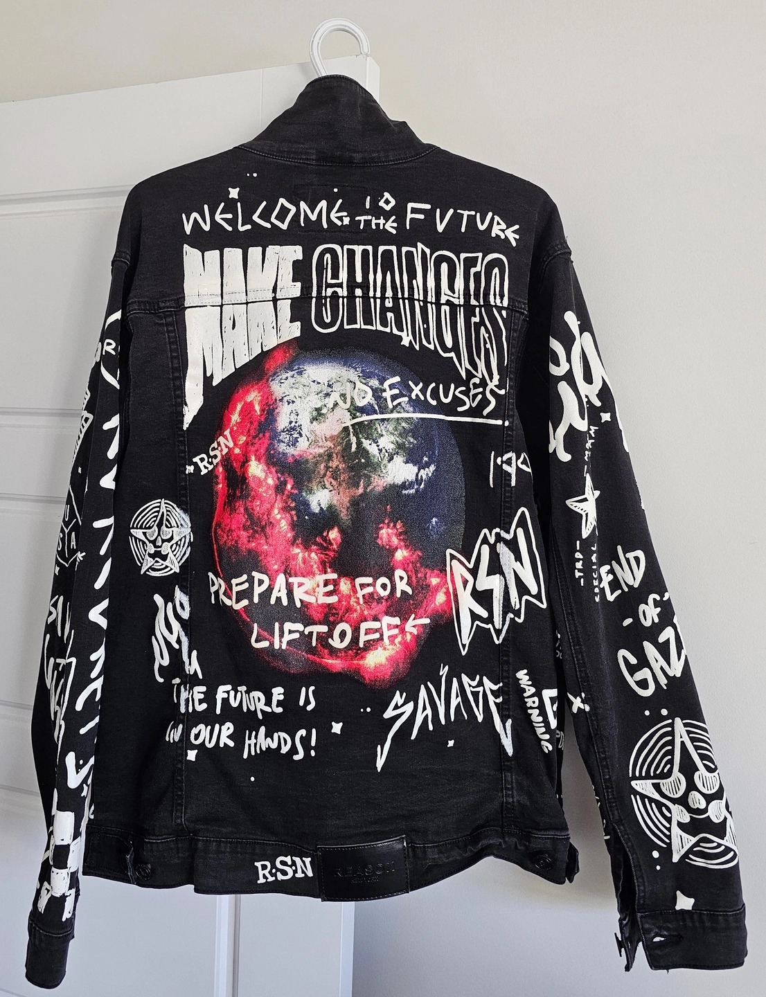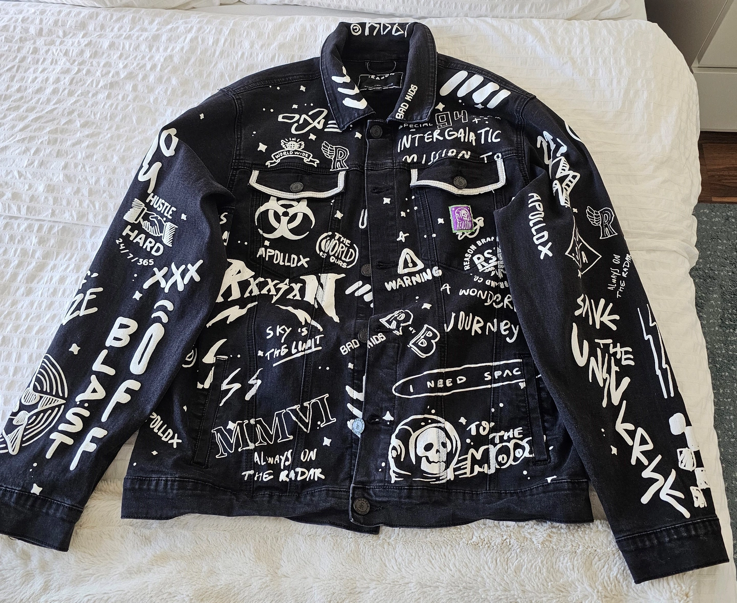 76~ IN THE SOUTH SURREY/WHITE ROCK AREA ~ NEW & NEVER WORN, Men's "REASON" New York Brand, Designer Black Denim Jacket!!! ~ You have to see it to believe it! ~ Multi Graphics all over this jacket! ~ Huge lettering of "Welcome To The Future" & "Make Changes" over top of a Huge Graphic of the world, along with other graphic designs throughout the whole jacket! ~ Multi Graffiti Designs on the sleeves of the jacket also! ~ Size XL ~ In great clean, New condition!!! ~ No tax to pay or shipping ~ Cash Only & you pick up. ~ Serious Buyers & No Low Ballers please. ~ REASONABLE OFFERS CONSIDERED, LOW BALL OFFERS WILL BE IGNORED!!! *** NOTE *** Please see my other listings as I am currently selling many household items such as Queen Size Pillow Cases and Duvet Covers, Backpacks, Bathroom Mats, Duffle Bags, Suitcases, Shoe Storage, Lots of various sizes of BRAND New Picture Frames and also BRAND NEW, NEVER WORN SNEAKERS etc.