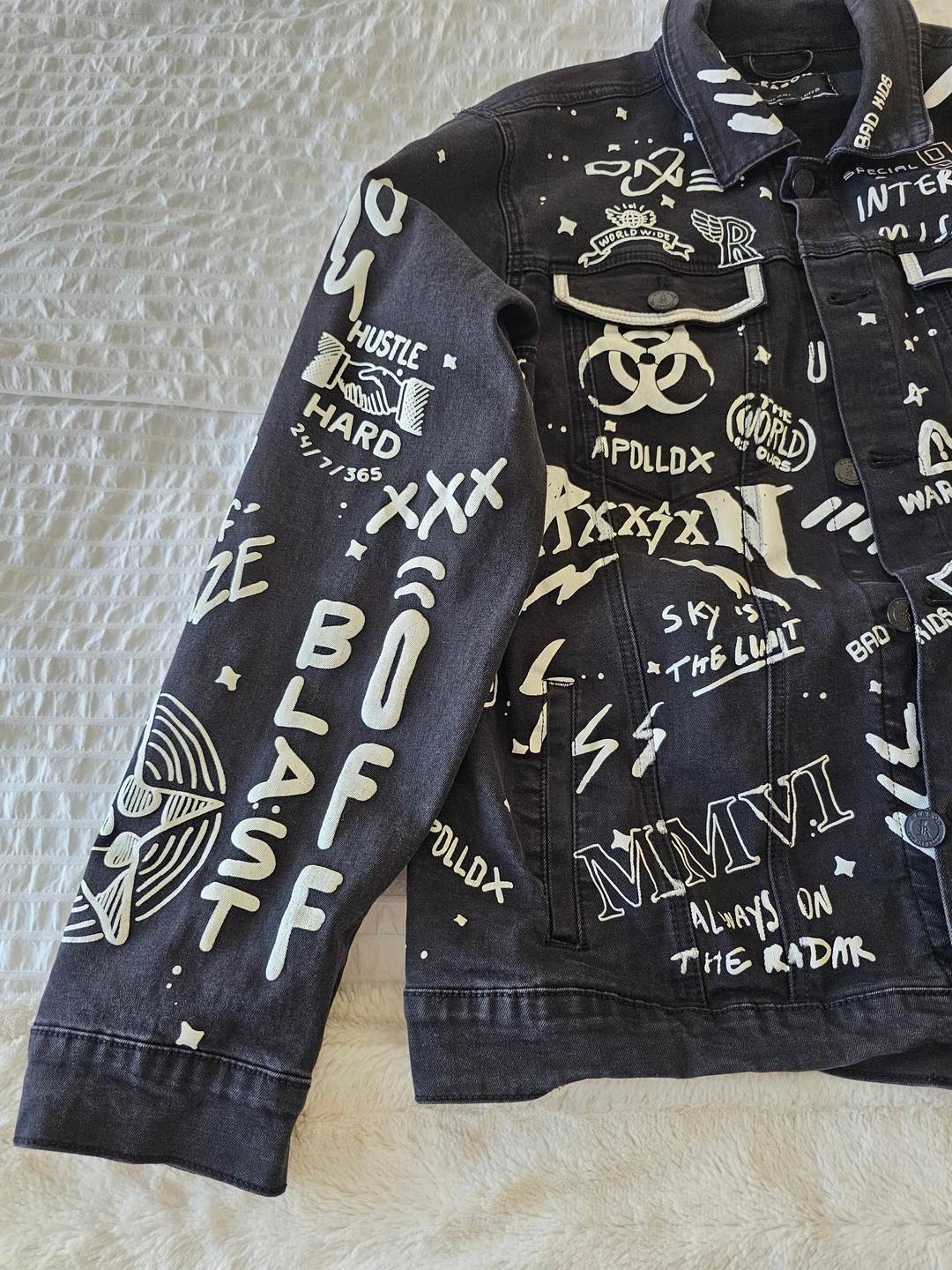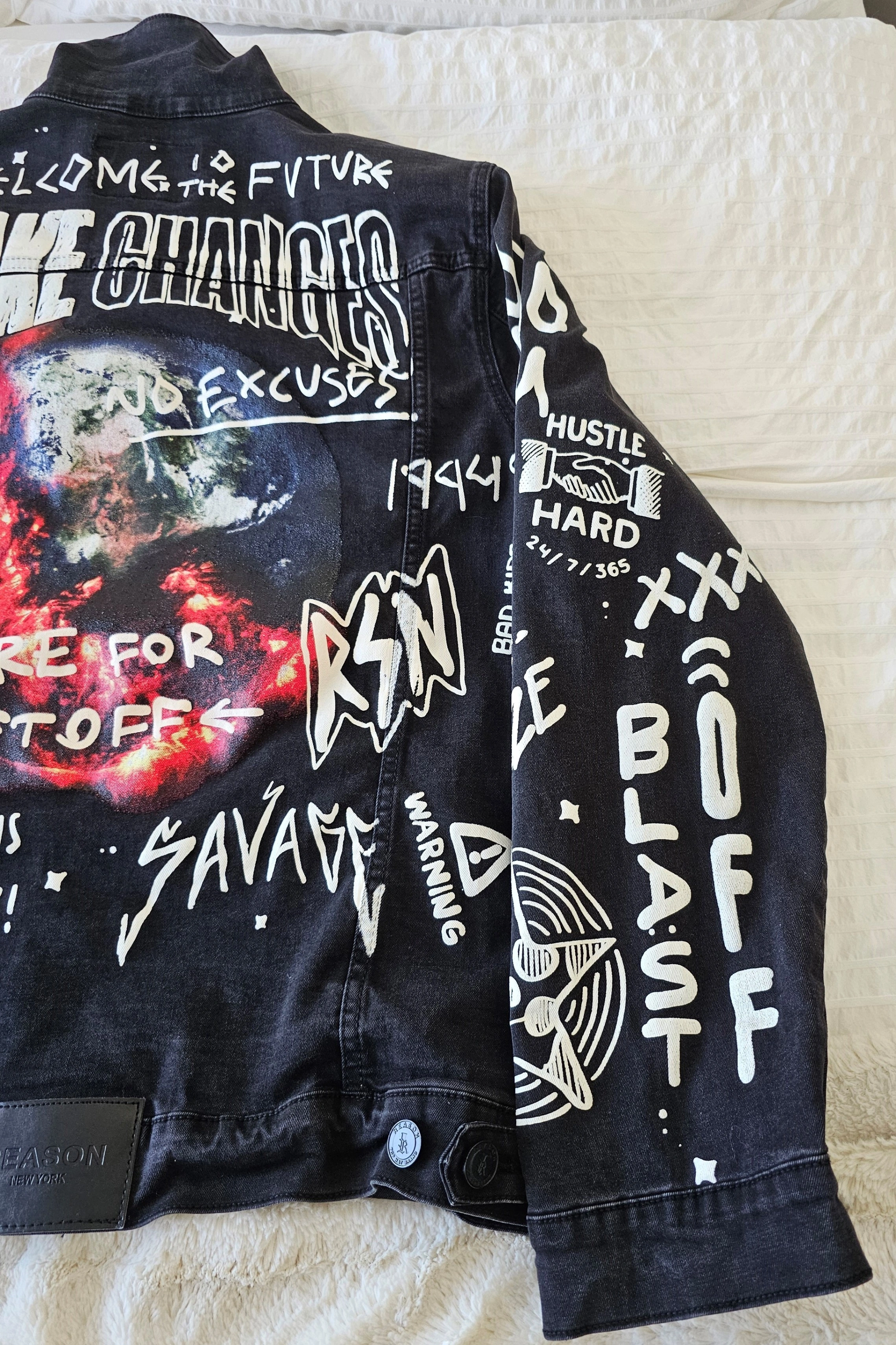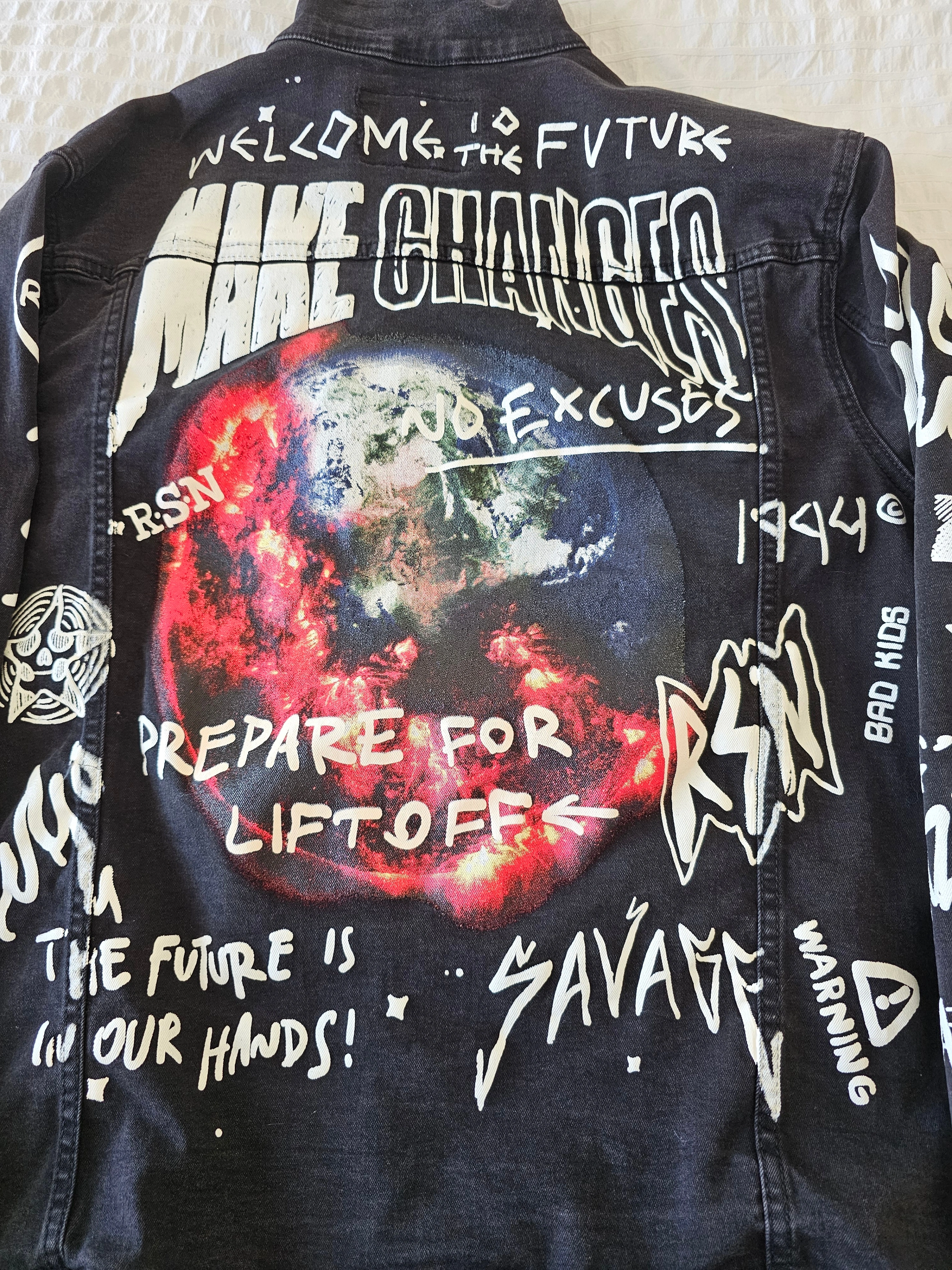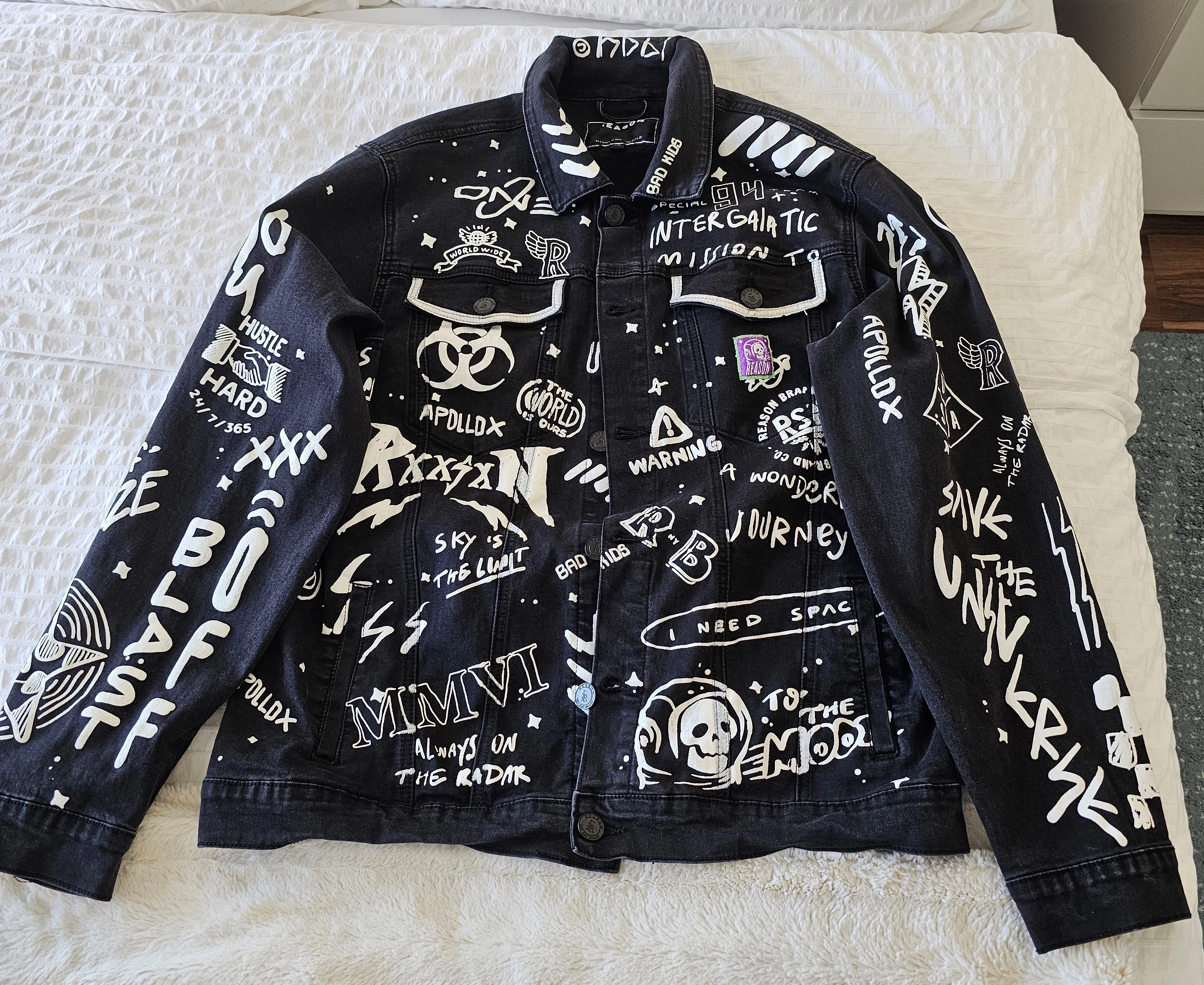 76~ IN THE SOUTH SURREY/WHITE ROCK AREA ~ NEW & NEVER WORN, Men's "REASON" New York Brand, Designer Black Denim Jacket!!! ~ You have to see it to believe it! ~ Multi Graphics all over this jacket! ~ Huge lettering of "Welcome To The Future" & "Make Changes" over top of a Huge Graphic of the world, along with other graphic designs throughout the whole jacket! ~ Multi Graffiti Designs on the sleeves of the jacket also! ~ Size XL ~ In great clean, New condition!!! ~ No tax to pay or shipping ~ Cash Only & you pick up. ~ Serious Buyers & No Low Ballers please. ~ REASONABLE OFFERS CONSIDERED, LOW BALL OFFERS WILL BE IGNORED!!! *** NOTE *** Please see my other listings as I am currently selling many household items such as Queen Size Pillow Cases and Duvet Covers, Backpacks, Bathroom Mats, Duffle Bags, Suitcases, Shoe Storage, Lots of various sizes of BRAND New Picture Frames and also BRAND NEW, NEVER WORN SNEAKERS etc.