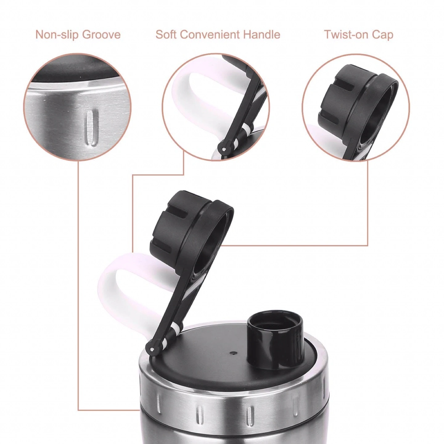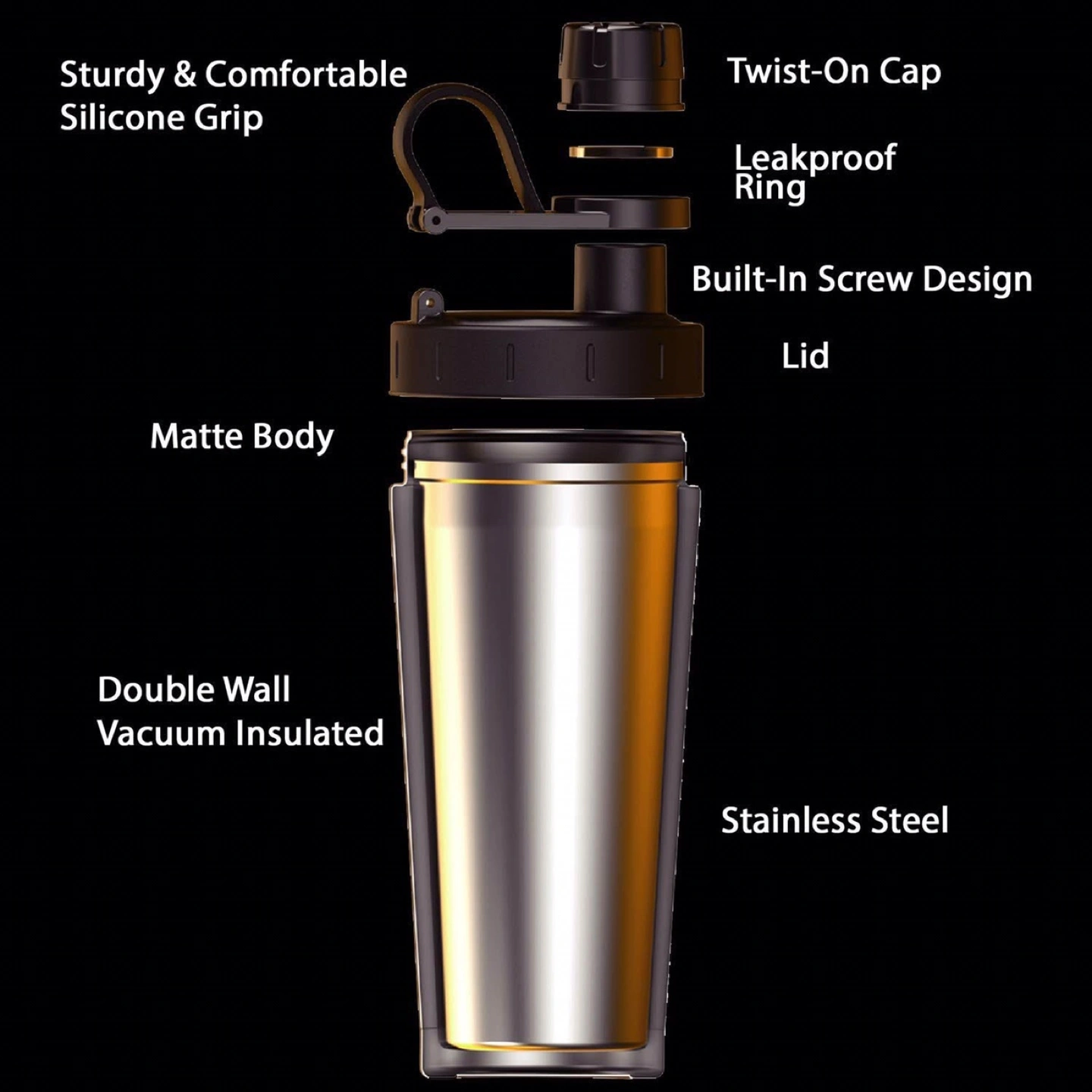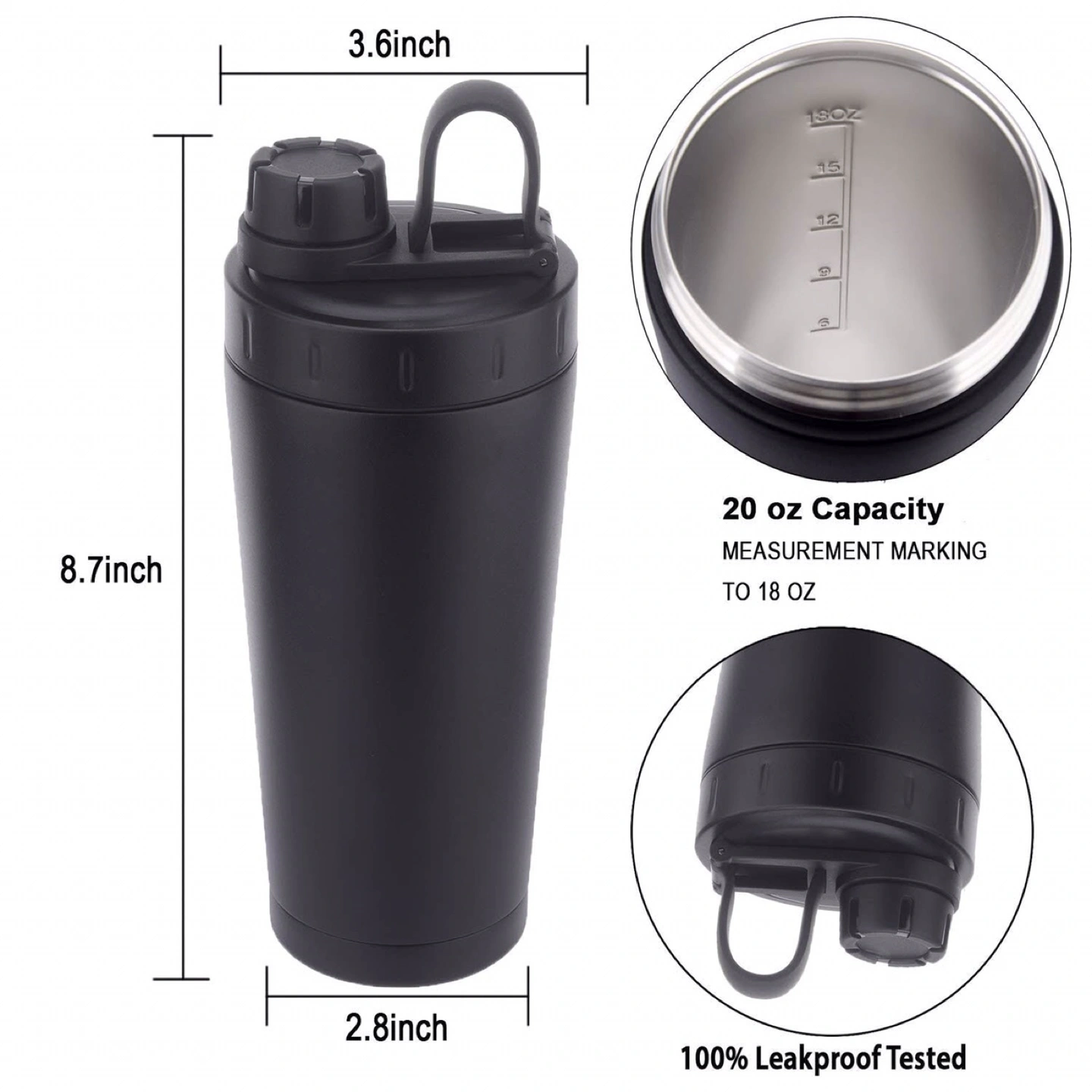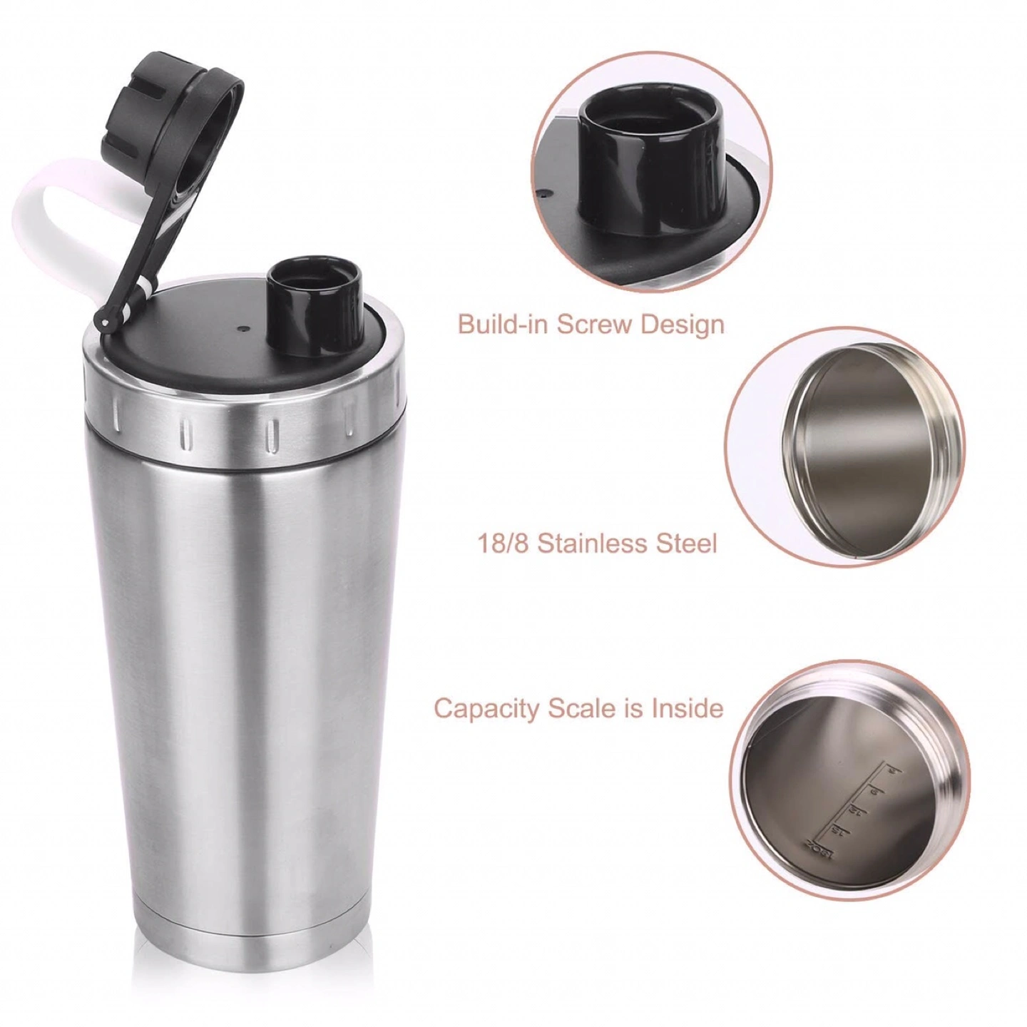 5DOUBLE-WALLED VACUUM INSULATED STAINLESS STEEL: REBORN 700ml/24oz multifunctional shaker bottle can be used as either an insulation water bottle or a protein shaker bottle thanks to the double-walled insulated vacuum technology to keep drinks hot or cold. Large-diameter design, cup mouth 80mm, can put larger ice in summer, convenient to heat water in winter, enjoy the ice and warm at any time. PREMIUM MATERIAL AND UNIQUE DESIGN WITH ENGRAVED LOGO: The shaker bottle is made from high quality stainless steel. Lead free and durable. Rust-proof, easy wash and unbreakable. Sweat proof, easy grip, the advanced technology prevents heat transfer to outer wall, condensation free and long lasting. LEAK FREE: Twist-on Cap in the top to ensure the water bottle leak proof anytime, easy to open and close. It is proven that a twist-on cap is at least two times more secure than a flip-top cap against spilling and leaking and the lid won’t burst open when dropped. ODOR RESISTANT/DISHWASHER SAFE: Our premium stainless steel does not absorb odor and is easy to clean without leaving any stains and it won’t rust, it can be used for multiple purposes: drinking water, protein mixes, hot beverages like coffee or tea without leaving the smell from your previous beverage. Shaker bottle and lid can be washed in a dishwasher. It's dishwasher safe, making clean-up so much easier and less hassle.