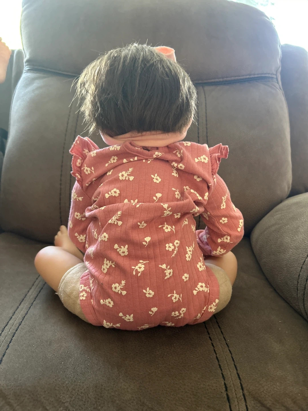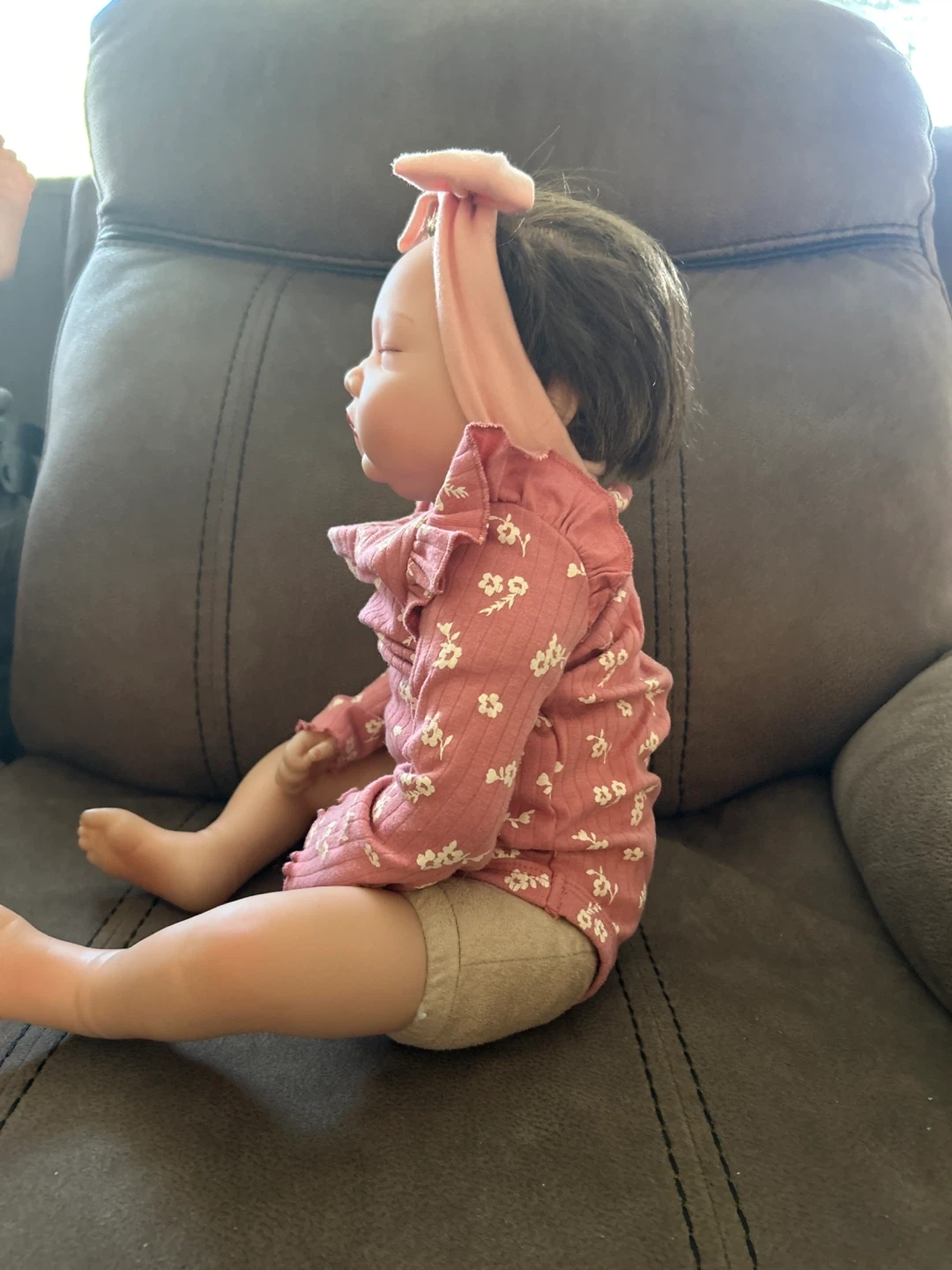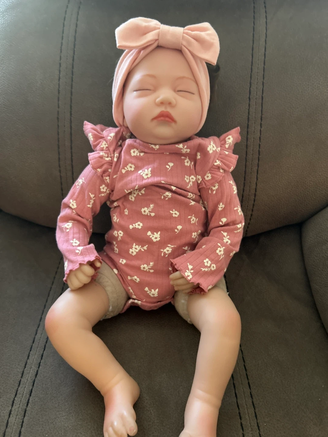 Selling a sweet reborn baby doll. She's wearing a cute pink floral outfit with a matching headband. A lovely addition to any doll collection!