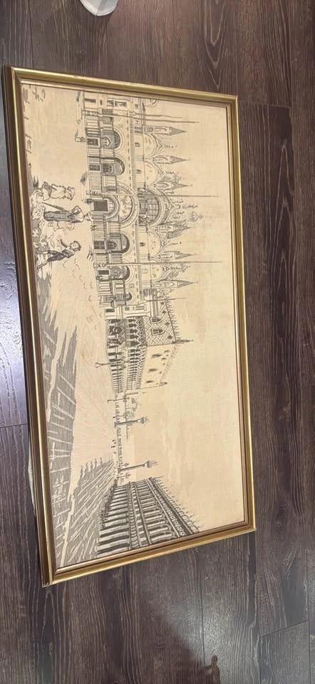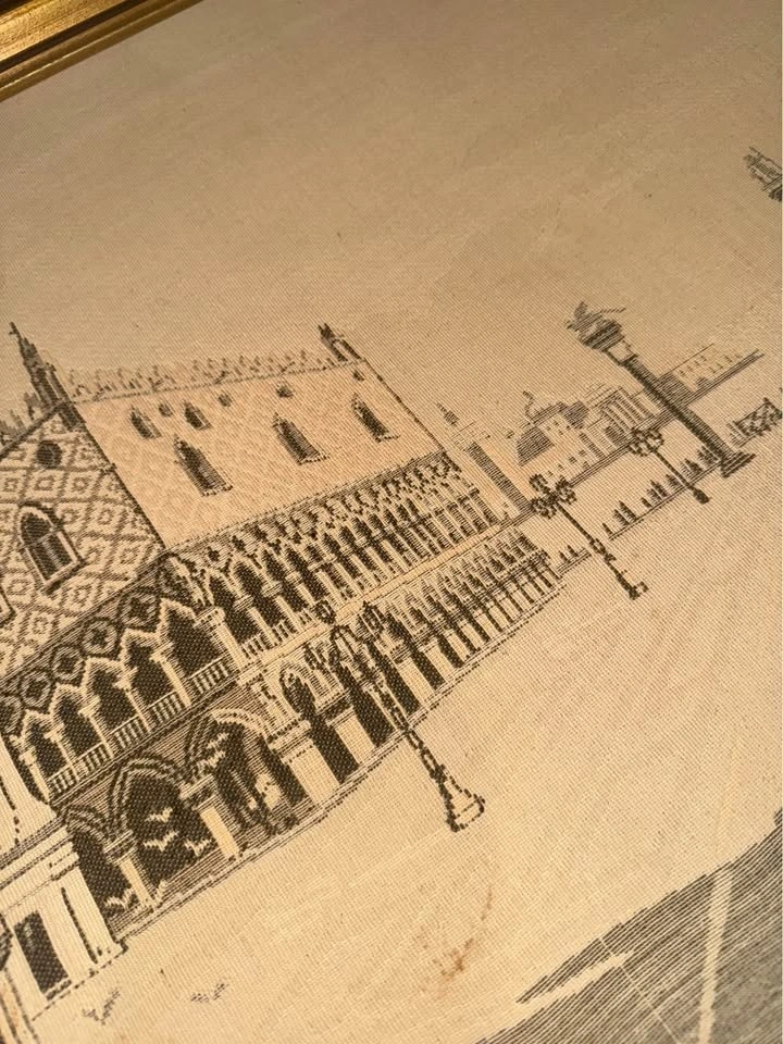 Beautiful vintage woven tapestry depicting Piazza San Marco and the Doge’s Palace in Venice, Italy. This mid-century textile artwork is created using a jacquard-style weave, giving it a textured, elegant look.