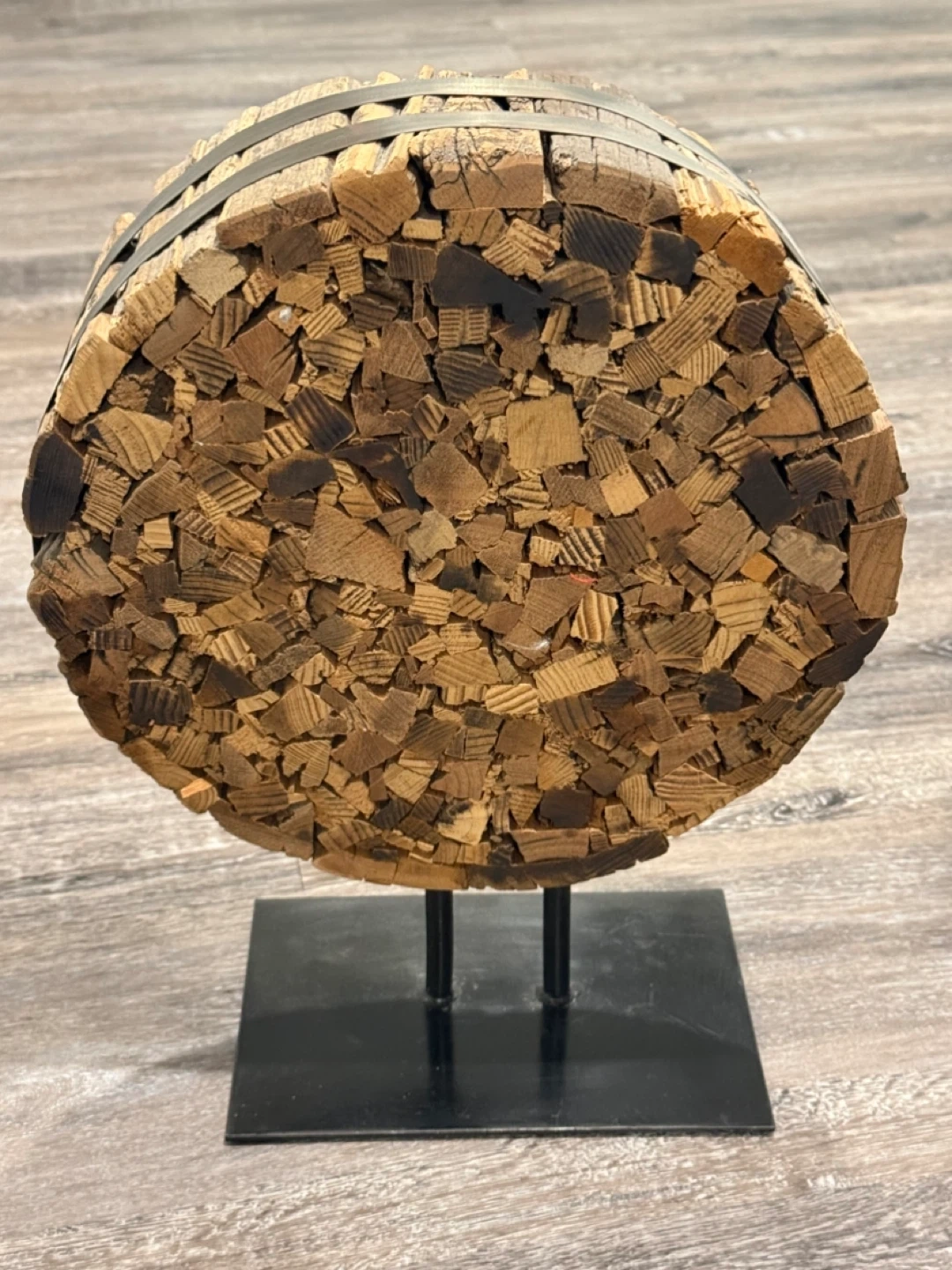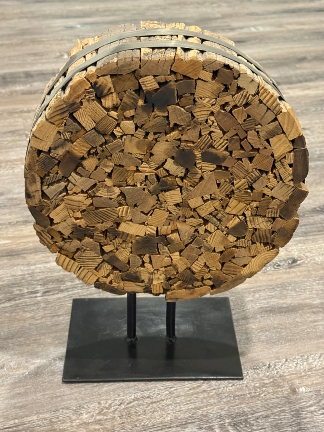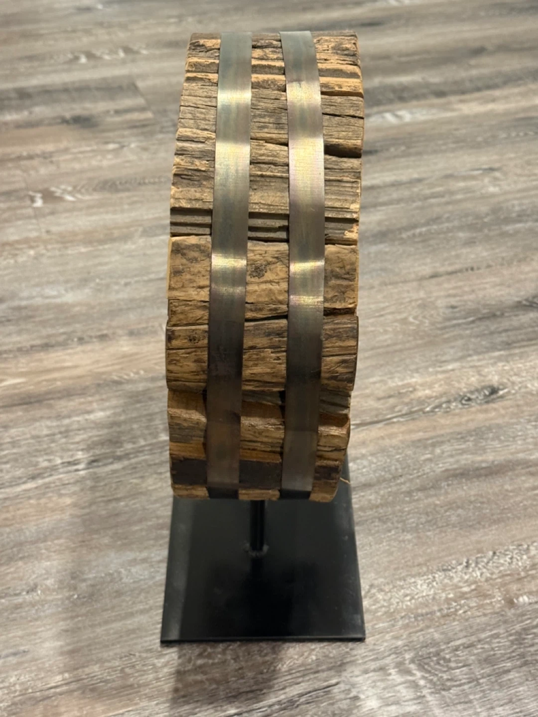 101Unique decorative sphere made of wood and metal. It adds a rustic touch to any room! Crate and Barrel reclaimed wooden art sculpture 12 inches across 16 inches tall Very heavy Pick up Sage Hill NW Cash only Check out my other items Pet and smoke free home