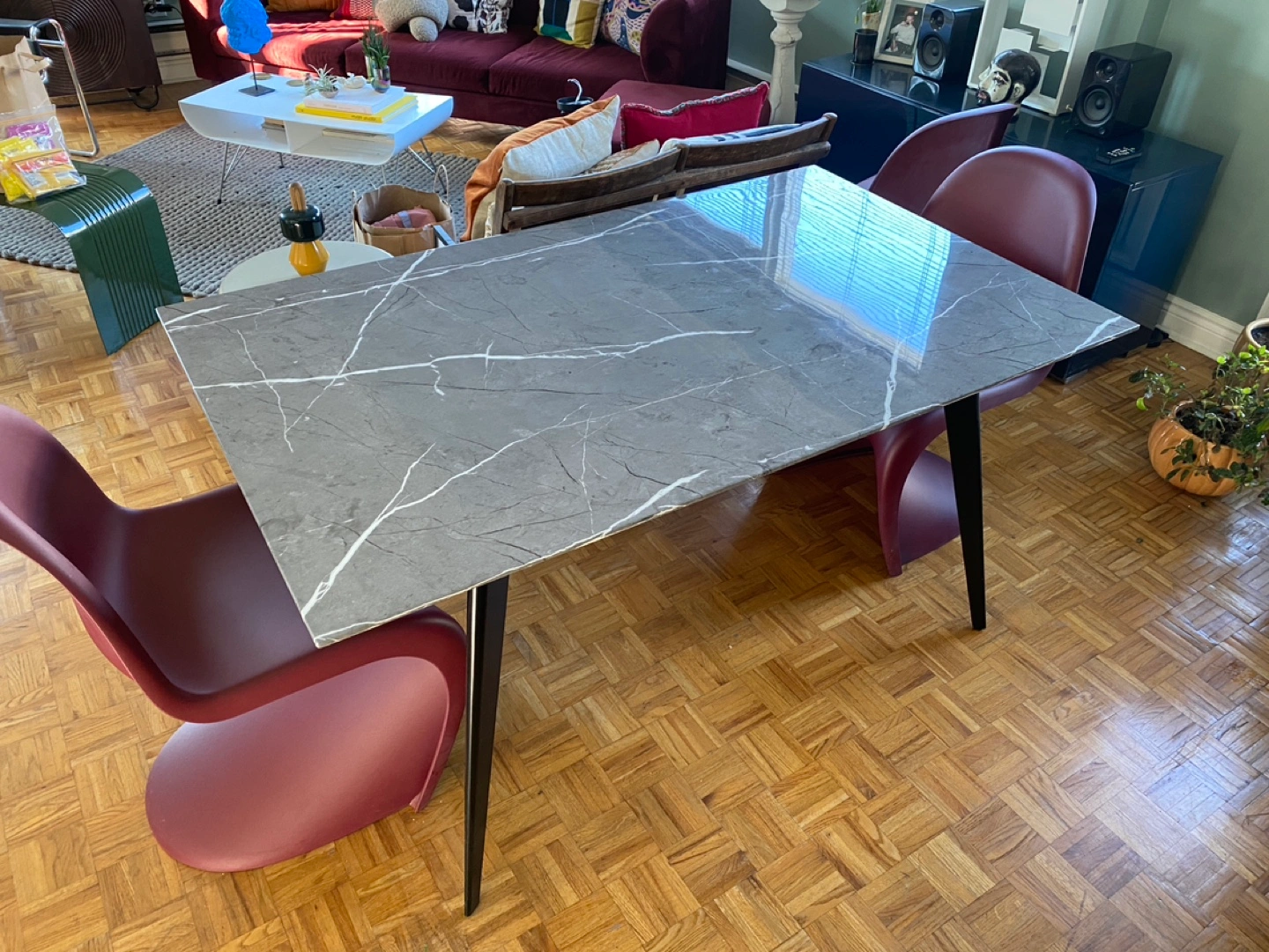 Dining table with grey marble glass top. Black metal legs. Pristine condition. Perfect for a condo or small space. Sits up to 6 people. Retails new $999.
