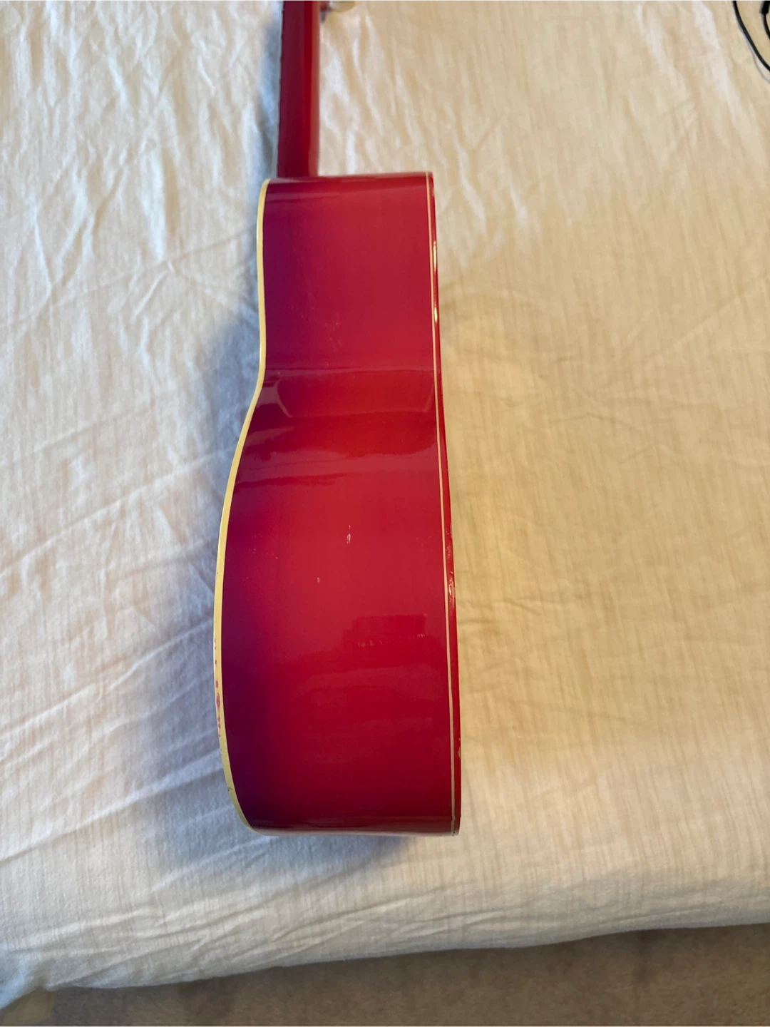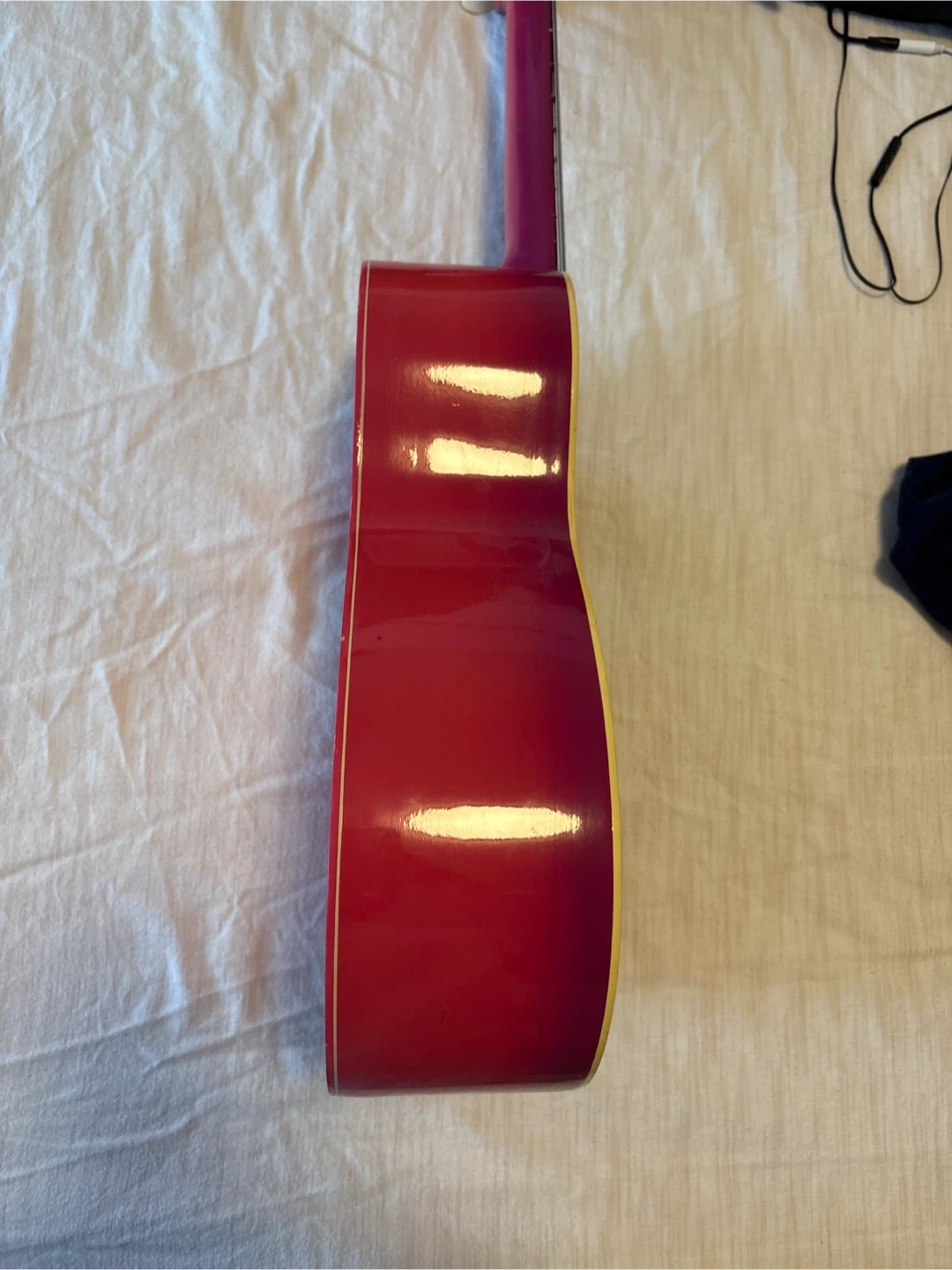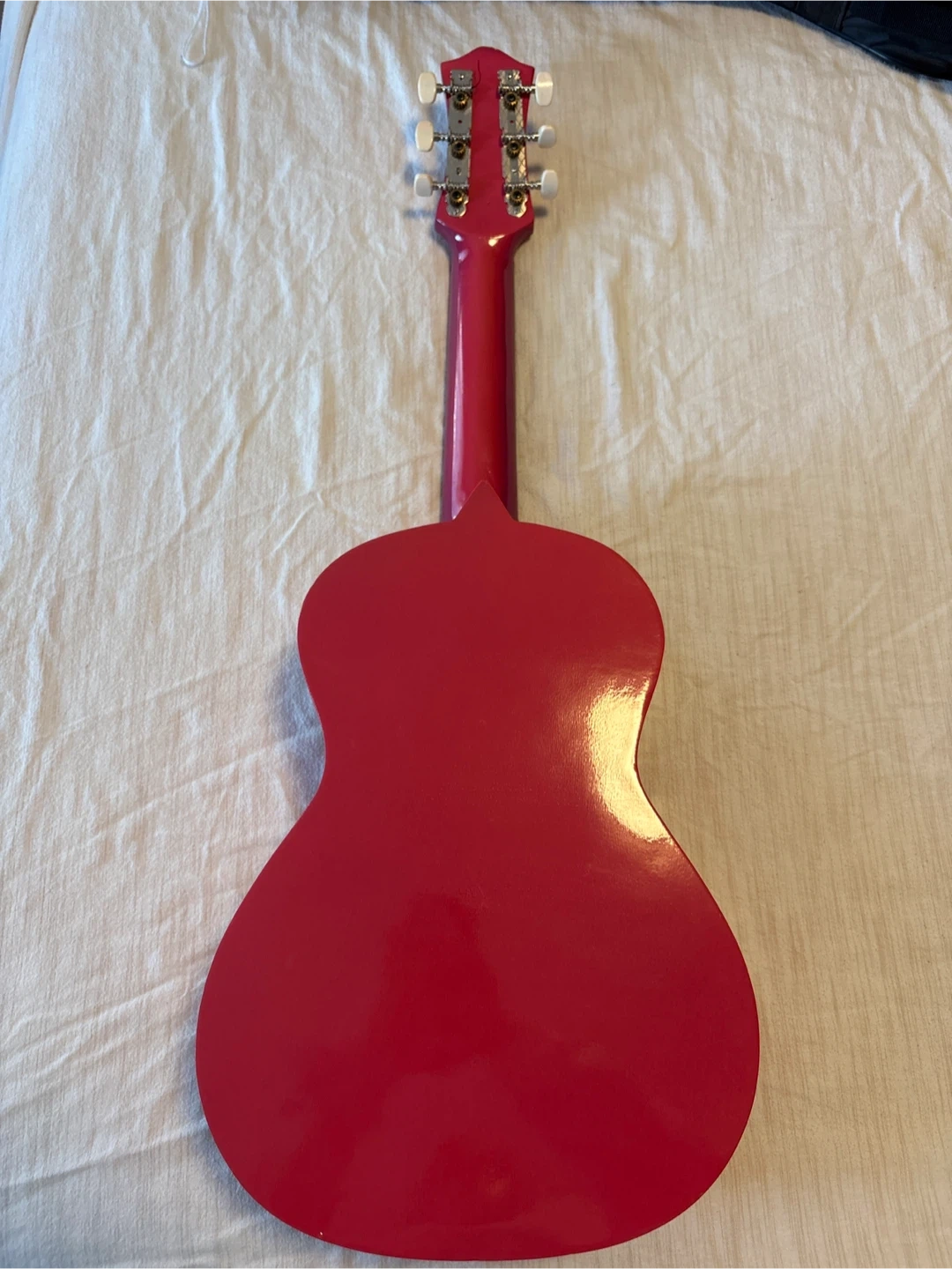 Selling a red acoustic guitar! It's in good condition and would be great for someone just starting out or looking for a fun instrument to play. There are a couple minor scratches on the body, but they don't affect the sound at all. Come with case covering as well.