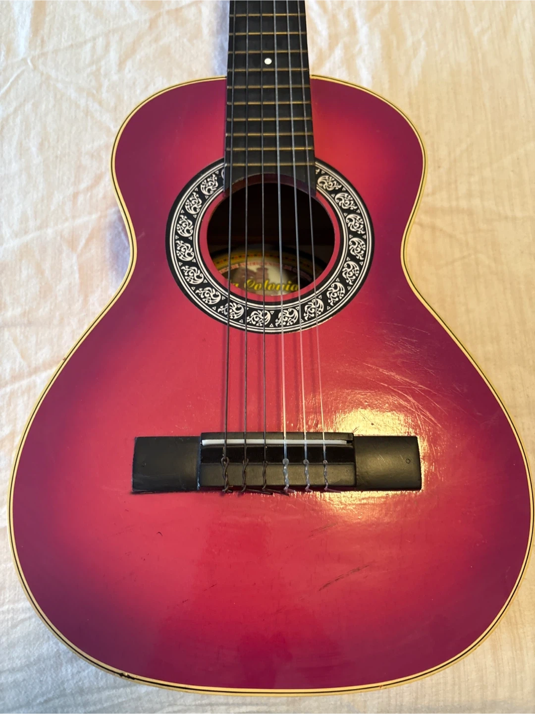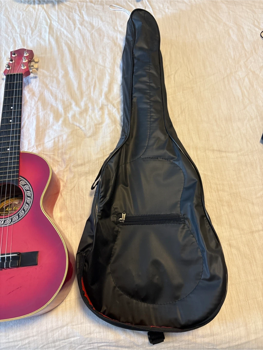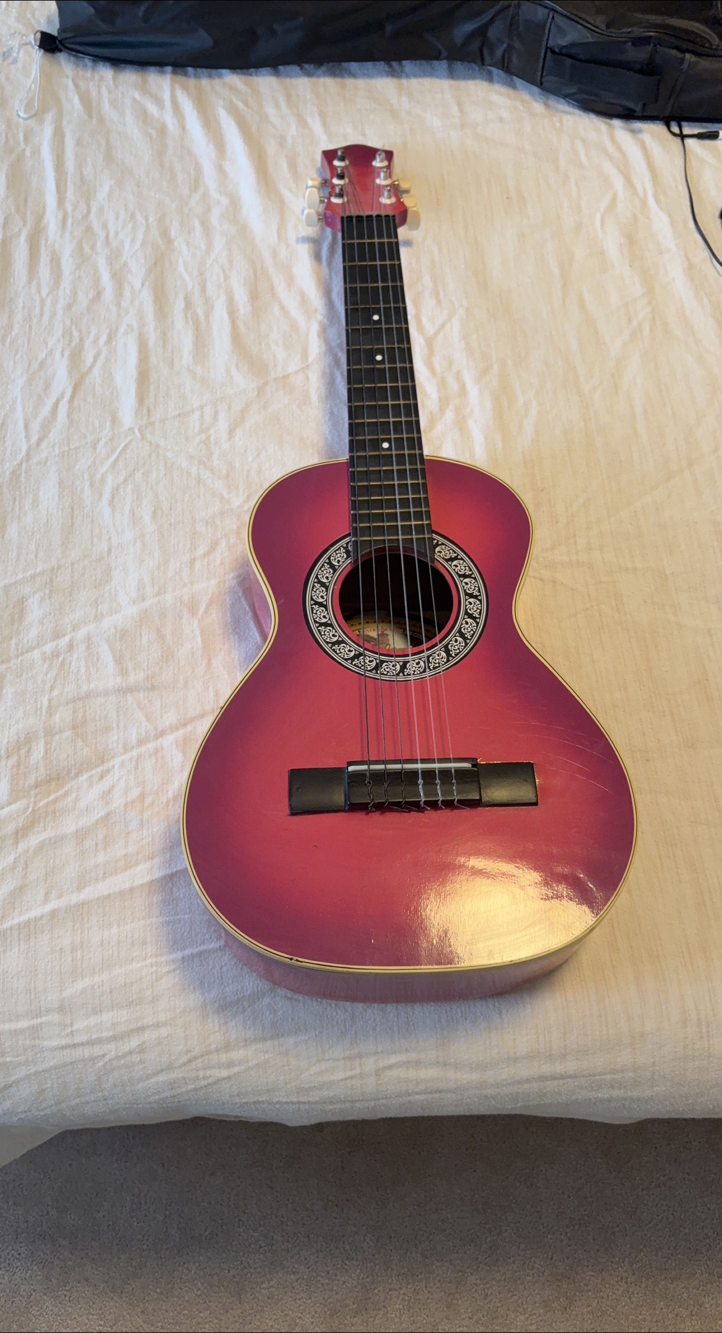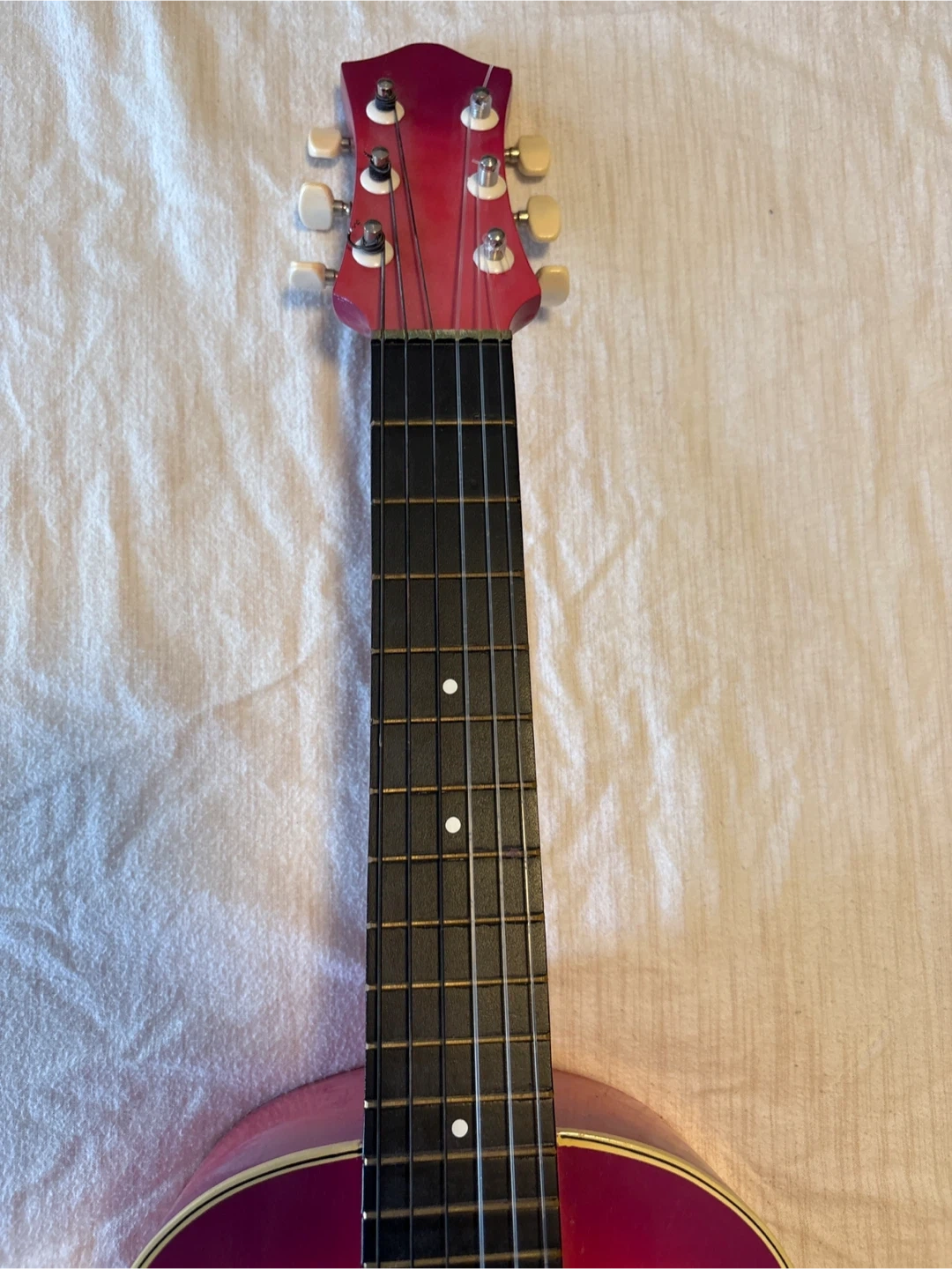 Selling a red acoustic guitar! It's in good condition and would be great for someone just starting out or looking for a fun instrument to play. There are a couple minor scratches on the body, but they don't affect the sound at all. Come with case covering as well.