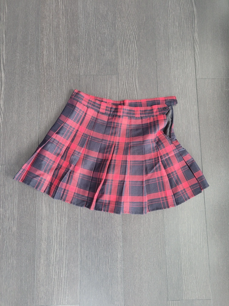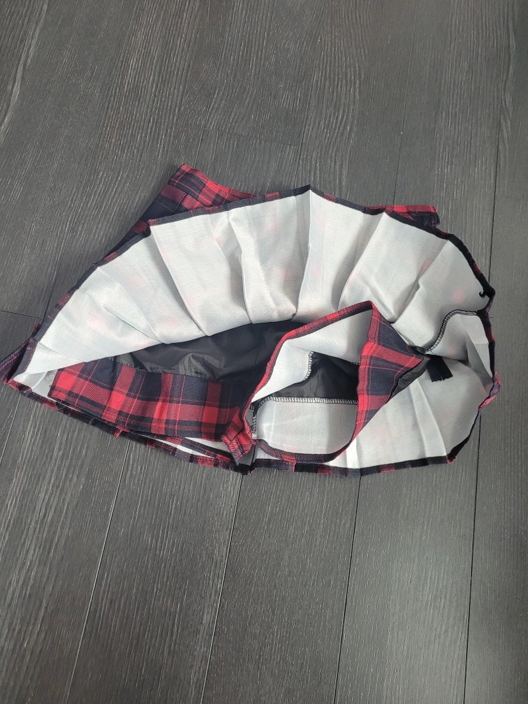 106Cute pleated mini skirt. Red and black plaid pattern. Good condition. Zipper closure on the side. Built in shorts for extra coverage and comfort.