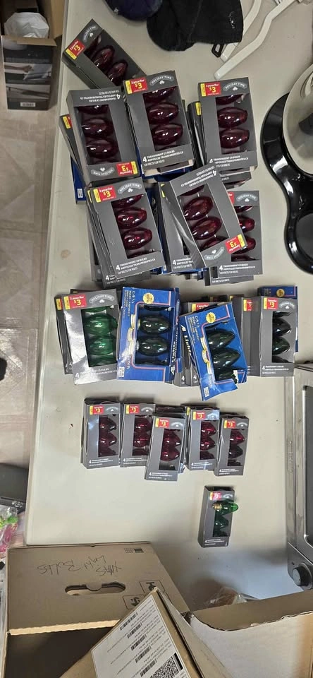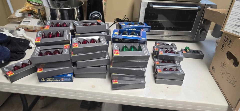 15Red C9 = 120 bulbs 7watts Green C9= 90 Bulbs 7watts Red C7 = 43 Bulbs 5watts Green C7 = 5 Bulbs 5watts