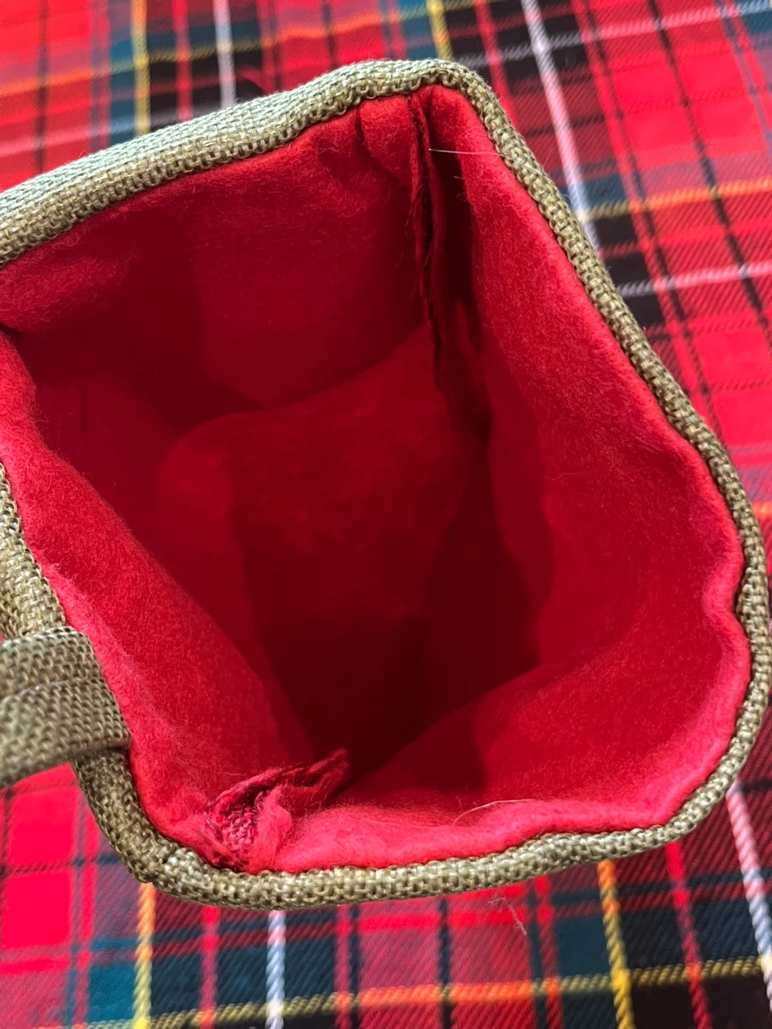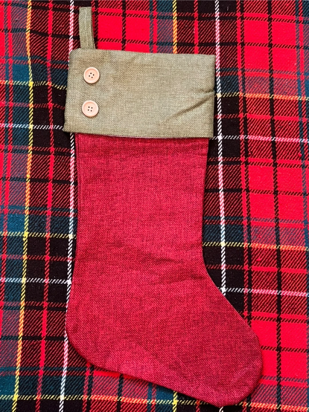 89A red Christmas stocking with an olive green cuff is available. It has a red interior and a loop for hanging. Perfect for adding a festive touch to your holiday decorations. Pickup only, near Oakland’s elementary school