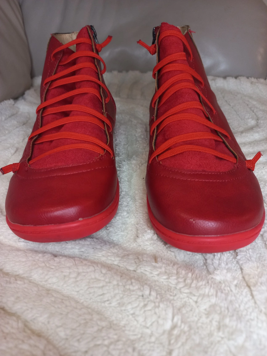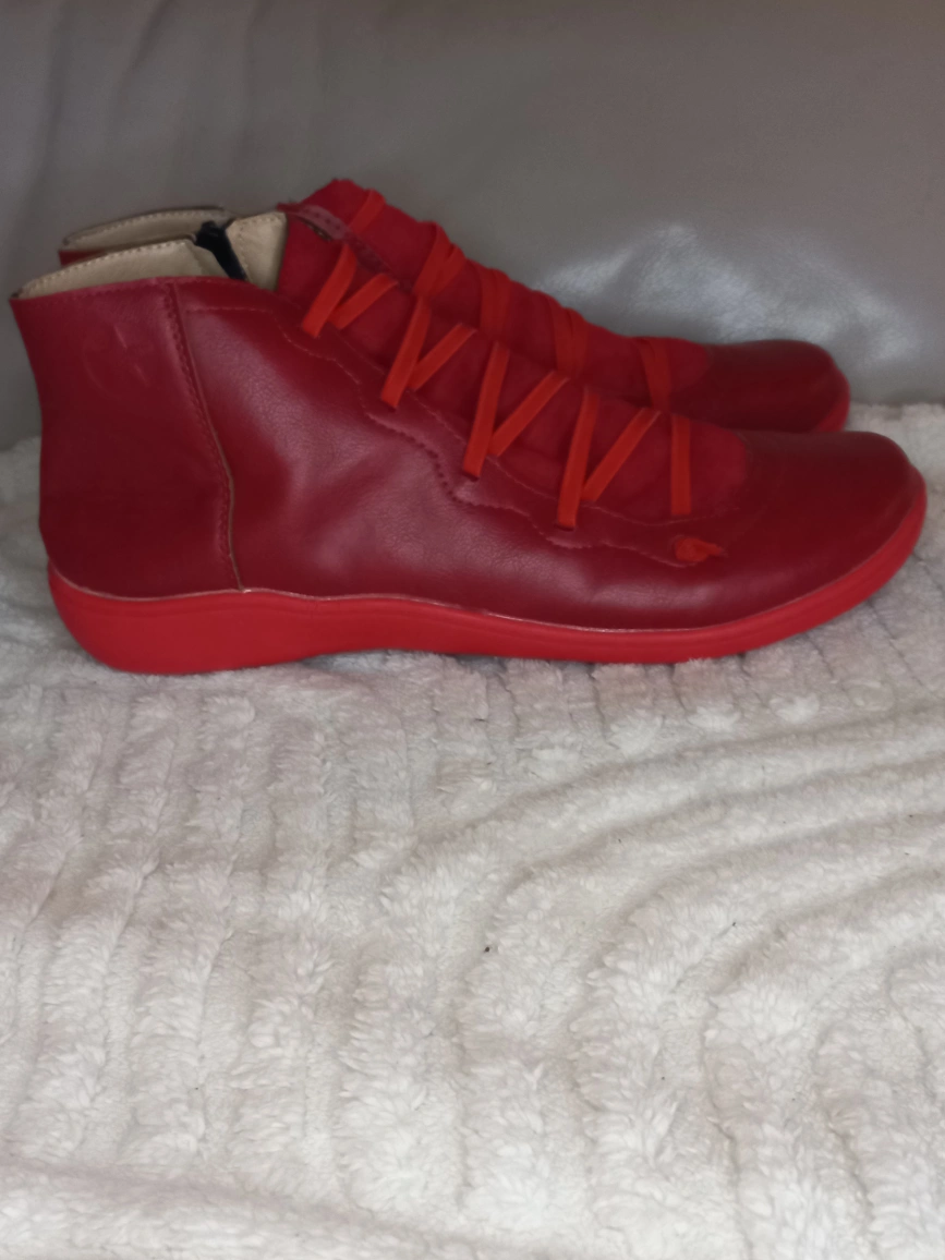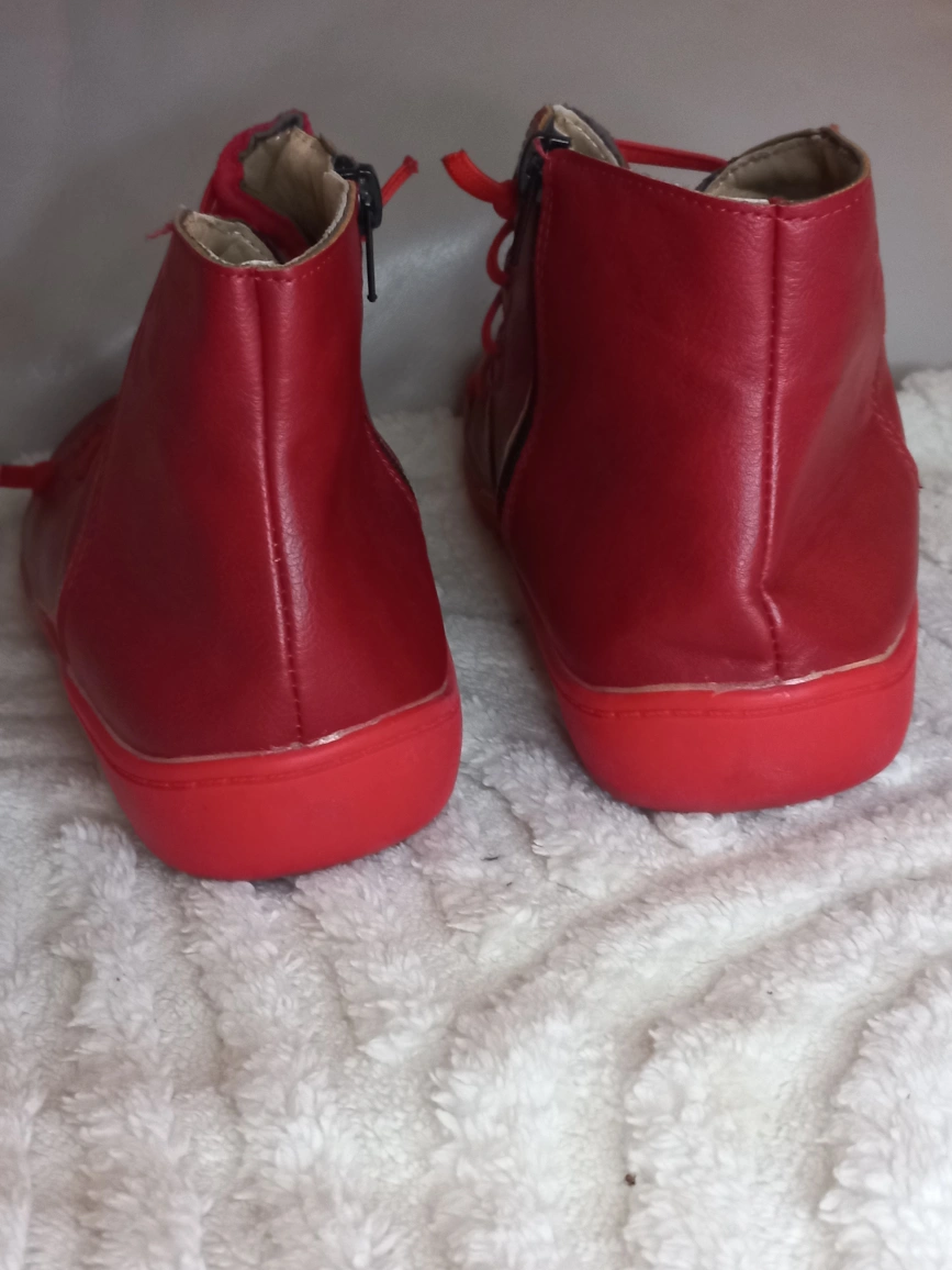 70Selling a pair of red ankle boots. They are in good condition and ready for a new home! They feature a unique lace-up design and a comfortable sole. Perfect for adding a pop of colour to your outfit!