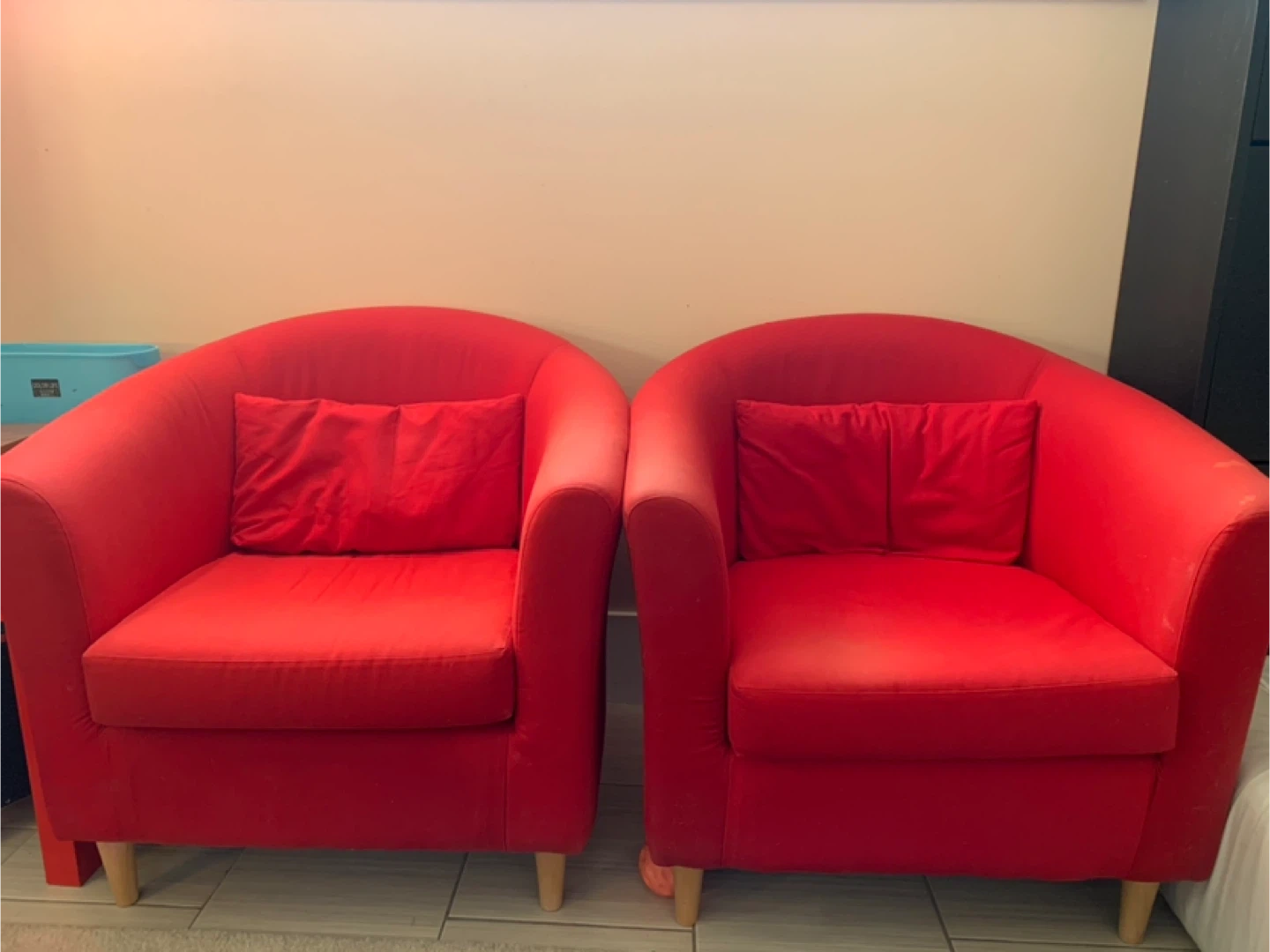 16Selling a comfy red barrel chair, perfect for adding a pop of colour to any room! It comes with a matching pillow for extra coziness. The chair shows some signs of use, but it's still in good condition and ready to be enjoyed in a new home