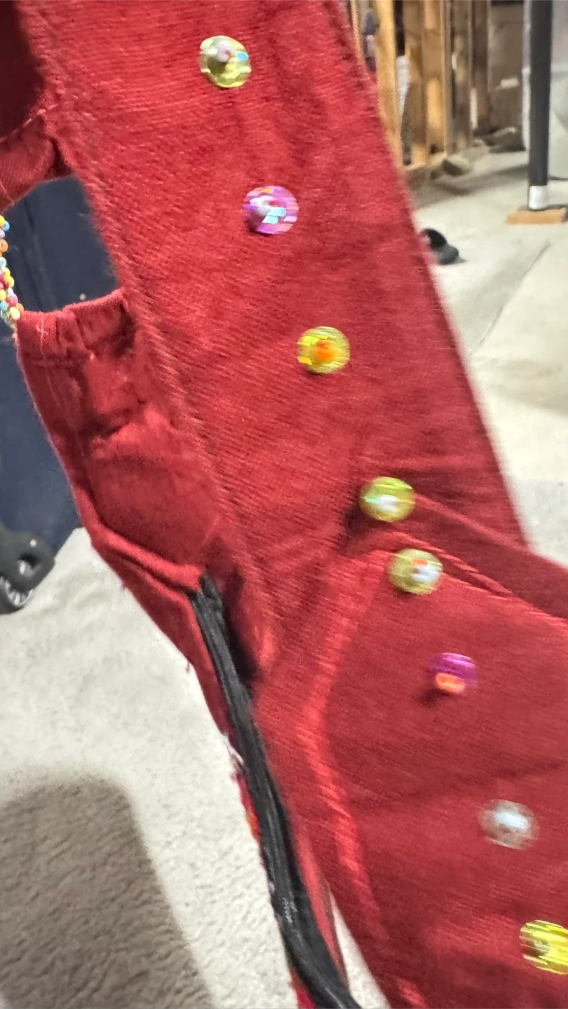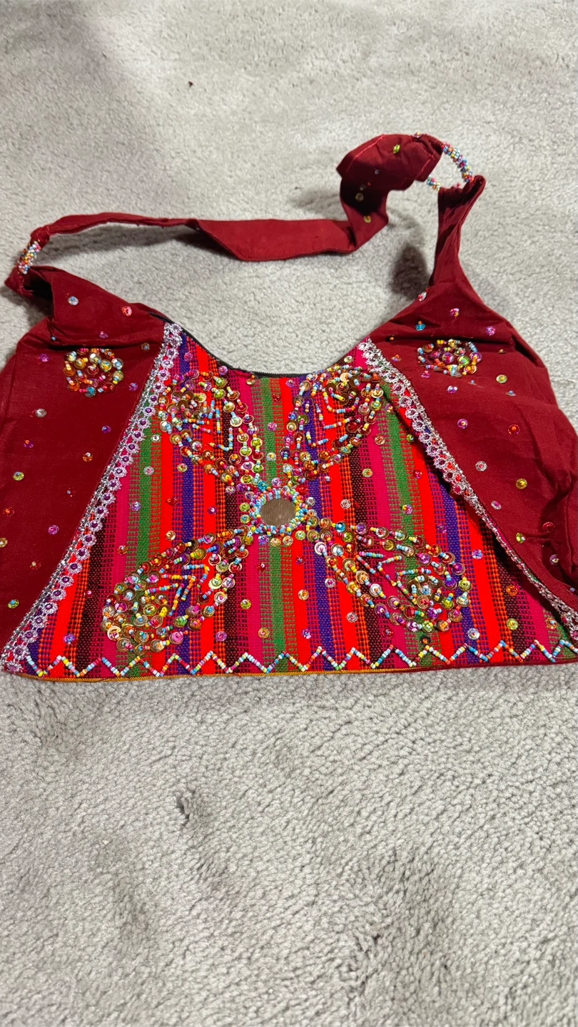 38Check out this unique red shoulder bag! It has colourful beading, mirror work and a fun, vibrant design. Perfect for adding a pop of colour to your outfit! Brand New, never used Pick up near Grace hospital