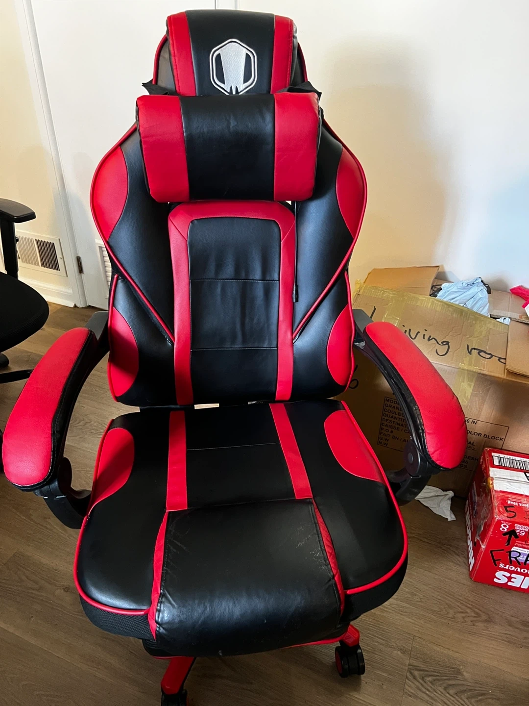 Selling a killabee gaming chair in red and black. Has a footrest too. It has some signs of wear, as you can see in the photos, but it's still in great condition. Perfect for long gaming sessions or working from home!