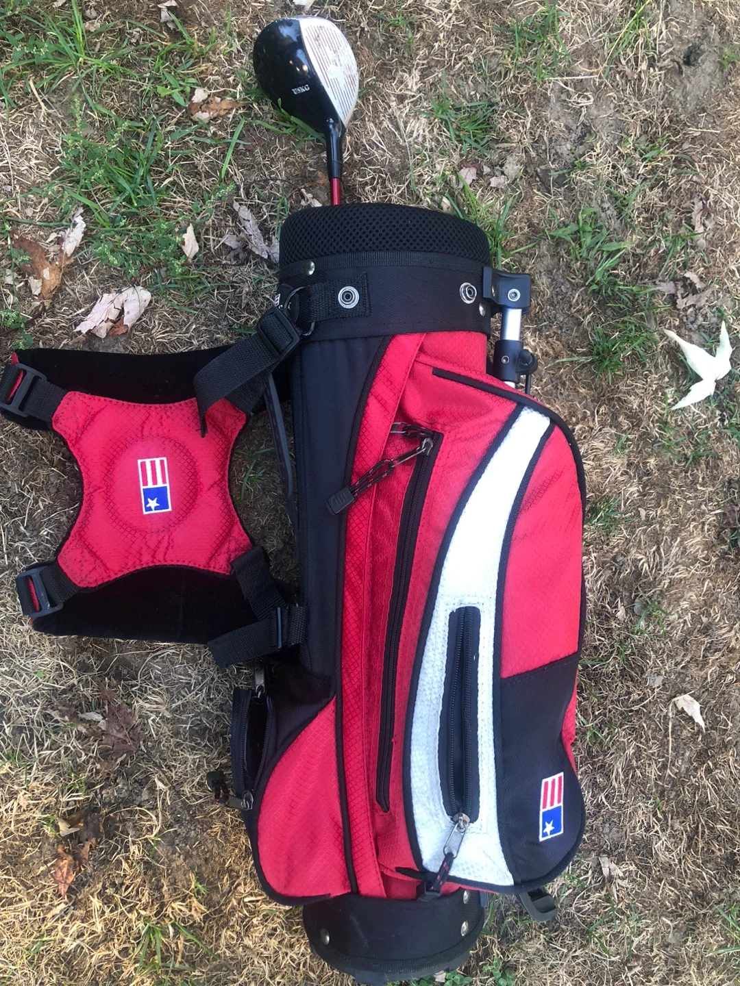 Selling a red and black golf bag, complete with a golf club! It's in good condition and ready for the green. Perfect for beginners or seasoned golfers looking for a reliable bag.