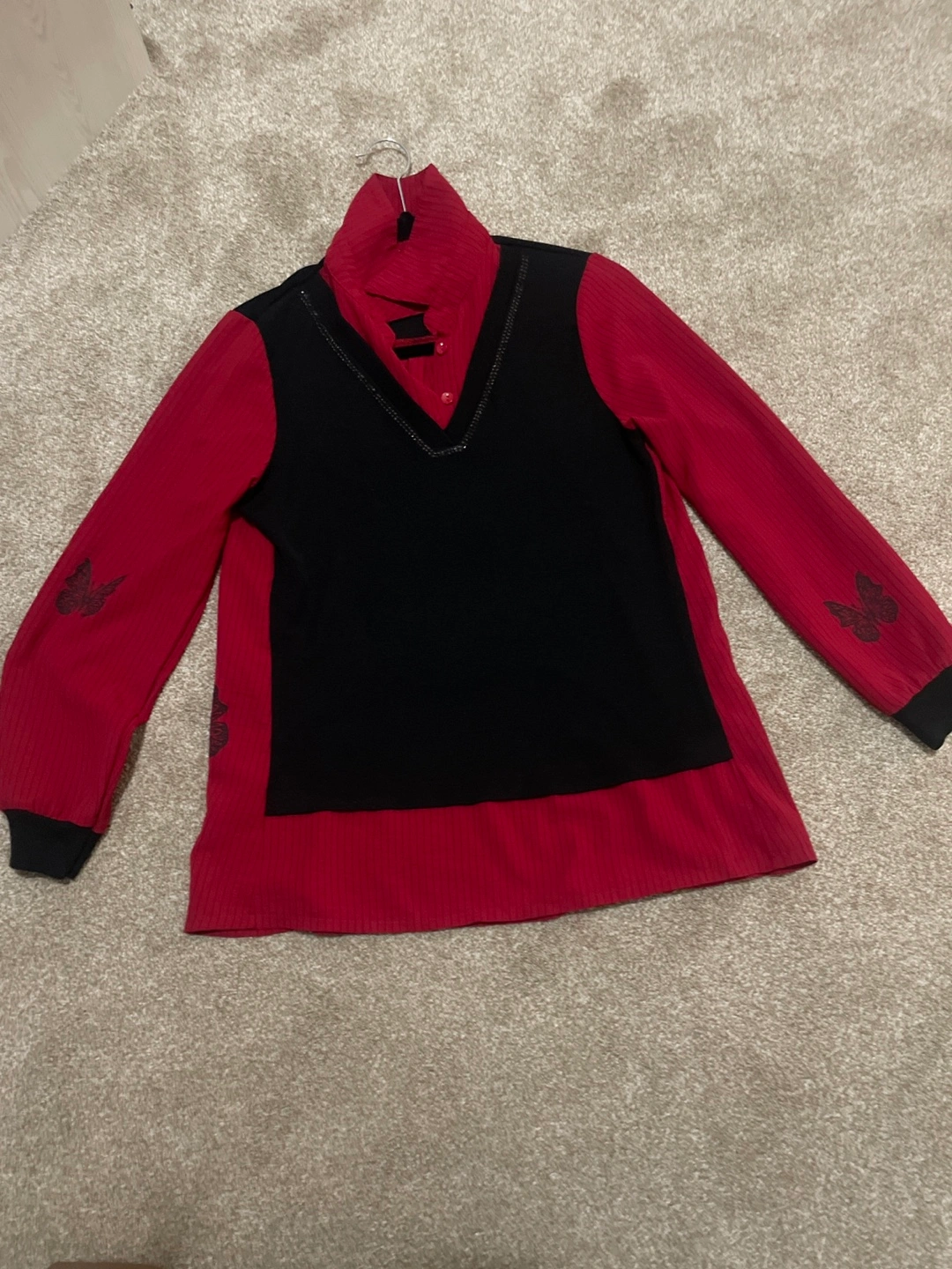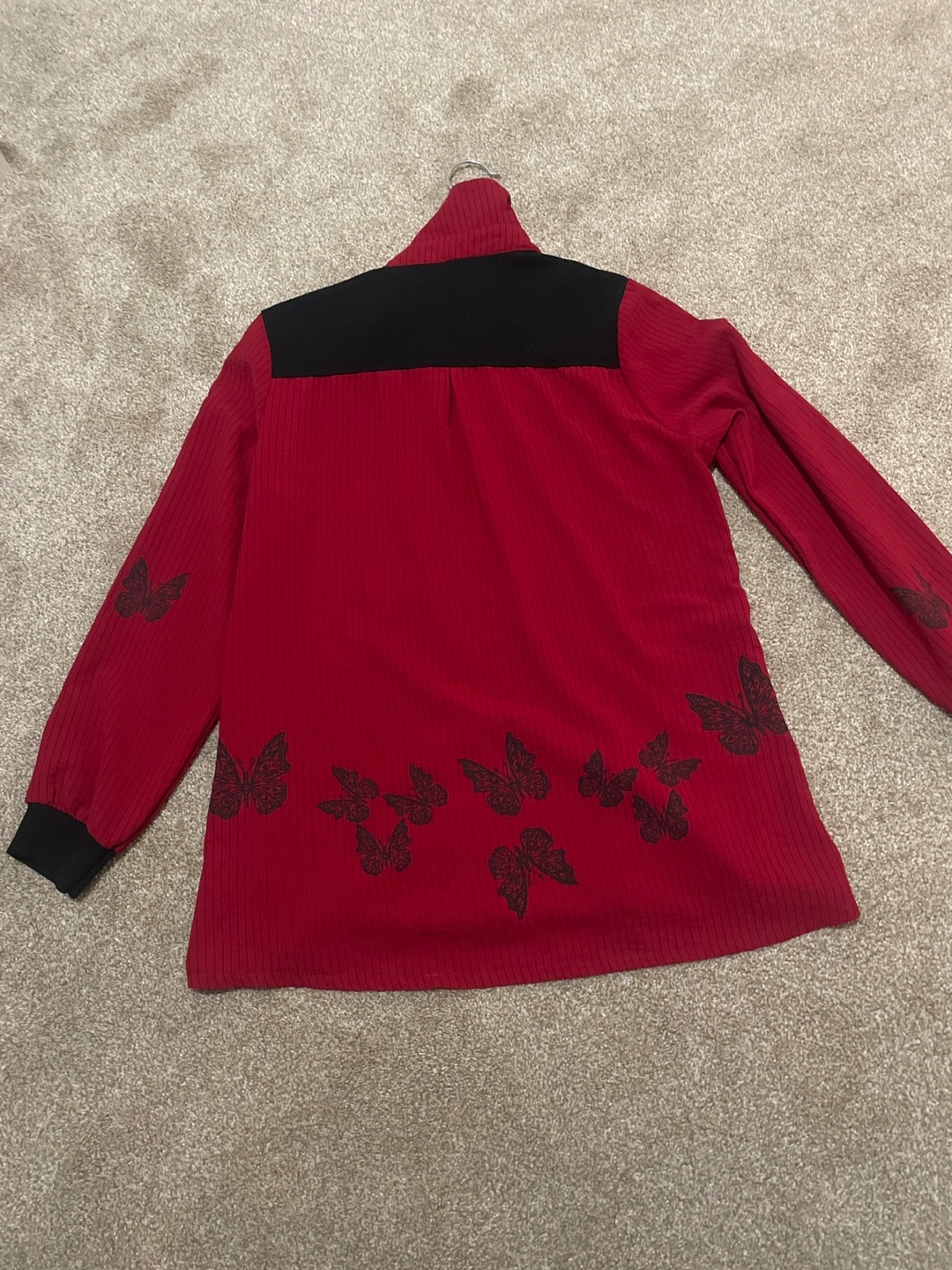 This is a unique top with a layered look, featuring a vibrant red base and a contrasting black vest-like overlay. It has long sleeves and a distinctive high collar design. The sleeves and back are decorated with butterfly patterns, adding a touch of whimsy to the overall style