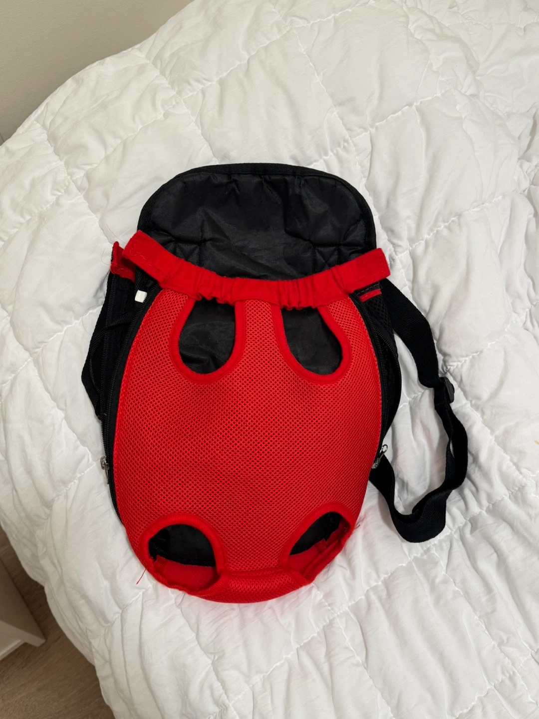 65Selling a pet carrier backpack in red and black! It's perfect for carrying your furry friend on adventures. It appears to be in great shape and ready for a new home! Ideal for puppies & small dogs