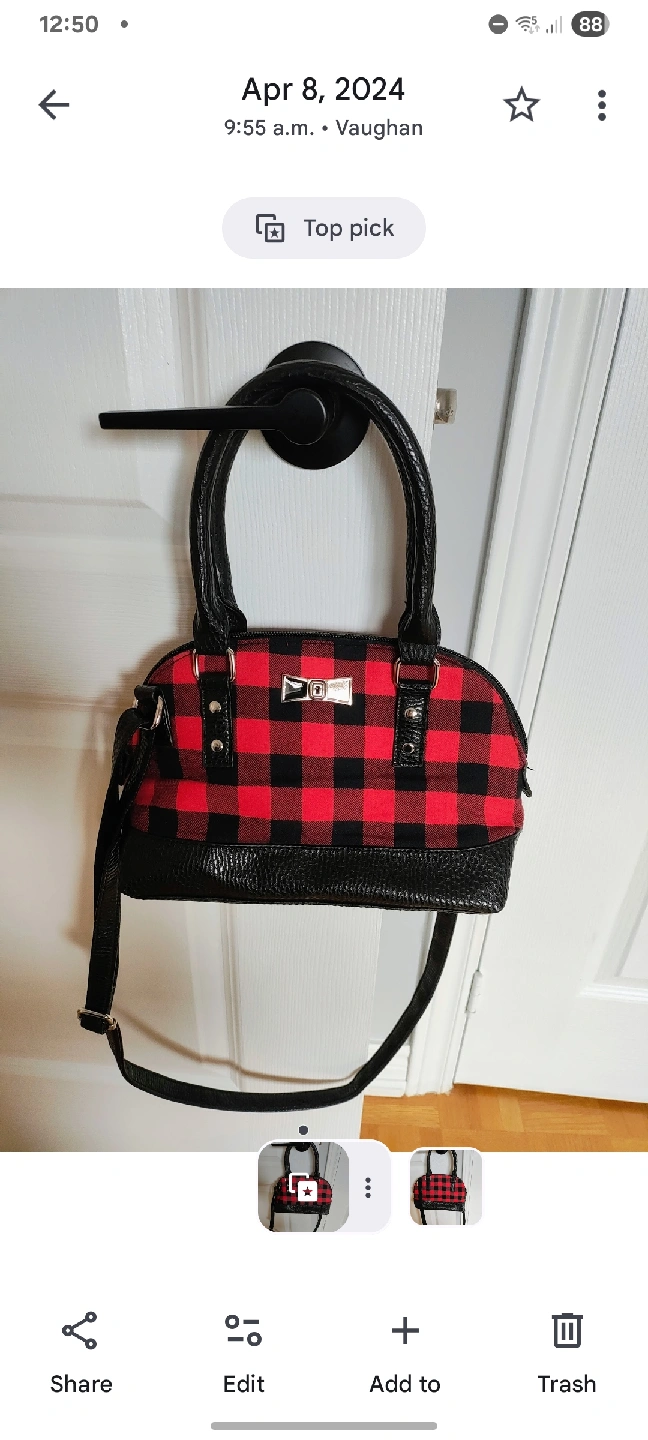 Cute dome-shaped purse with a red and black plaid pattern! It has black handles and a detachable shoulder strap for versatility. Perfect for adding a pop of colour to your outfit!
