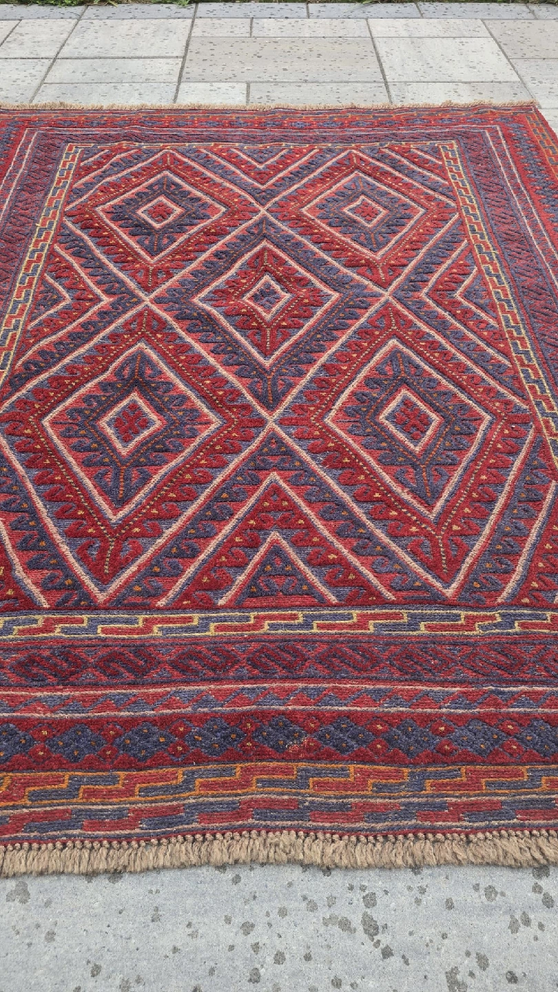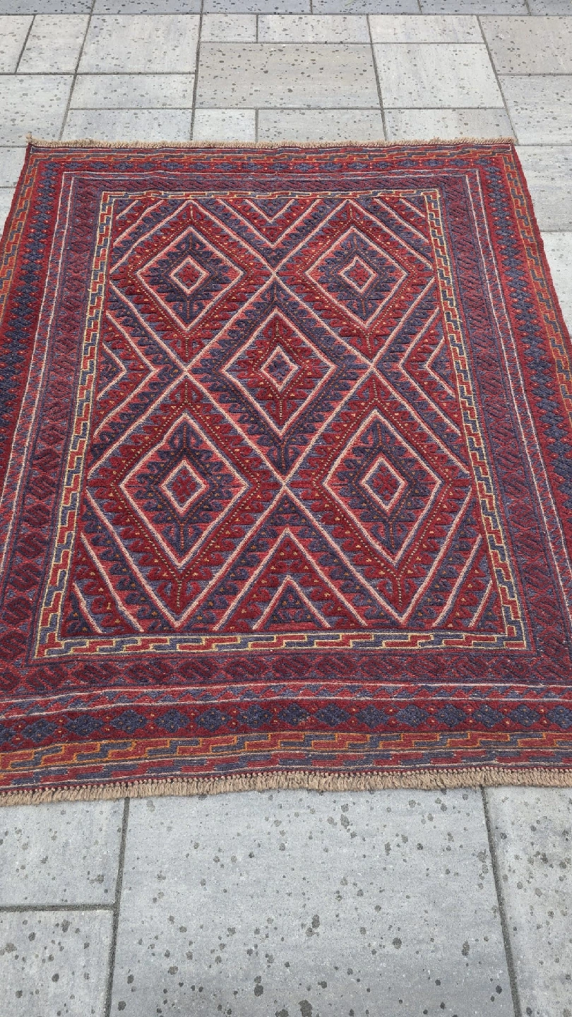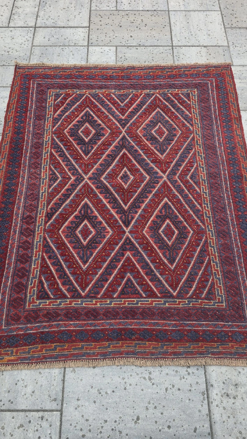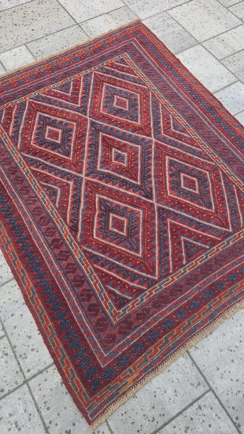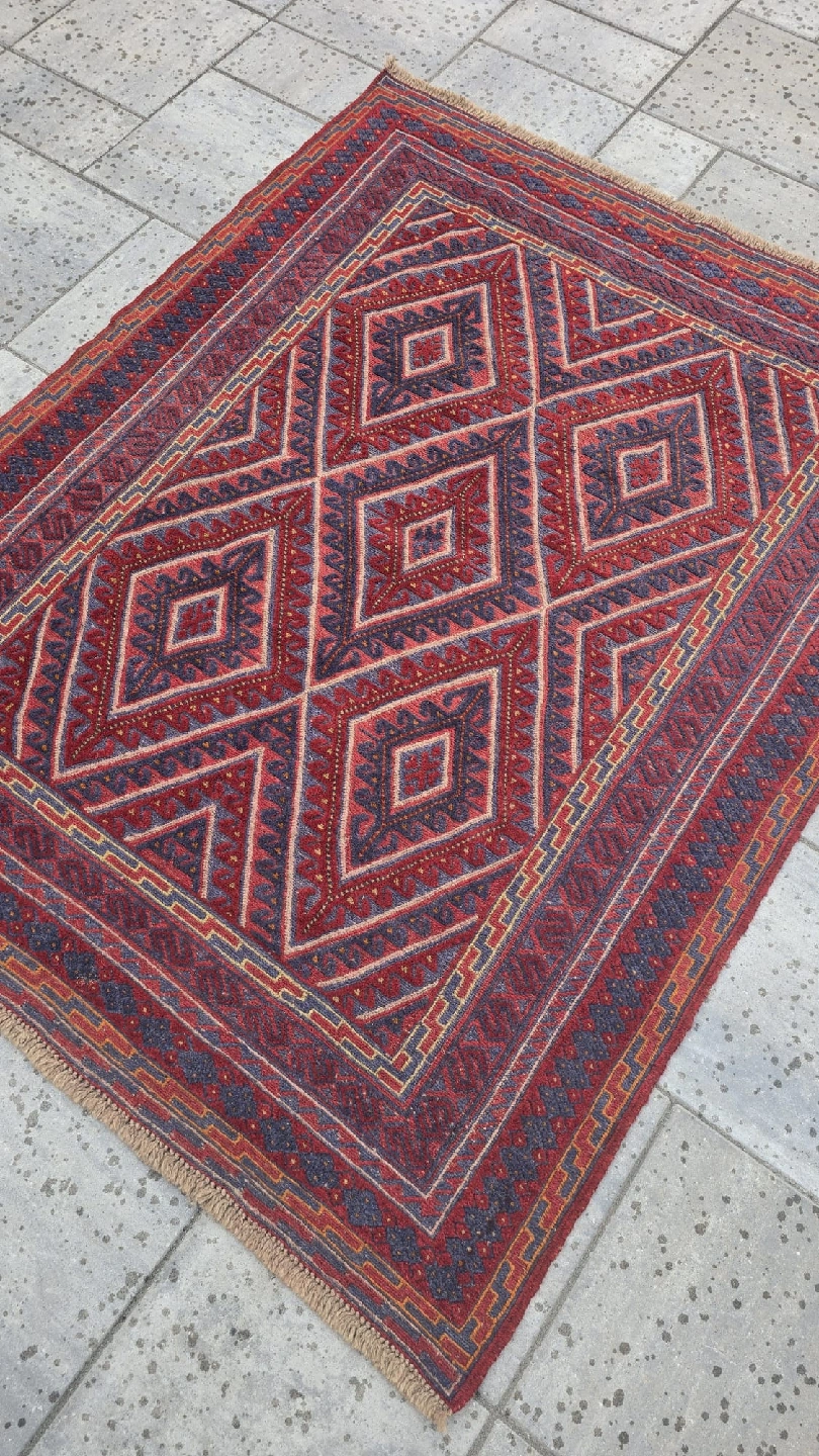 This is a beautiful area rug with a red and blue geometric pattern. It would look great in a living room, bedroom, or office space. The rug is in good condition and has a unique design.