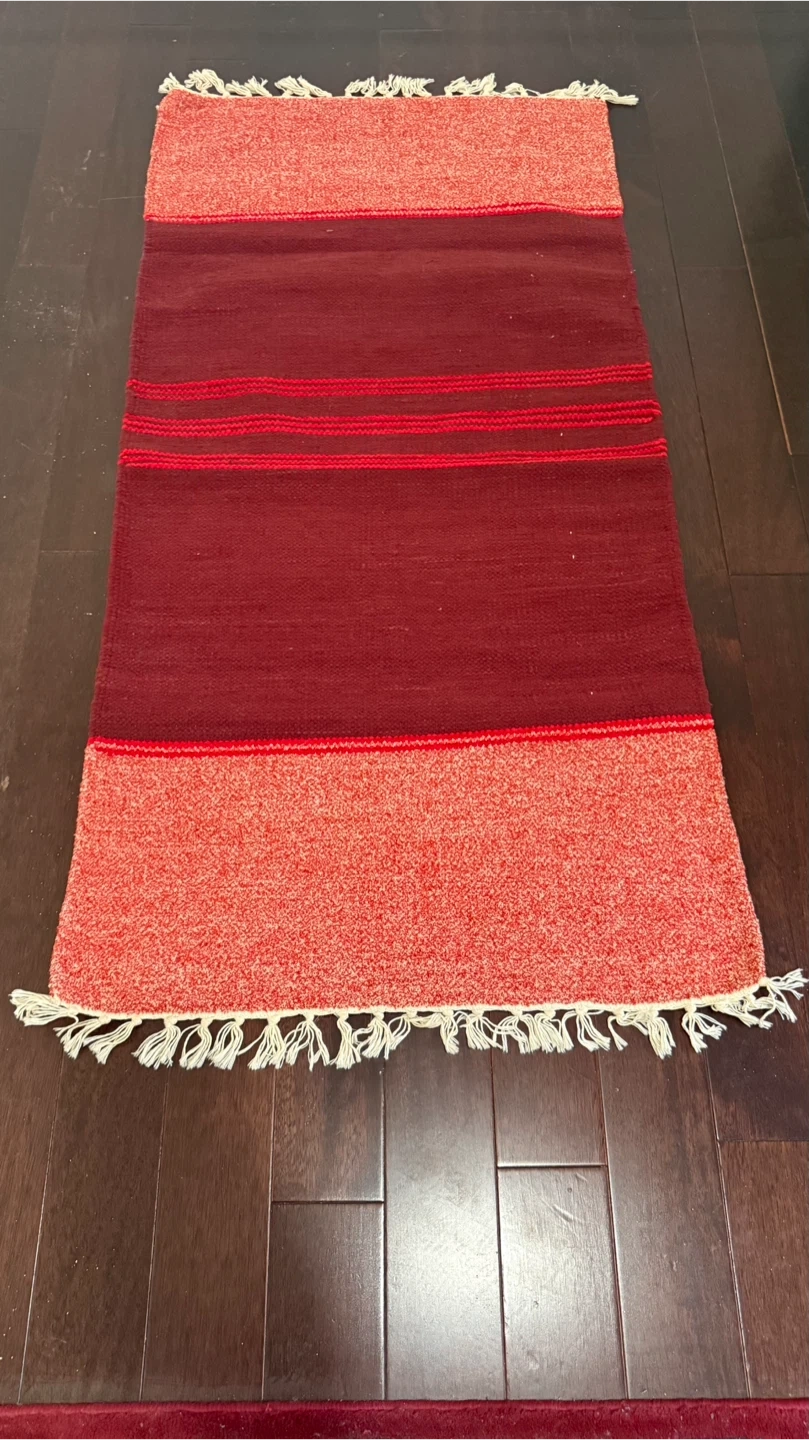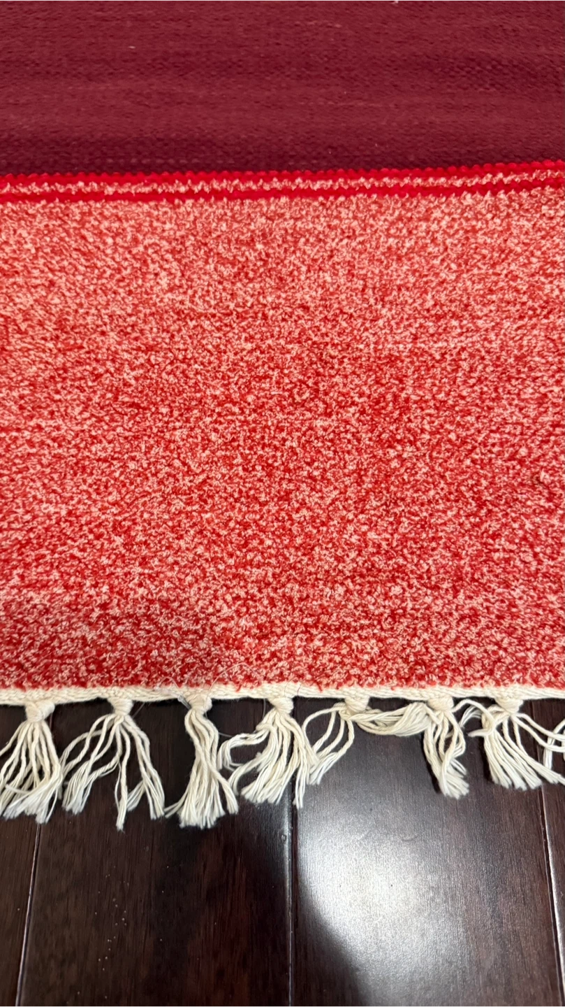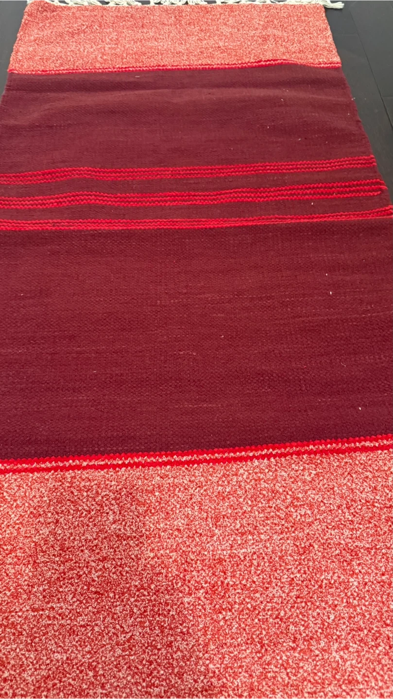 37Selling a lovely rug featuring a mix of red and burgundy tones. It has a unique texture and charming tassels. Perfect for adding a warm touch to any room