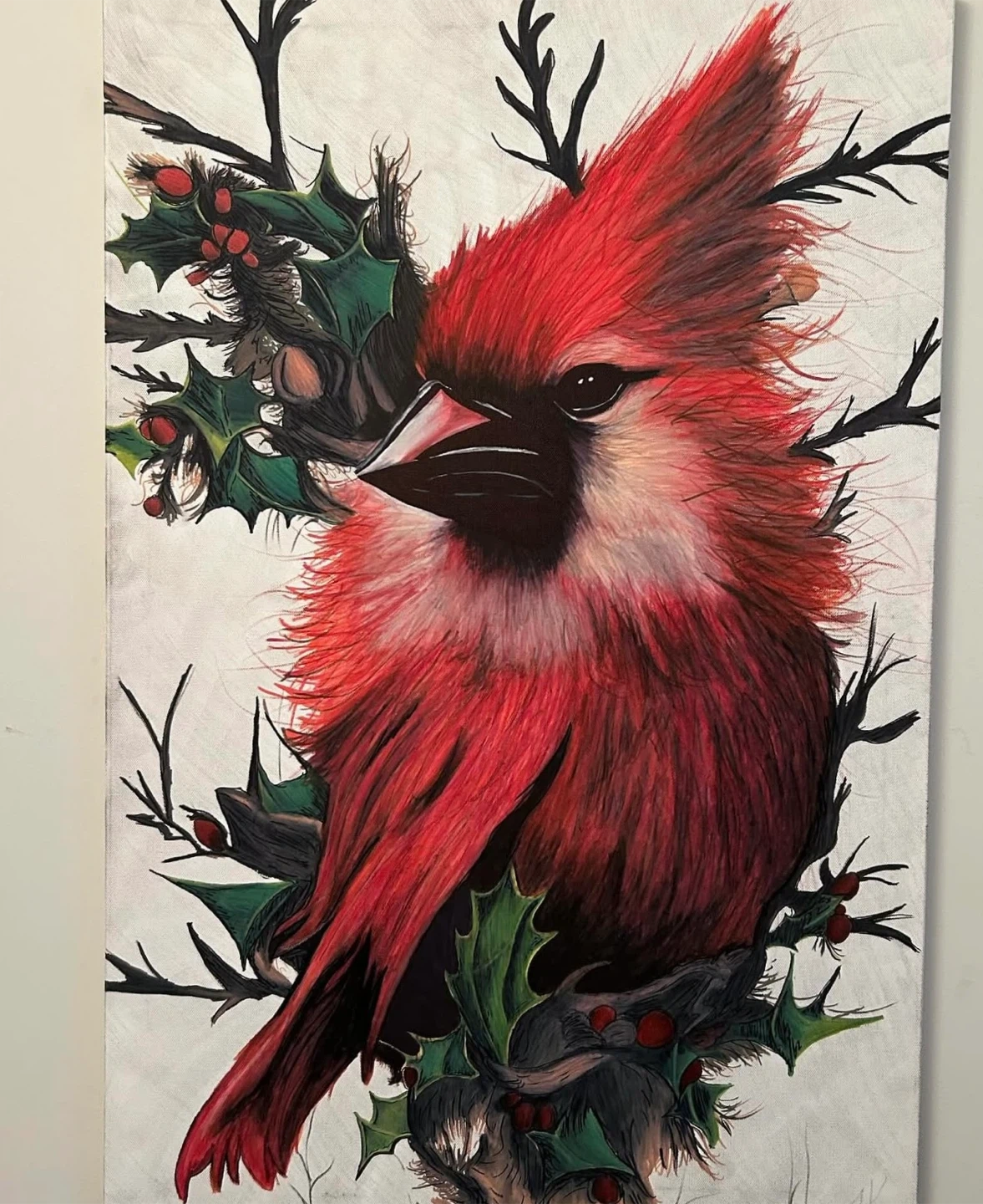 65A vibrant cardinal with striking red plumage is perched on a branch adorned with holly leaves and berries. The birds feathers appear soft and detailed against the stark, bare branches.