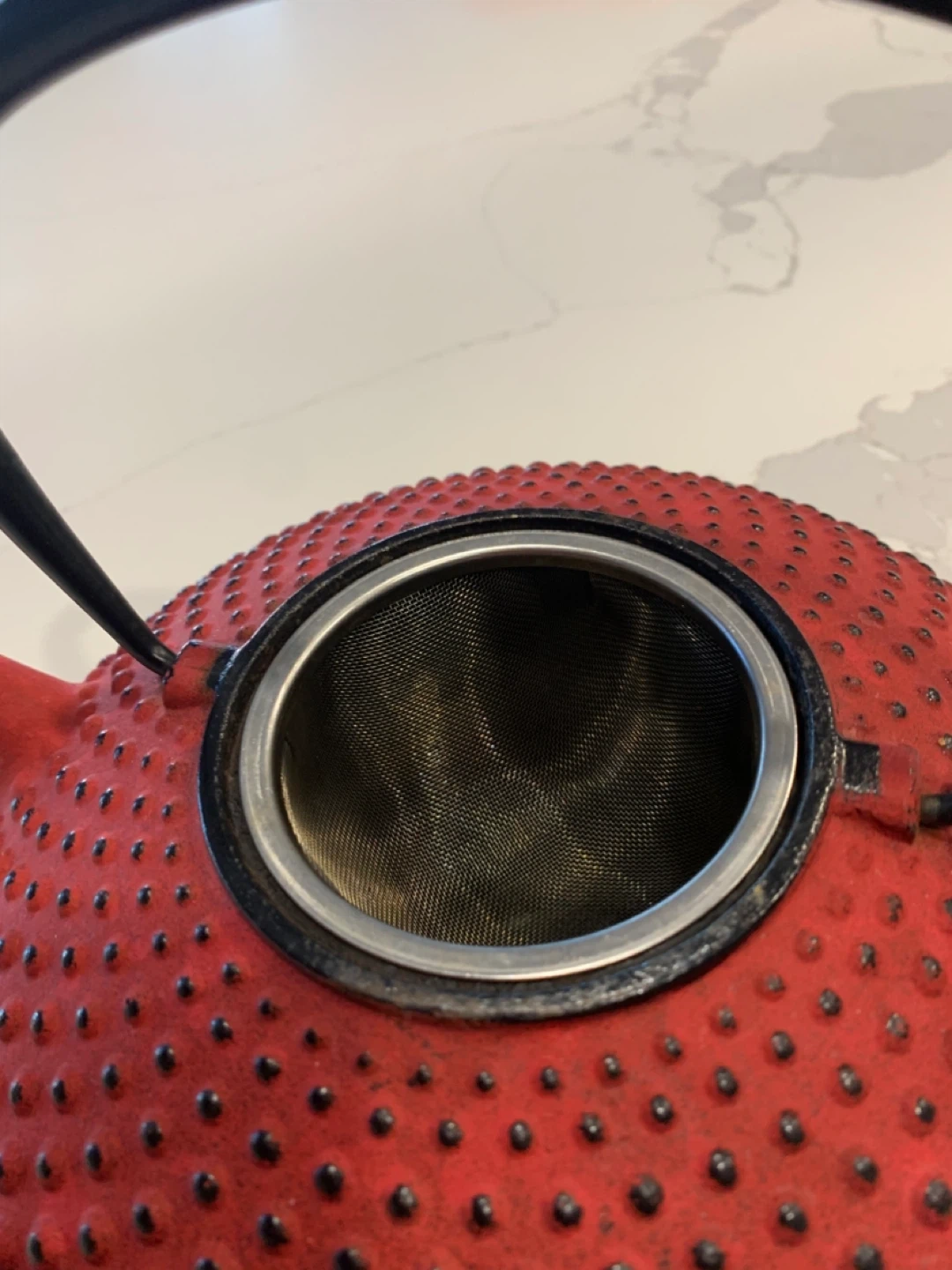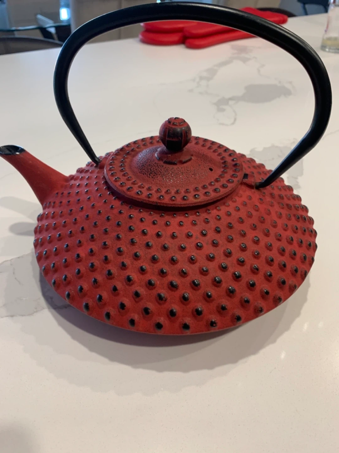 Selling a red cast iron teapot! It's in great condition and ready for your favourite loose leaf teas. It has a built-in infuser basket, perfect for brewing a single cup or a whole pot