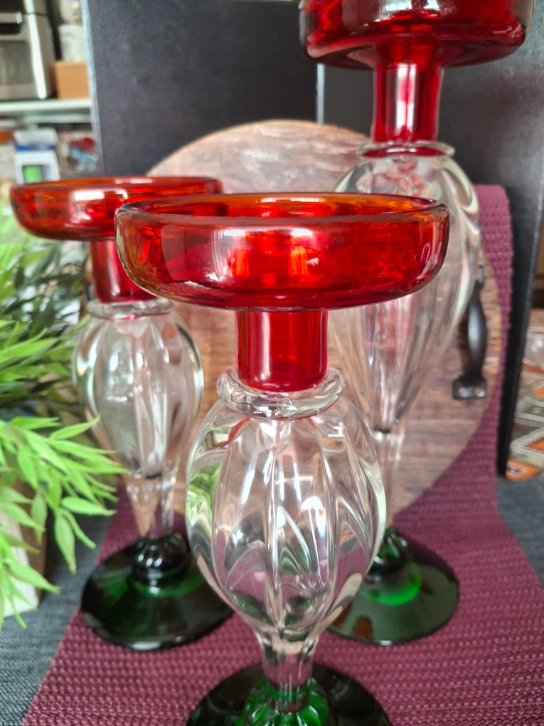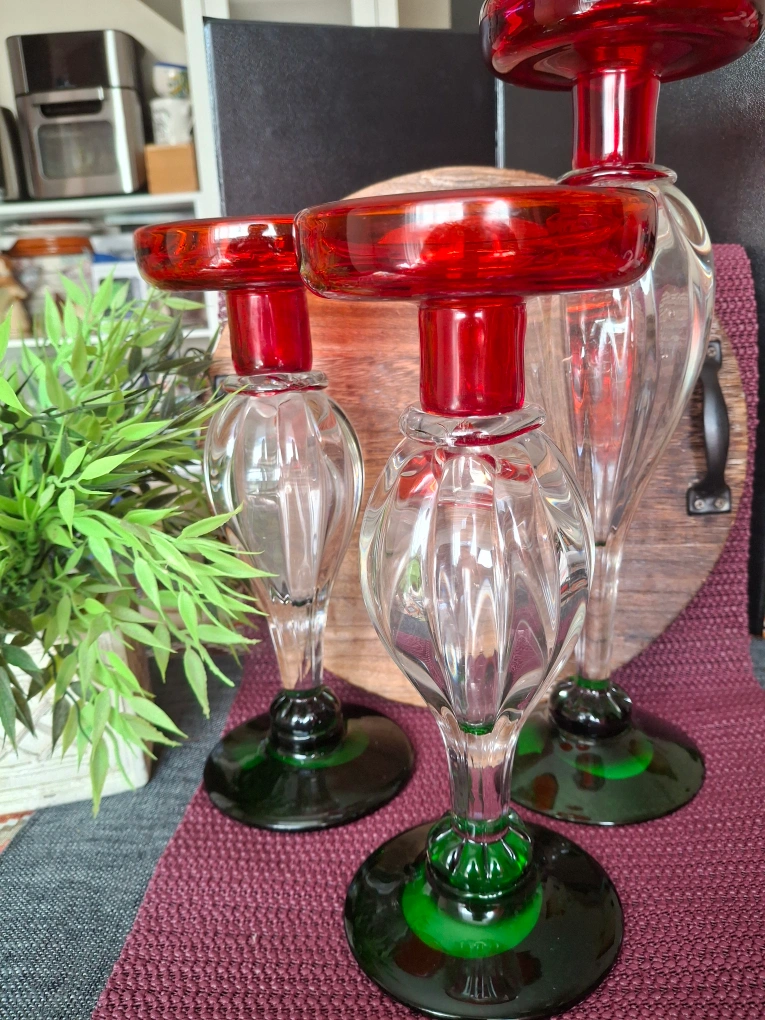 Selling a set of three unique candle holders! They feature a red top, clear glass body, and a green base. They're perfect for adding a pop of colour and a touch of elegance to any room