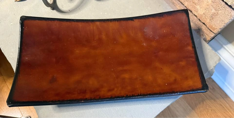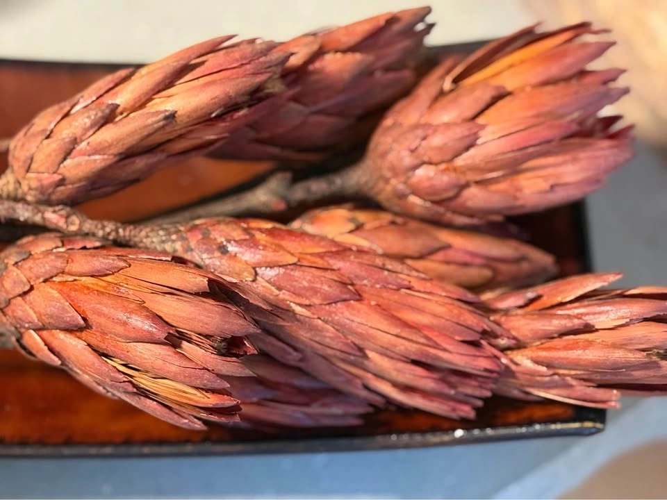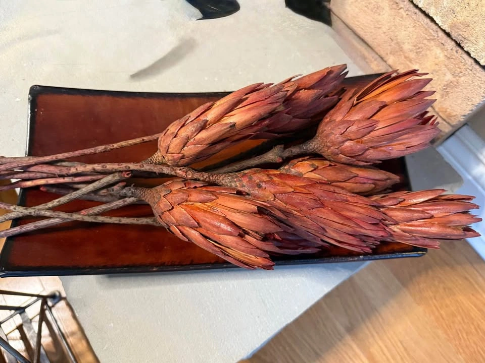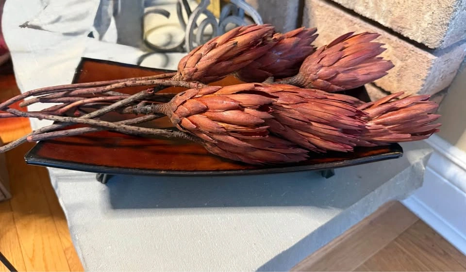 LOCATION: Pickering, Whites & Kingston Rd area. Pick-up only. Smoke-free home. Red Curved Metal Tray w/ Dried Protea Flowers 10 x dried Protea flowers Tray Dimensions: 13’ L 7’ W 3’ H