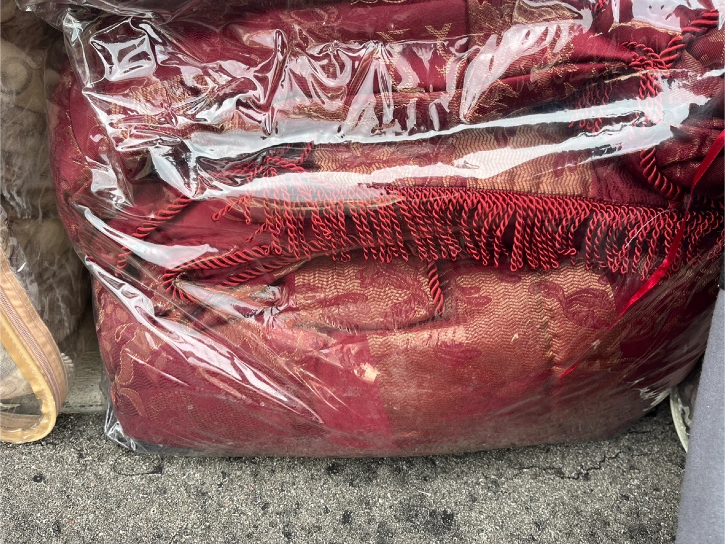 Selling a decorative throw blanket in a rich red colour. It features a detailed pattern and stylish tassels. Perfect for adding a touch of elegance to your living space!